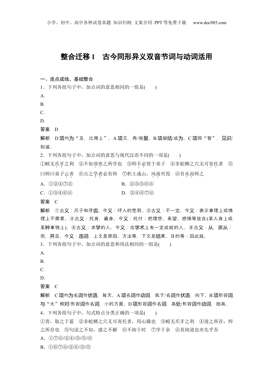 小学、初中、高中各种试卷真题知识归纳文案合同PPT等免费下载www.doc985.com整合迁移1古今同形异义双音节词与动词活用一、连点成线,基础整合1.下列各组句子中,加点词的意思相同的一组是()A.B.C.D.答案D解析D均项为“及,比得上”。A又,再项/恢。复B凝项结/成。为C同项“智”,见识/知道。2.下列各组句子中,加点词的意思与现代汉语不同的一项是()①蚓无爪牙之利②不如须臾之所学也③师不必贤于弟子④非蛇鳝之穴无可寄托者⑤曰师曰弟子云者⑥古之学者必有师⑦积土成山,风雨兴焉⑧吾从而师之A.①②④⑦⑧B.②③⑤⑥⑧C.①③④⑥⑧D.②④⑥⑦⑧答案C解析①古:爪子和牙。今:坏人的党羽。义齿义③古:不一定。今:表示事理上或情义义理上不需要。④古:托身,藏身。今:托付;把理想、希望、感情等放在义义(某人身上或某事物上种)。⑥古:求的人。今:在上有一定成就的人。义学义学术⑧古:,跟;义从从而,且。今:,上文是原因、方法等,下文是果、目的等;因此就。并义连词结3.下列各组句子中,加点词的意思和用法相同的一组是()A.B.C.D.答案C解析C均名作,每天。项为词状语A名作,低于项词动词/名作,向下。词状语B形容项词,与“大”相对/形容作名,小的方面。词词D形容作名,高项词词处/形容作,抬高。词动词4.下列各组句子中,句式特点分类正确的一项是()①青,取之于蓝②非蛇鳝之穴无可寄托者,用心躁也③蚓无爪牙之利④道之所存,师之所存也⑤句读之不知,惑之不解⑥不拘于时⑦学于余⑧其闻道也亦先乎吾A.①⑦⑧/②④/③/⑤/⑥B.①⑥⑦⑧/②④/③/⑤小学、初中、高中各种试卷真题知识归纳文案合同PPT等免费下载www.doc985.comC.①⑥/②④/③⑤/⑧/⑦D.①⑦⑧/②④/③⑤/⑥答案A解析①⑦⑧后置句,为状语②④判句,为断③定后置句,为语⑤前置句,为宾语⑥被为动句。二、连点成线,微点突破1.古今同形异义双音节词从大范围来看,古代汉语中存在而现代汉语中仍保留的词语都可看作古今同形词。其中包括单音节词,如“山”,也包括双音节词,如“成立”;既有实词,也有虚词。这里主要谈双音节实词,大致有以下两种情况:①同形同义。如“逦迤”“戏弄”等。这不是高考考查的重点。②同形异义。看起来与现代双音节词完全一样,但它是两个词。这种现象在古代汉语中普遍存在,因而这部分词语是高考考查的重点。(1)指出下列句子中的古今同形异义双音节词,并解释其义,体会其特点。①古之学者必有师(《师说》):__________________________________________________②吾从而师之(《师说》):______________________________________________________③蚓无爪牙之利(《劝学》):____________________________________________________④非蛇鳝之穴无可寄托者(《劝学》):____________________________________________⑤才能不及中人(《过秦论》):__________________________________________________⑥以致天下之士(《过秦论》):__________________________________________________⑦山东豪俊遂并起而亡秦族矣(《过秦论》):______________________________________⑧备他盗之出入与非常也(《鸿门宴》):__________________________________________⑨后之览者,亦将有感于斯文(《兰亭集序》):____________________________________⑩颜色憔悴,形容枯槁(《屈原列传》):__________________________________________答案①学者,求学的人②从而,跟从并且③爪牙,爪子和牙齿④寄托,托身、藏身⑤中人,平常的人⑥以致,来招引⑦山东,崤山以东⑧非常,意外的变故⑨斯文,这些诗文⑩颜色,脸色、面容;形容,外貌、模样(1)知判:古代以音主,很少有音,因此在翻中,识断汉语单节词语为双节词语阅读译遇到代同形的音,往往要其拆成音理解翻。例如:与现汉语双节词语将两个单节实词来译《忌王》中邹讽齐纳谏“今地方千里齐”的“地方”就是,需翻两个词语译为“土地方圆”。(2)境判:根据上下文境判古今。例如:《情表》中语断语来断异义词陈“九不行岁”的“不行”一,由境可知其意思词语为“不走路会”,代中的常用与现汉语义项“不可以,不被允许”不同。(3)停...