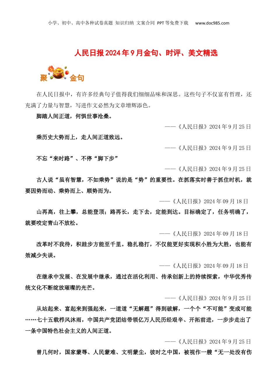 小学、初中、高中各种试卷真题知识归纳文案合同PPT等免费下载www.doc985.com人民日报2024年9月金句、时评、美文精选聚金句在人民日报中,有许多经典句子值得我们细细品味和深思。这些句子不仅富有哲理,还充满了力量与智慧,写进作文必然为文章增辉添色。脚踏人间正道,何惧世事沧桑。——《人民日报》2024年9月25日乘历史大势而上,走人间正道致远。——《人民日报》2024年9月25日不忘“来时路”、不停“脚下步”——《人民日报》2024年9月25日古人说“虽有智慧,不如乘势”说的是“势”的重要性。在抓落实时善于抓住时机,就要因势而动、乘势而上、顺势而为。——《人民日报》2024年09月18日山再高,往上攀,总能登顶;路再长,走下去,定能到达。目标确定了,任务明确了,就要咬定青山不放松。——《人民日报》2024年09月18日改革时不我待,积跬步方能至千里。稳扎稳打,不仅能更好实现积小胜为大胜,也能有效减少失误。——《人民日报》2024年09月18日在继承中发展、在发展中继承,通过在活化利用、传承创新上的持续探索,中华优秀传统文化不断绽放璀璨的光芒。——《人民日报》2024年9月25日从站起来、富起来到强起来,一道道“无解题”得到破解,一个个“不可能”变成可能……七十五载栉风沐雨,中国共产党团结带领亿万人民历经艰辛、开拓前进,一步步走出了一条中国特色社会主义的人间正道。——《人民日报》2024年9月25日曾几何时,国家蒙辱、人民蒙难、文明蒙尘,彼时之中国,被视作一艘“无一处没有伤小学、初中、高中各种试卷真题知识归纳文案合同PPT等免费下载www.doc985.com痕”的破船;曾几何时,仁人志士奔走呐喊,太平天国运动、戊戌变法、义和团运动、辛亥革命接连而起,各种救国方案轮番出台,却“诸路皆走不通了”。——《人民日报》2024年9月25日从历史深处奔涌而来,向民族复兴澎湃而去,改革开放只有进行时、没有完成时,正在续写“时代新篇”。——《人民日报》2024年9月25日前进道路上,锚定总目标,紧扣推进中国式现代化,葆有“犯其至难而图其至远”的劲头,激扬“越是艰险越向前”的精气神,写好改革的“时代新篇”,定能让“中国之制”持续锻造新优势,让“中国之治”不断开启新境界。——《人民日报》2024年9月25日知险而上的背后是至真至诚的善良、奋不顾身的勇敢。这些平凡英雄,用行动书写着人间大爱,彰显了高尚精神品格的力量。这种力量既根植于中华优秀传统文化的沃土,也是长期以来公民道德建设成果的生动体现。——《人民日报》2024年9月25日崇尚英雄才会产生英雄,争做英雄才能英雄辈出。——《人民日报》2024年9月25日从每季度发布“中国好人榜”、选出“见义勇为好人”,到开展全国见义勇为英雄模范评选表彰活动,一次次正义之举被看见,一簇簇道德之光在汇聚,全社会激荡起浩然正气,崇德向善的文明风尚愈发浓厚。——《人民日报》2024年9月25日一砖一石,铭刻着历史和沧桑;蜿蜒万里,诉说着光辉和荣耀。长城,是中华民族勤劳与智慧的结晶,成为中华民族的精神象征。——《人民日报》2024年9月25日从黄大年到黄大年式教师团队,无数教师在中国大地上延续着心有大我、至诚报国的爱国情怀,教书育人、敢为人先的敬业精神,淡泊名利、甘于奉献的高尚情操。——《人民日报》2024年9月25日75年来,中国共产党团结带领全国各族人民,自强不息,探索奋进,谱写了中华民族从一穷二白到走向伟大复兴的壮丽史诗,开辟了中华民族从积贫积弱到站起来、富起来、强起来的历史新天地。小学、初中、高中各种试卷真题知识归纳文案合同PPT等免费下载www.doc985.com——《人民日报》2024年9月25日只有让吃苦者不吃亏、流汗者不流泪、担当者不担忧,才能激励广大干部心无旁骛、义无反顾地撸起袖子加油干。——《人民日报》2024年9月25日为大胆创新的“闯将”松绑,为锐意进取的“先锋”护航,为攻坚克难的“勇士”铺路,更好激发干部敢闯敢为的积极性、主动性、创造性。——《人民日报》2024年9月25日时间是最客观的见证者,也是最伟大的书写者。——《人民日报》2024年9月25日沧海横流显砥柱,万山磅礴看主峰。——《人民日报》2024年9月25日山雄有脊,房固...