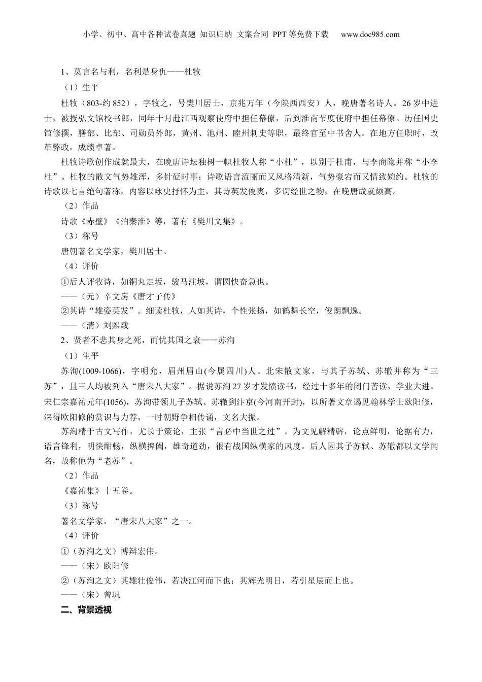 小学、初中、高中各种试卷真题知识归纳文案合同PPT等免费下载www.doc985.com第06讲必修下《六国论》《阿房宫赋》一轮复习目录01考情分析·备考策略...............................................................................................................................................202知识导图·思维引航...............................................................................................................................................303考点突破·考法探究...............................................................................................................................................404热考题型·解题策略...............................................................................................................................................405真题感悟·命题洞见...............................................................................................................................................5学习目标:1.语言建构与运用:细读课文,理清作者论述的观点及思路,掌握语言运用规律,提升发展思维和智慧。2.思维发展与提升:鉴赏《六国论》论证结构,对比《阿房宫赋》的行文结构,学习杜牧借古讽今,苏洵以史为鉴,以天下为己任的家国情怀,与古人思想的火花碰撞,将自己思维的火把点亮。3.审美鉴赏与创造:朗读课文,感受“赋”和“论”的文体特点,倾听古代仁人“以天下为己任”的理性之声。4.文化传承与理解:思考作者撰文反思历史的现实针对性,借鉴古人,告诫当世,将古人的智慧薪火相传。知辞赋晓史论一、知人论世守城之难,敢于犯颜直谏者谓谁;不避众议汹汹,坚持变法者又谓谁,听,历史之声穿越时空,如惊雷醒世,忧国忧民之声,如钟鼓鸣人。当唐太宗陶醉在“贞观之治”的美梦中的时候,魏征说要“居安思危,戒奢以俭”,当绝大多数天下人包括司马光这样的大人物也在竭力反对变法的时候,王安石不愿“守前所为”,“欲出力助上以抗之”,这时我们又听到了这种声音......这是一种理性的声音《阿房宫赋》是一篇“赋”,赋的文体特点和作用,诚如《文心雕龙》里所说“铺采摛文,体物写志”。苏洵撰写《六国论》,意欲借题发挥,以古喻今,以警示宋仁宗,自然首先要把道理阐述充分,这就要求必须严密论证,强化说理,采用史论的文体形式。两位文士用不同的文体形式谈到了六国灭亡的原因,他们谁的理论更合理,下面我们各抒己见,悟思想明士德。作者名片小学、初中、高中各种试卷真题知识归纳文案合同PPT等免费下载www.doc985.com1、莫言名与利,名利是身仇——杜牧(1)生平杜牧(803-约852),字牧之,号樊川居士,京兆万年(今陕西西安)人,晚唐著名诗人。26岁中进士,被授弘文馆校书郎,同年十月赴江西观察使府中担任幕僚,后到淮南节度使府中担任幕僚。历任国史馆修撰,膳部、比部、司勋员外郎,黄州、池州、睦州刺史等职,最终官至中书舍人。在地方任职时,改革弊政,成绩卓著。杜牧诗歌创作成就最大,在晚唐诗坛独树一帜杜牧人称“小杜”,以别于杜甫,与李商隐并称“小李杜”。杜牧的散文气势雄浑,多针砭时事;诗歌语言流丽而又风格清新,气势豪宕而又情致婉约。杜牧的诗歌以七言绝句著称,内容以咏史抒怀为主,其诗英发俊爽,多切经世之物,在晚唐成就颇高。(2)作品诗歌《赤壁》《泊秦淮》等,著有《樊川文集》。(3)称号唐朝著名文学家,樊川居士。(4)评价①后人评牧诗,如铜丸走坂,骏马注坡,谓圆快奋急也。——(元)辛文房《唐才子传》②其诗“雄姿英发”。细读杜牧,人如其诗,个性张扬,如鹤舞长空,俊朗飘逸。——(清)刘熙载2、贤者不悲其身之死,而忧其国之衰——苏洵(1)生平苏洵(1009-1066),字明允,眉州眉山(今属四川)人。北宋散文家,与其子苏轼、苏辙并称为“三苏”,且三人均被列入“唐宋八大家”。据说苏洵27岁才发愤读书,经过十多年的闭门苦读,学业大进。宋仁宗嘉祐元年(1056),苏洵带领儿子苏轼、苏辙到汴京(今河南开封)...