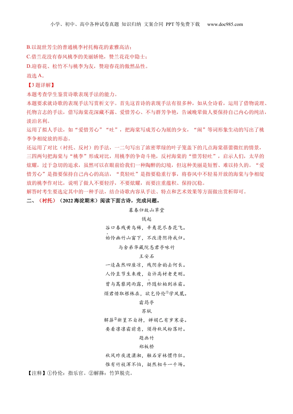小学、初中、高中各种试卷真题知识归纳文案合同PPT等免费下载www.doc985.com综合测试08表达技巧专训(古诗鉴赏)时间:120分钟,每大题12分姓名__________得分________一、(拟人+托物言志+对比)(2021平谷期末)阅读下面古诗,完成问题。同儿辈赋未开海棠(其一)金·元好问枝间新绿一重重,小蕾深藏数点红。爱惜芳心莫轻吐,且教桃李闹春风。1.对本诗的理解与赏析,不正确的一项是()A.首句尽写海棠树的枝繁叶茂生机勃勃。、B.第二句写海棠花蕾娇小鲜嫩,惹人喜爱。C.全诗用语平易,意味醇厚,耐人咀嚼。D.诗人与儿女共作此诗,饱含告诫之意。2.与“且教桃李闹春风”中的“桃李”情感态度不一致的一项是()A.令公桃李满天下,何用堂前更种花。(唐·白居易《奉和令公绿野堂种花》)B.冰雪林中著此身,不同桃李混芳尘。(元·王冕《白梅》)C.生无桃李春风面,名在山林处士家。(宋·杨万里《兰花》)D.幸与松筠相近栽,不随桃李一时开。(唐·白居易《代迎春花招刘郎中》)3.本诗运用了多种表现手法,请任选一种写一段鉴赏文字。【答案】1.D2.A1.示例:本诗运用对比的手法,将海棠与桃李做对比。当那嫩绿的叶片重重叠起的时候,海棠花的花蕾才刚刚绽裂花萼,露出花瓣的点点鲜红,深藏在浓密的绿叶之中,并不起眼,不像桃花、李花那样,在春天争相开放,吸引人们的眼球。不仅表现了海棠的天然之美,更赋予海棠一种沉稳独立的品格,赞美海棠洁身自爱,甘于清静的品性。【解析】【1题详解】本题考查鉴赏诗歌的形象、表达技巧和情感的能力。D.“共作此诗,饱含告诫之意”理解有误,诗人在本诗中借海棠花咏物言志,兼说理教育后辈。写海棠花深藏不露、爱惜芳心、不与群芳争艳,告诫晚辈做人要保持自己内心的纯洁,淡泊名利。“共作此诗”不含告诫之意。故选D。【2题详解】本题考查学生评价诗歌思想内容和情感的能力。“且教桃李闹春风”中用争芳斗艳的“桃李”衬托无意争春,谦虚的海棠。A.桃李代学生,借桃李满天下赞美教师芳名远播;小学、初中、高中各种试卷真题知识归纳文案合同PPT等免费下载www.doc985.comB.以混世芳尘的普通桃李衬托梅花的素雅高洁;C.借兰花没有春风桃李的美丽娇艳,赞兰花花中隐士;D.迎春花、松竹不与桃李为友,赞迎春花的傲然品性。故选A。【3题详解】本题考查学生鉴赏诗歌表现手法的能力。本题要求就诗歌的表现手法写赏析文字。首先这首诗的表现手法有很多种,如从全诗看,运用了借物说理、托物言志的手法,借写海棠花深藏不露、爱惜芳心、不与群芳争艳,告诫晚辈做人要保持自己内心的纯洁,淡泊名利。运用了拟人手法,如“爱惜芳心”“吐”,把海棠写成芳心为展的少女,“闹”等词形象生动的写出了桃李争相绽放的形态。还运用了对比(衬托、反衬)的手法,一二句写出了浓密翠绿的叶子笼盖下的几点海棠蓓蕾微红的情景,三四两句把海棠与“桃李”形成对比,用桃李的争奇斗艳,反衬海棠的“惜芳轻吐”,启示人们,太早的炫耀,过于急切的追求,虽然可以在眼前给我们一种陶醉的幻境,但这种美丽是短暂、难以持久的。“爱惜芳心”是指要保持自己内心的高洁,“莫轻吐”是指要稳重行事,将春风中不轻易开放的海棠与争相绽放的桃李作对比,说明了做人不要轻浮,不要炫耀,而要注重蕴积、保持沉稳。解答时考生要选定其中的一种手法,结合诗歌内容从手法、特点和艺术效果等方面做出赏析即可。二、(衬托)(2022海淀期末)阅读下面古诗,完成问题。暮春归故山草堂钱起谷口春残黄鸟稀,辛夷花尽杏花飞。始怜幽竹山窗下,不改清阴待我归。与舍弟华藏院忞君亭咏竹王安石一迳森然四座凉,残阴余韵去何长。人怜直节生来瘦,自许高材老更刚。曾与蒿藜同雨露,终随松柏到冰霜。烦君惜取根株在,欲乞伶伦①学凤凰。霜筠亭苏轼解箨②新篁不自持,婵娟已有岁寒姿。要看凛凛霜前意,须待秋风粉落时。题画竹郑板桥秋风昨夜渡潇湘,触石穿林惯作狂。惟有竹枝浑不怕,挺然相斗一千场。【注释】①伶伦:指乐官。②解箨:竹笋脱壳。小学、初中、高中各种试卷真题知识归纳文案合同PPT等免费下载www.doc985.com1.下列对这组诗的理解和赏析,不正确的一项是(3分)A.钱诗以人拟竹,...