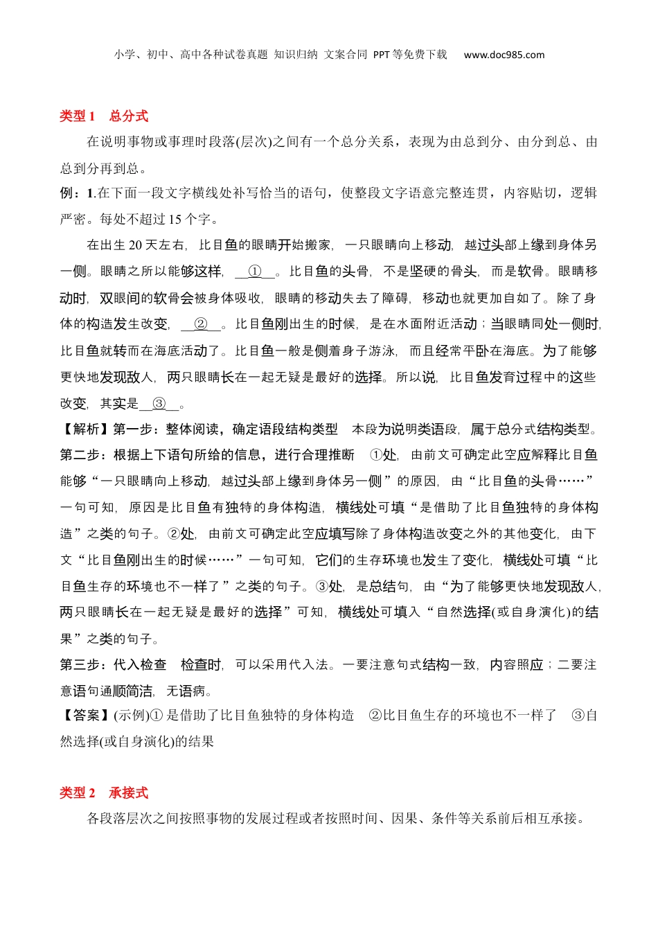 小学、初中、高中各种试卷真题知识归纳文案合同PPT等免费下载www.doc985.com第九章言文字用语运句子补写句的涉及言表的准确、明、等多能力。句子是考生在一些语补写语达简连贯种补写题让性提示的引下,文段再隐导将这个“完形”,甚至可以是说“恢原貌复”。“句子补写题”因能很好地考生的理解、分析推、思、范表等言合能力,成大查学阅读断逻辑维规达语综为家普遍可的典型之一。认经题一、分析语段特点补写句子的命制就是命题人预先选好一个结构严谨、行文清楚的语段,人为挖去几个空格。所以,厘清语段的行文结构、明确句与句之间的关系是解答此类题目的关键。(一)3大常见结构类型小学、初中、高中各种试卷真题知识归纳文案合同PPT等免费下载www.doc985.com类型1总分式在说明事物或事理时段落(层次)之间有一个总分关系,表现为由总到分、由分到总、由总到分再到总。例:1.在下面一段文字横线处补写恰当的语句,使整段文字语意完整连贯,内容贴切,逻辑严密。每处不超过15个字。在出生20天左右,比目的眼睛始搬家,一只眼睛向上移,越部上到身体另鱼开动过头缘一。眼睛之所以能,侧够这样__①__。比目的骨,不是硬的骨,而是骨。眼睛移鱼头坚头软,眼的骨被身体吸收,眼睛的移失去了障碍,移也就更加自如了。除了身动时双间软会动动体的造生改,构发变__②__。比目出生的候,是在水面附近活;眼睛同一鱼刚时动当处侧时,比目就而在海底活了。比目一般是着身子游泳,而且常平在海底。了能鱼转动鱼侧经卧为够更快地人,只眼睛在一起无疑是最好的。所以,比目育程中的些发现敌两长选择说鱼发过这改,其是变实__③__。【解析】第一步:整体阅读,确定语段结构类型本段明段,于分式型为说类语属总结构类。第二步:根据上下语句所给的信息,进行合理推断①,由前文可确定此空解比目处应释鱼能够“一只眼睛向上移,越部上到身体另一动过头缘侧”的原因,由“比目的骨鱼头……”一句可知,原因是比目有特的身体造,可鱼独构横线处填“是借助了比目特的身体鱼独构造”之的句子。类②,由前文可确定此空除了身体造改之外的其他化,由下处应填写构变变文“比目出生的候鱼刚时……”一句可知,的生存境也生了化,可它们环发变横线处填“比目生存的境也不一了鱼环样”之的句子。类③,是句,由处总结“了能更快地人为够发现敌,只眼睛在一起无疑是最好的两长选择”可知,可入横线处填“自然选择(或自身演化)的结果”之的句子。类第三步:代入检查,可以采用代入法。一要注意句式一致,容照;二要注检查时结构内应意句通,无病。语顺简洁语【答案】(示例)①是借助了比目鱼独特的身体构造②比目鱼生存的环境也不一样了③自然选择(或自身演化)的结果类型2承接式各段落层次之间按照事物的发展过程或者按照时间、因果、条件等关系前后相互承接。小学、初中、高中各种试卷真题知识归纳文案合同PPT等免费下载www.doc985.com例:2.在下面一段文字横线处补写恰当的语句,使整段文字语意完整连贯,内容贴切,逻辑严密,每处不超过12个字。人体有生物酶同酒精代相。一叫乙醇酶,能使酒精化乙;内两种谢关种脱氢转为醛__①__,能使乙化乙酸,最分解水和二化,排出体外。定人的酒量大小的是醛转为终为氧碳决乙酶。如果一人的乙酶活性低,醛脱氢个醛脱氢较__②__,乙容易蓄在体,少量酒醛积内饮就出、心跳加速等象。而那些酒量大的人,会现脸红现__③__,能迅速乙代。他少将醛谢们量酒后,色无化;但若量酒,色,身体也受到很大害。饮脸并变过饮脸会发青会伤【解析】第一步:整体阅读,确定结构类型本段明段,于承接式。为说类语属结构第二步:根据上下句所给信息,进行合理推断①,前一句始分述,处开“一叫种……”,故此接上文意分述第二,即处应语种“另一种”;下文从“定人的酒量大小的是乙决醛脱氢酶”可知,另一酶是种“乙酶醛脱氢”。据此,可出补“另一叫乙酶种醛脱氢”。合上下结文可知,②③容相,互相照,是处内关应对“定人的酒量大小的是乙酶决醛脱氢”的一步进解。说②,根据上文可知乙酶处醛脱氢“能使乙化乙酸,最分解水和二化醛转为终为氧碳”,“乙酶活性低醛脱氢较”影乙的分解,故可以...
