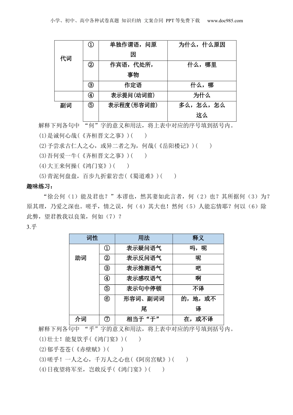 小学、初中、高中各种试卷真题知识归纳文案合同PPT等免费下载www.doc985.com综合测试05高考文言虚词专练(附测试)1.而词性用法释义连词①表示并列关系一般不译,有时译为“又”②表示递进关系并且,而且③表示承接关系就,接着,或不译④表示转折关系但是,却⑤表示假设关系假如,如果⑥表示修饰关系地,着,或不译⑦表示因果关系因而⑧表示目的关系来代词⑨表示第二人称通“尔”,你,你的解释下列各句中“而”字的意义和用法,将上表中对应的序号填到括号内。(1)楚怀王贪而信张仪,遂绝齐(《屈原列传》)()(2)人而无信,不知其可也(《论语》)()(3)臣诚恐见欺于王而负赵(《廉颇蔺相如列传》)()(4)而翁归,自与汝复算耳(《促织》)()(5)籍吏民,封府库,而待将军(《鸿门宴》)()(6)青,取之于蓝,而青于蓝(《劝学》)()(7)剑阁峥嵘而崔嵬,一夫当关,万夫莫开(《蜀道难》)()(8)锲而舍之,朽木不折(《劝学》)()(9)项王按剑而跽曰:“客何为者?”(《鸿门宴》)()趣味练习:兵者,诡道也,须戮力同心。蟹六跪而(1)二螯,非蛇鳝之穴无可寄托者也,而况(2)战乎?故冯婉贞曰:“诸君而(3)有意,瞻予马首可也。”婉贞,而(4)翁豪杰者,然青取之于蓝而(5)青于蓝。婉贞博学而(6)日参省乎己,非特效书生终日而(5)思也。众应之。既而(8),婉贞率诸少年结束而(9)出,果大捷。众皆叹:婉贞,小女子而已(10);其行,乃巾帼英杰而(11)。2.何词性用法释义小学、初中、高中各种试卷真题知识归纳文案合同PPT等免费下载www.doc985.com代词①单独作谓语,问原因为什么,什么原因②作宾语,代处所,事物什么,哪里③作定语什么,哪副词④表示提问(动词前)为什么⑤表示程度(形容词前)多么,怎么,怎么这么解释下列各句中“何”字的意义和用法,将上表中对应的序号填到括号内。(1)是诚何心哉(《齐桓晋文之事》)()(2)予尝求古仁人之心,或异二者之为,何哉(《岳阳楼记》)()(3)吾何爱一牛(《齐桓晋文之事》)()(4)大王来何操(《鸿门宴》)()(5)青泥何盘盘,百步九折萦岩峦(《蜀道难》)()趣味练习:“徐公何(1)能及君也?”本谬也,然其妻如此言者,何(2)也?其所据何(3)为?原其理,乃爱之深也。嗟乎,情之误,何(4)其大也!然何(5)人能忘情耶?何以(6)除此弊,望君教我以良策,何如(7)?3.乎词性用法释义助词①表示疑问语气吗,呢②表示反问语气呢③表示推测语气吧④表示感叹语气啊⑤表示句中停顿不译⑥形容词、副词词尾的,地,或不译介词⑦相当于“于”在,或不译解释下列各句中“乎”字的意义和用法,将上表中对应的序号填到括号内。(1)壮士!能复饮乎(《鸿门宴》)()(2)郁乎苍苍(《赤壁赋》)()(3)嗟乎!一人之心,千万人之心也(《阿房宫赋》)()(4)日夜望将军至,岂敢反乎(《鸿门宴》)()小学、初中、高中各种试卷真题知识归纳文案合同PPT等免费下载www.doc985.com(5)圣人之所以为圣,愚人之所以为愚,其皆出于此乎(《师说》)()(6)相与枕藉乎舟中,不知东方之既白(《赤壁赋》)()(7)胡为乎遑遑欲何之(《归去来兮辞并序》)()趣味练习:王之好乐甚,则齐国其庶几乎(1)。然吾曾见一人,其家世代捕蛇,多人死乎(2)是,而操此业不辍,问其故,曰:“可塞赋敛也。”嗟乎(3),赋敛之毒有甚是蛇者乎(4)!而王胡为乎(5)好乐甚?若王专于理事,必恢恢乎(6)而有余,则王之所为其胜乎(7)好乐者也。臣之驽顿,所言者谬,王能谅之乎(8)?4.乃词性用法释义副词①表示承接就,于是②表示结果才③表示出乎意料竟,竟然,却④表示判断是,就是⑤表示递进甚至代词⑥表示第二人称你,你的⑦指示代词这,这样解释下列各句中“乃”字的意义和用法,将上表中对应的序号填到括号内。(1)必以长安君为质,兵乃出(《触龙说赵太后》)()(2)公子于是乃置酒大会宾客(《信陵君窃符救赵》)()(3)夫我乃行也,反而求之,不得吾心(《齐桓晋文之事》)()(4)今其智乃反不能及,其可怪也欤(《师说》)()(5)蒙冲斗舰乃以千数(《赤壁之战》)()(6)尔其无忘乃父之志(《伶官传序》)()(7)嬴乃夷门抱关者也(《信陵君窃符救赵》)()趣味练习:尝闻放翁志节,毕现《示儿》,乃(1)读之。至“王师北定中原日,家...