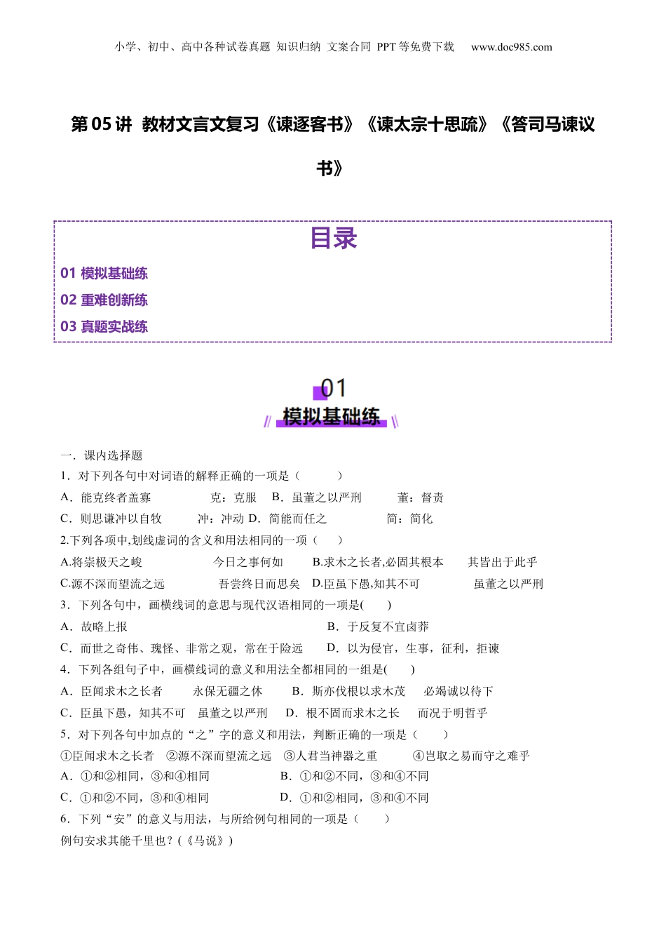 小学、初中、高中各种试卷真题知识归纳文案合同PPT等免费下载www.doc985.com第05讲教材文言文复习《谏逐客书》《谏太宗十思疏》《答司马谏议书》目录01模拟基础练02重难创新练03真题实战练一.课内选择题1.对下列各句中对词语的解释正确的一项是()A.能克终者盖寡克:克服B.虽董之以严刑董:督责C.则思谦冲以自牧冲:冲动D.简能而任之简:简化2.下列各项中,划线虚词的含义和用法相同的一项()A.将崇极天之峻今日之事何如B.求木之长者,必固其根本其皆出于此乎C.源不深而望流之远吾尝终日而思矣D.臣虽下愚,知其不可虽董之以严刑3.下列各句中,画横线词的意思与现代汉语相同的一项是()A.故略上报B.于反复不宜卤莽C.而世之奇伟、瑰怪、非常之观,常在于险远D.以为侵官,生事,征利,拒谏4.下列各组句子中,画横线词的意义和用法全都相同的一组是()A.臣闻求木之长者永保无疆之休B.斯亦伐根以求木茂必竭诚以待下C.臣虽下愚,知其不可虽董之以严刑D.根不固而求木之长而况于明哲乎5.对下列各句中加点的“之”字的意义和用法,判断正确的一项是()①臣闻求木之长者②源不深而望流之远③人君当神器之重④岂取之易而守之难乎A.①和②相同,③和④相同B.①和②不同,③和④不同C.①和②不同,③和④相同D.①和②相同,③和④不同6.下列“安”的意义与用法,与所给例句相同的一项是()例句安求其能千里也?(《马说》)小学、初中、高中各种试卷真题知识归纳文案合同PPT等免费下载www.doc985.comA.思国之安者,必积其德义。(《谏太宗十思疏》)B.不患寡而患不均,不患贫而患不安。(《季氏将伐颛臾》)C.衣食所安,弗敢专也,必以分人。(《曹刿论战》)D.燕雀安知鸿鹄之志哉!(《陈涉世家》)7.下列对文中相关内容的解说,错误的一项是()A.太宗:是中国古代帝王常见的庙号。从汉朝开始,王朝开国皇帝的庙号通常为“太祖”,第二代帝王的庙号常常为“太宗”。B.可畏唯人:可怕的只是人民(的力量)。人,本应写作“民”,因避唐太宗李世民的名讳而写作“人”。C.垂拱:垂衣拱手,古时比喻统治者在治理天下时,什么事情都不愿做,多用作贬斥帝王庸碌无为。D.三驱:据说古代圣贤之君在打猎布网时只设三面而有意网开一面,从而体现圣人的“好生之仁”。8.读课文《谏太宗十思疏》,下列对“十思”理解不当的一项是()A.作者提出,作为帝王,在他计划营造宫殿时,就要想到适可而止,以尽可能减轻百姓负担,使他们安居乐业。B.帝王担负着治理天下的重任,当他产生骄傲自满时,就应想到自己要像江海那样宽广低下,有能容纳百川的胸怀。C.帝王担心自己偏信谗言邪说,就要想到首先端正自身以便除去邪恶,将要施恩奖赏人时,要警惕不因自己的偏爱而赏错。D.帝王喜欢到郊外去打猎,就要想到最多只能去三次。9.对下列各句中加点词的解释,不正确的一项是()A.窃以为与君实游处相好之日久窃:私下B.冀君实或见恕也冀:希望C.重念蒙君实视遇厚视遇:看待D.非特朝廷士大夫而已特:特别10.下列各组句子中,加点词语的意义和用法相同的一组是()A.B.C.D.11.下列各句中,加点词语的意义与现代汉语不同的一项是()A.非特朝廷士大夫而已B.人习于苟且非一日C.辟邪说,难壬人,不为拒谏D.重念蒙君实视遇厚,于反覆不宜卤莽12.下列各项中,加点词的意义与现代汉语相同的一项是A.臣闻求木之长者,必固其根本B.既得志,则纵情以傲物C.傲物则骨肉为行路D.役聪明之耳目,亏无为之大道哉13.下列各句的句式与其他三项不同的一项是()A.某则以谓受命于人主B.议法度而修之于朝廷C.得复见将军于此D.所操之术多异故也小学、初中、高中各种试卷真题知识归纳文案合同PPT等免费下载www.doc985.com14.下列句子中加点词的解释,错误的一项是()A.必固其根本根本:树根B.人君当神器之重当:主持,掌管C.凡百元首,承天景命景:大D.虽董之以严刑董:懂得15.下列句子中与例句句式相同的一项是()例句:虽董之以严刑A.惧满溢,则思江海下百川B.振之以威怒C.人君当神器之重,居域中之大D.斯亦伐根以求木茂,塞源而欲流长者也16.下列句子中不含有通假字的一项是()A.恩所加,则...