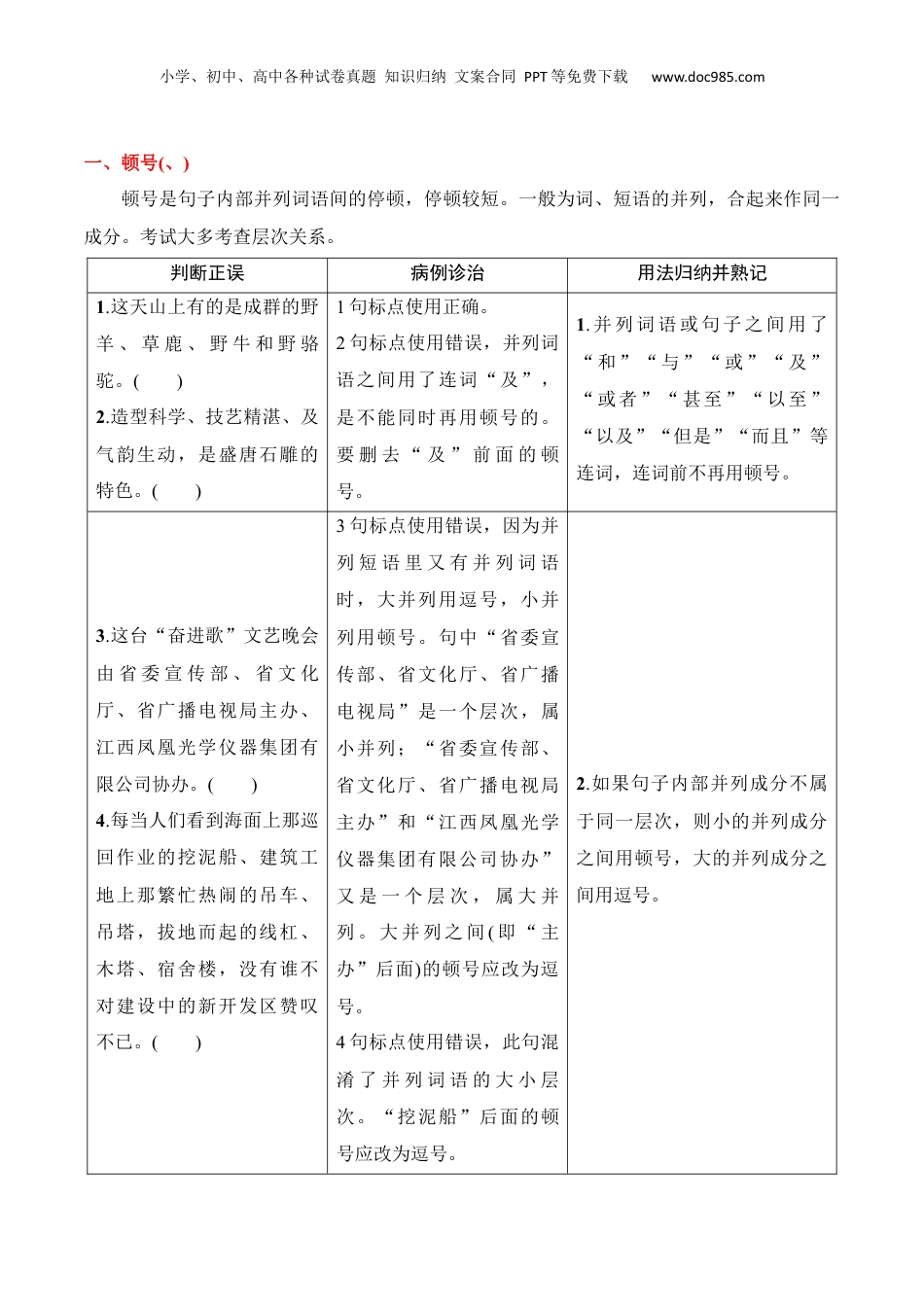 小学、初中、高中各种试卷真题知识归纳文案合同PPT等免费下载www.doc985.com第九章言文字用语运点符标号高考常见标点符号用法七大点号——顿号、逗号、分号、冒号、句号、问号、叹号点号的作用在于点断,主要表示说话时的停顿和语气,是针对句子内部结构层次的。对于点号,要明确点号表示停顿的长短关系:顿号<逗号<分号<冒号<三个句末点号(句号、问号、叹号)。小学、初中、高中各种试卷真题知识归纳文案合同PPT等免费下载www.doc985.com一、顿号(、)顿号是句子内部并列词语间的停顿,停顿较短。一般为词、短语的并列,合起来作同一成分。考试大多考查层次关系。判断正误病例诊治用法归纳并熟记1.这天山上有的是成群的野羊、草鹿、野牛和野骆驼。()2.造型科学、技艺精湛、及气韵生动,是盛唐石雕的特色。()1句标点使用正确。2句标点使用错误,并列词语之间用了连词“及”,是不能同时再用顿号的。要删去“及”前面的顿号。1.并列词语或句子之间用了“和”“与”“或”“及”“或者”“甚至”“以至”“以及”“但是”“而且”等连词,连词前不再用顿号。3.这台“奋进歌”文艺晚会由省委宣传部、省文化厅、省广播电视局主办、江西凤凰光学仪器集团有限公司协办。()4.每当人们看到海面上那巡回作业的挖泥船、建筑工地上那繁忙热闹的吊车、吊塔,拔地而起的线杠、木塔、宿舍楼,没有谁不对建设中的新开发区赞叹不已。()3句标点使用错误,因为并列短语里又有并列词语时,大并列用逗号,小并列用顿号。句中“省委宣传部、省文化厅、省广播电视局”是一个层次,属小并列;“省委宣传部、省文化厅、省广播电视局主办”和“江西凤凰光学仪器集团有限公司协办”又是一个层次,属大并列。大并列之间(即“主办”后面)的顿号应改为逗号。4句标点使用错误,此句混淆了并列词语的大小层次。“挖泥船”后面的顿号应改为逗号。2.如果句子内部并列成分不属于同一层次,则小的并列成分之间用顿号,大的并列成分之间用逗号。小学、初中、高中各种试卷真题知识归纳文案合同PPT等免费下载www.doc985.com5.这对孪生姐妹看上去有十七、八岁,正在读高三,分别在县一中高三四五班上课。()5句标点使用错误,“十七八”是约数,中间不用加顿号;“四、五班”是确数,中间应该加顿号。3.邻近的两个数字连用,表示约数时不用顿号。但是如果是数字省略语,且表示确指,则必须用顿号。6.“中小学”“工农兵”“农林牧”“省市领导”“城乡结合部”等集合性并列词语内部不必使用顿号。()7.近几年,中国政府采取了一系列政策,促进了中、西部的发展。()6句标点使用正确,“中小学”“工农兵”等都是集合性并列短语,中间不用加顿号。7句标点使用错误,“中西部”中间不用顿号顿开。因为集合词语是紧密结构,不能用顿号分隔开来。4.固定的集合性并列词语中间,尤其是一些约定俗成的词语中间,不停顿也不会产生歧义,则不必使用顿号。8.“日”、“月”构成“明”字。()9.《朗读者》、《信·中国》、《阅读·阅美》、《中华好家风》,是我国当前反映社会主义核心价值观的电视节目。()10.办公室里订有《人民日报》(海外版)《光明日报》和《时代周刊》等报刊。()8、9句顿号使用错误,标有引号和书名号的并列成分之间通常不用顿号,故句中的顿号应去掉。10句标点使用错误,《人民日报》和《光明日报》中间有括注,故应在“(海外版)”后加顿号。5.标有引号的并列成分之间、标有书名号的并列成分之间通常不用顿号。若有其他成分插在并列的引号之间或并列的书名号之间(如引语或书名号之后还有括注),宜用顿号。11.总之,语言的社会功能有三点:1.传递信息,交流思想;2.确定关系,调节关系;3.组织生活,组织生11句顿号使用错误,应改用下脚点(外文标点符号)。6.不带括号的阿拉伯数字、拉丁字母或罗马数字做序次语时,后面用下脚点(外文标点符号),而不用顿号。小学、初中、高中各种试卷真题知识归纳文案合同PPT等免费下载www.doc985.com产。()二、逗号(,)逗号表示句子中较小的停顿。比较长的句子或结构比较复杂、句式比较特殊的句子,中间常有停顿,停顿一般用逗号。判断正误病例诊治用法归纳并熟记1.这个演员表上排列在最...