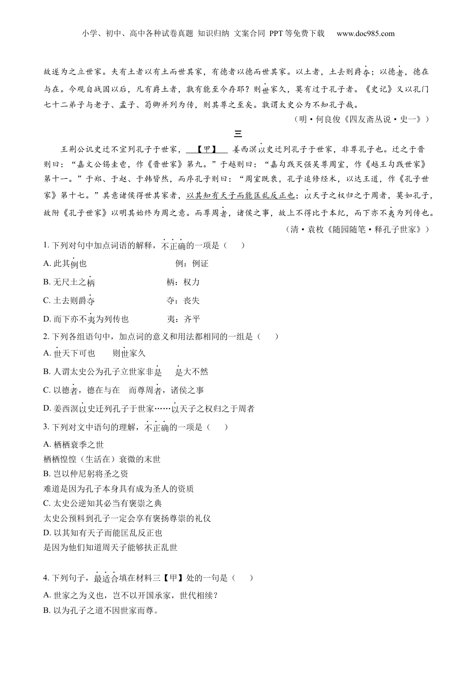 小学、初中、高中各种试卷真题知识归纳文案合同PPT等免费下载www.doc985.com综合测试04说理类各题型专训(文言文阅读)时间:每篇18分钟,每大题18分姓名__________得分________一、(概括观点)(2022海淀二模)阅读下面文言文,完成问题。辨骚刘勰自《风》《雅》寝声,莫或抽绪,奇文郁起,其《离骚》哉!昔汉武爱《骚》,而淮南作《传》,以为《国风》好色而不淫,《小雅》怨诽而不乱。若《离骚》者,可谓兼之。王逸以为诗人提耳,屈原婉顺,《离骚》之文,依经立义。名儒辞赋,莫不拟其仪表,所谓金相玉质,百世无匹者也。及汉宣嗟叹,以为皆合经传。扬雄讽味,亦言体同《诗·雅》。四家举以方经,可谓鉴而弗精,玩而未核者也。将核其论,必征言焉。故其陈尧舜之耿介,称汤禹之祗敬,典诰之体也;讥桀纣之猖披,伤羿浇之颠陨,规讽之旨也;虬龙以喻君子,云蜺以譬谗邪,比兴之义也;每一顾而掩涕,叹君门之九重①,忠怨之辞也;观兹四事,同于《风》《雅》者也。至于托云龙,说迂怪,诡异之辞也;康回倾地②,夷羿毙日,谲怪之谈也;依彭咸③之遗则,从子胥以自适,狷狭之志也;娱酒不废,沉湎日夜,举以为欢,荒淫之意也。摘此四事,异乎经典者也。故论其典诰则如彼,语其夸诞则如此。固知《楚辞》者,体宪于三代,而风杂于战国,乃《雅》《颂》之博徒,而词赋之英杰也。观其骨鲠所树,肌肤所附,虽取熔《经》意,亦自铸伟辞。故《骚经》《九章》,朗丽以哀志;《九歌》《九辩》,绮靡以伤情;《远游》《天问》,瑰诡而惠巧;《招魂》《招隐》,耀艳而深华;《卜居》标放言之致,《渔父》寄独往之才。故能气往轹古,辞来切今,惊采绝艳,难与并能矣。自《九怀》以下,遽蹑其迹,而屈宋逸步,莫之能追。故其叙情怨,则郁伊而易感;述离居,则怆怏而难怀;论山水,则循声而得貌;言节候,则披文而见时。故才高者菀其鸿裁。中巧者猎其艳辞,吟讽者衔其山川,童蒙者拾其香草。若能凭轼以倚《雅》《颂》,悬辔以驭楚篇,酌奇而不失其贞,玩华而不坠其实,则顾盼可以驱辞力,欬唾可以穷文致。(有删改)[注]①宋玉《九辩》中有“岂不郁陶而思君兮?君之门以九重”句。②屈原《天问》中有“康回冯怒,地何故以东南倾”句。③彭咸:相传为殷商时的贤大夫,因谏君不听而投水自杀。1.下列对句中加点词语的解释,不正确的一项是()A.莫不拟其仪表仪表:形式B.故其陈尧舜之耿介耿介:光明正大C.观其骨鲠所树骨鲠:正直、刚强D.则顾盼可以驱辞力顾盼:极短的时间小学、初中、高中各种试卷真题知识归纳文案合同PPT等免费下载www.doc985.com2.下列对句中加点词所指代内容的解释,不正确的一项是()A.故论其典诰则如彼,语其夸诞则如此其:《楚辞》彼:“观兹四事”中“四事”的具体内容B.自《九怀》以下,遽蹑其迹,而屈宋逸步,莫之能追其:《九怀》之:相当于“的”C.故其叙情怨,则郁伊而易感其:屈原、宋玉D.故才高者菀其鸿裁其:《楚辞》3.下列对文中语句的理解,不正确的一项是()A.自《风》《雅》寝声,莫或抽绪自《风》《雅》息声,就没有人再延续创作那样的诗了。B.将核其论,必征言焉要考查《楚辞》的内涵主旨,必须揣摩《楚辞》的语言特点。C.固知《楚辞》者,体宪于三代,而风杂于战国因此知道《楚辞》,效法了三代经书的体制,又夹杂着战国时期的风气。D.故能气往轹古,辞来切今所以《楚辞》能气概压倒古人,文辞切合当今的情形。4.下列对作者看法的理解,不正确的两项是()A.“四家”对《离骚》无论褒贬都流于表面,赏鉴不够精当,未加以认真考查。B.《楚辞》的内容和艺术形式,或庄重同《风》《雅》,或虚夸怪诞异于经典。C.《离骚》《九歌》等篇章各有其特色,表明《楚辞》精彩绝伦,独步古今。D.《楚辞》对后世文人的创作产生了深远影响,不过后人只学到了它的皮毛。5.按要求完成问题。(1)在第一段中,作者列举了“四家”对《离骚》的评价,请分别概括“四家”的观点。(2)结合下面《离骚》(节选)的内容,对刘勰评价“骚体”作品的某一观点加以阐释。纷吾既有此内美兮,又重之以修能。扈江离与辟芷兮,纫秋兰以为佩。汩余若将不及兮,恐年岁之不吾与。朝搴阰之木兰兮,夕揽...