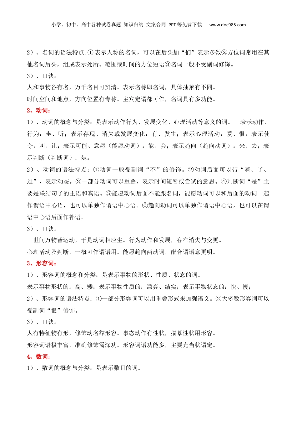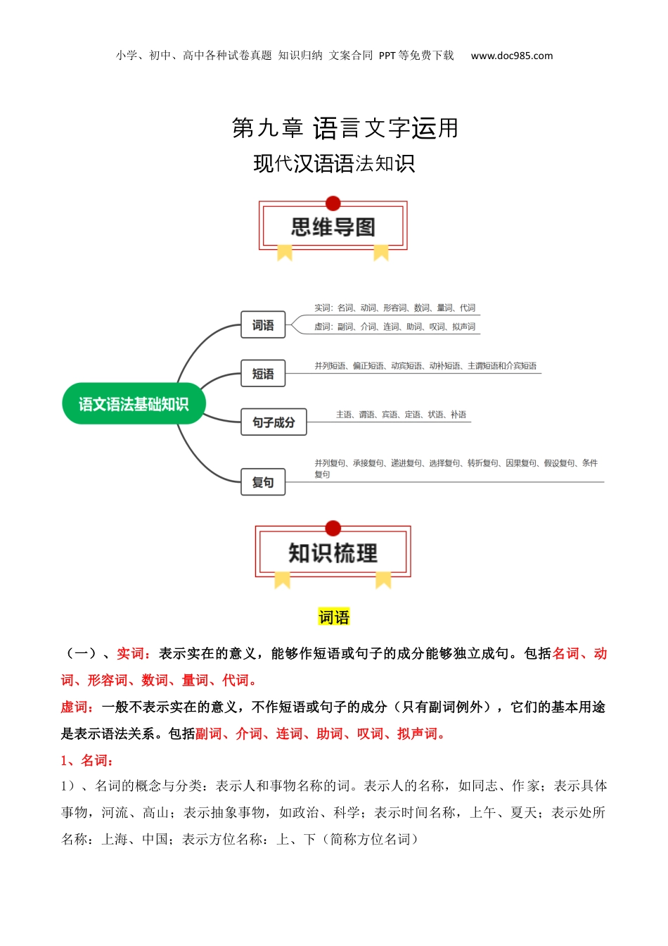 小学、初中、高中各种试卷真题知识归纳文案合同PPT等免费下载www.doc985.com第九章言文字用语运代法知现汉语语识词语(一)、实词:表示实在的意义,能够作短语或句子的成分能够独立成句。包括名词、动词、形容词、数词、量词、代词。虚词:一般不表示实在的意义,不作短语或句子的成分(只有副词例外),它们的基本用途是表示语法关系。包括副词、介词、连词、助词、叹词、拟声词。1、名词:1)、名词的概念与分类:表示人和事物名称的词。表示人的名称,如同志、作家;表示具体事物,河流、高山;表示抽象事物,如政治、科学;表示时间名称,上午、夏天;表示处所名称:上海、中国;表示方位名称:上、下(简称方位名词)小学、初中、高中各种试卷真题知识归纳文案合同PPT等免费下载www.doc985.com2)、名词的语法特点:①表示人称的名词,可以在后头加“们”表示多数②方位词常用在其他名词后头,组成表示处所、范围或时间的方位短语③名词一般不受副词修饰。3)、口诀:人和事物各有名,万千名目可辨清。表示名称即名词,具体抽象有不同。时间空间和地点,方向位置有专称。主宾定谓都可作,名词具有多功能。2、动词:1)、动词的概念与分类:是表示动作行为、发展变化、心理活动等意义的词。表示动作、行为:坐、听;表示存现、消失或发展变化:有、发生;表示心理活动:爱、恨;表示使令:叫、让;表示可能、意愿(能愿动词):能、会;表示趋向(趋向动词):来、去;表示判断(判断词):是。2)、动词的语法特点:①动词一般受副词“不”的修饰。②动词后面可以带“着、了、过”,表示动态。③一部分动词可以重叠,表示时间短暂或尝试的意思。④判断词“是”主要是联结句子的主语和宾语。⑤能愿动词后面不能跟名词,能愿动词可以和后面的动词一起作谓语中心语,也可以单独作谓语中心语。⑥趋向动词可以单独作谓语中心语,也可以在谓语中心语后面作补语。3)、口诀:世间万物皆运动,于是动词相应生。行为动作和发展,存在消失与变更。心理活动及判断,一概可作谓语用。能愿趋向两动词,配合谓语意更明。3、形容词:1)、形容词的概念和分类:是表示事物的形状、性质、状态的词。表示事物形状的:高、矮;表示事物性质的:漂亮、结实;表示事物状态的:快、慢;2)、形容词的语法特点:①一部分形容词可以用重叠形式来加强语义。②大多数形容词可以受副词“很”修饰。3)、口诀:人有特征物有形,修饰动名靠形容。事态动作有性状,描摹性状用形容。形容词语极丰富,准确修饰需深功。形容词语功能多,主要充当状谓定。4、数词:1)、数词的概念与分类:是表示数目的词。小学、初中、高中各种试卷真题知识归纳文案合同PPT等免费下载www.doc985.com表确数(表示分数,整数和倍数);表概数:几、许多;表序数:第一、老三;数词的语法2)、特点:①数目增加,可以用分数表示,也可以用倍数表示②数目减少,只能用分数,不能用倍数。3)、口诀:数词即为表数目,确数概数和序数。确数包括整分倍,不定数目是概数。整数前加老第初,排列顺序是序数。分数倍数表增加,减少只能用分数。5、量词:1)、量词的概念与分类:是表示事物和动作、行为单位的词。表示事物单位的量词叫数量词。表示动作、行为单位的量词叫动量词。表示事物单位的:个、只;表示动作、行为单位的:次、回,有时也借用某些名词来表示动量,如:脚、年;2)、量词的语法特点:①量词经常和数词连用,组成数量短语,也称为数量启数量词。②表示物量的数量词常用在名词的前面。③表示的数量词数量词常用在动词的后面。3)、口诀:表示单位量词全,单位各异按习惯。事物行动作统计,物量动量分两款。量词数词相结合,数量短语功能全。动量短语居动后,物量短语在名前。6、代词:1)、代词的概念和分类:起代替或指示作用的词。代词分为人称代词、疑问代词、指示代词三类。2)、代词的语法特点:①第二人称的敬称“您”不用于复数,如果需要表示复数,就用“您几位”“您诸位”②第三人称复数代词“他们”可专指男性,也可兼指男性和女性,“她们”则专指女性③注意“我们”和“咱们”用法的区别。“我们”指说话人...
