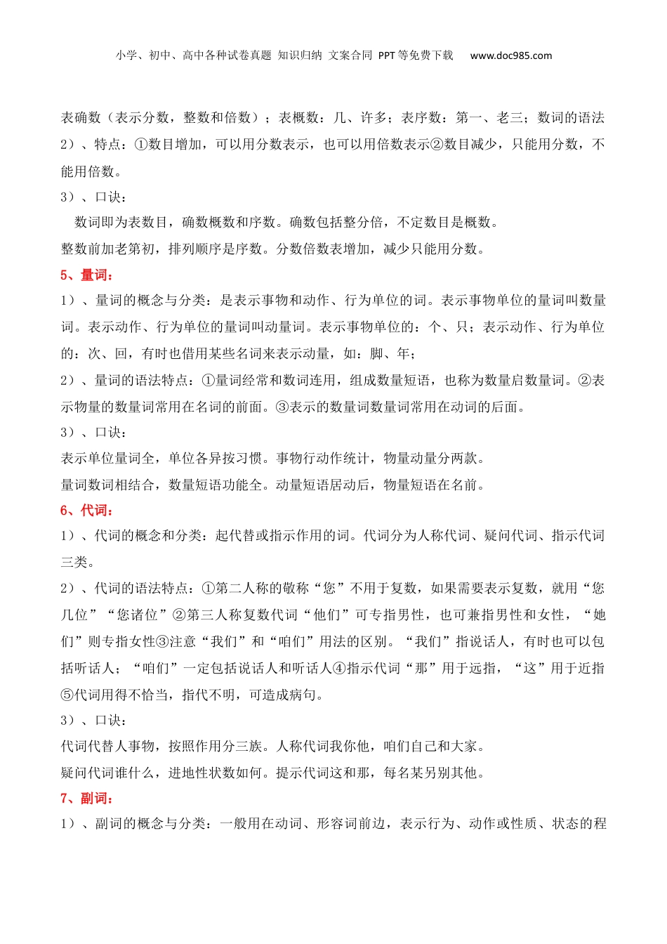 小学、初中、高中各种试卷真题知识归纳文案合同PPT等免费下载www.doc985.com第九章言文字用语运代法知现汉语语识词语(一)、实词:表示实在的意义,能够作短语或句子的成分能够独立成句。包括名词、动词、形容词、数词、量词、代词。虚词:一般不表示实在的意义,不作短语或句子的成分(只有副词例外),它们的基本用途是表示语法关系。包括副词、介词、连词、助词、叹词、拟声词。1、名词:1)、名词的概念与分类:表示人和事物名称的词。表示人的名称,如同志、作家;表示具体事物,河流、高山;表示抽象事物,如政治、科学;表示时间名称,上午、夏天;表示处所名称:上海、中国;表示方位名称:上、下(简称方位名词)小学、初中、高中各种试卷真题知识归纳文案合同PPT等免费下载www.doc985.com2)、名词的语法特点:①表示人称的名词,可以在后头加“们”表示多数②方位词常用在其他名词后头,组成表示处所、范围或时间的方位短语③名词一般不受副词修饰。3)、口诀:人和事物各有名,万千名目可辨清。表示名称即名词,具体抽象有不同。时间空间和地点,方向位置有专称。主宾定谓都可作,名词具有多功能。2、动词:1)、动词的概念与分类:是表示动作行为、发展变化、心理活动等意义的词。表示动作、行为:坐、听;表示存现、消失或发展变化:有、发生;表示心理活动:爱、恨;表示使令:叫、让;表示可能、意愿(能愿动词):能、会;表示趋向(趋向动词):来、去;表示判断(判断词):是。2)、动词的语法特点:①动词一般受副词“不”的修饰。②动词后面可以带“着、了、过”,表示动态。③一部分动词可以重叠,表示时间短暂或尝试的意思。④判断词“是”主要是联结句子的主语和宾语。⑤能愿动词后面不能跟名词,能愿动词可以和后面的动词一起作谓语中心语,也可以单独作谓语中心语。⑥趋向动词可以单独作谓语中心语,也可以在谓语中心语后面作补语。3)、口诀:世间万物皆运动,于是动词相应生。行为动作和发展,存在消失与变更。心理活动及判断,一概可作谓语用。能愿趋向两动词,配合谓语意更明。3、形容词:1)、形容词的概念和分类:是表示事物的形状、性质、状态的词。表示事物形状的:高、矮;表示事物性质的:漂亮、结实;表示事物状态的:快、慢;2)、形容词的语法特点:①一部分形容词可以用重叠形式来加强语义。②大多数形容词可以受副词“很”修饰。3)、口诀:人有特征物有形,修饰动名靠形容。事态动作有性状,描摹性状用形容。形容词语极丰富,准确修饰需深功。形容词语功能多,主要充当状谓定。4、数词:1)、数词的概念与分类:是表示数目的词。小学、初中、高中各种试卷真题知识归纳文案合同PPT等免费下载www.doc985.com表确数(表示分数,整数和倍数);表概数:几、许多;表序数:第一、老三;数词的语法2)、特点:①数目增加,可以用分数表示,也可以用倍数表示②数目减少,只能用分数,不能用倍数。3)、口诀:数词即为表数目,确数概数和序数。确数包括整分倍,不定数目是概数。整数前加老第初,排列顺序是序数。分数倍数表增加,减少只能用分数。5、量词:1)、量词的概念与分类:是表示事物和动作、行为单位的词。表示事物单位的量词叫数量词。表示动作、行为单位的量词叫动量词。表示事物单位的:个、只;表示动作、行为单位的:次、回,有时也借用某些名词来表示动量,如:脚、年;2)、量词的语法特点:①量词经常和数词连用,组成数量短语,也称为数量启数量词。②表示物量的数量词常用在名词的前面。③表示的数量词数量词常用在动词的后面。3)、口诀:表示单位量词全,单位各异按习惯。事物行动作统计,物量动量分两款。量词数词相结合,数量短语功能全。动量短语居动后,物量短语在名前。6、代词:1)、代词的概念和分类:起代替或指示作用的词。代词分为人称代词、疑问代词、指示代词三类。2)、代词的语法特点:①第二人称的敬称“您”不用于复数,如果需要表示复数,就用“您几位”“您诸位”②第三人称复数代词“他们”可专指男性,也可兼指男性和女性,“她们”则专指女性③注意“我们”和“咱们”用法的区别。“我们”指说话人...