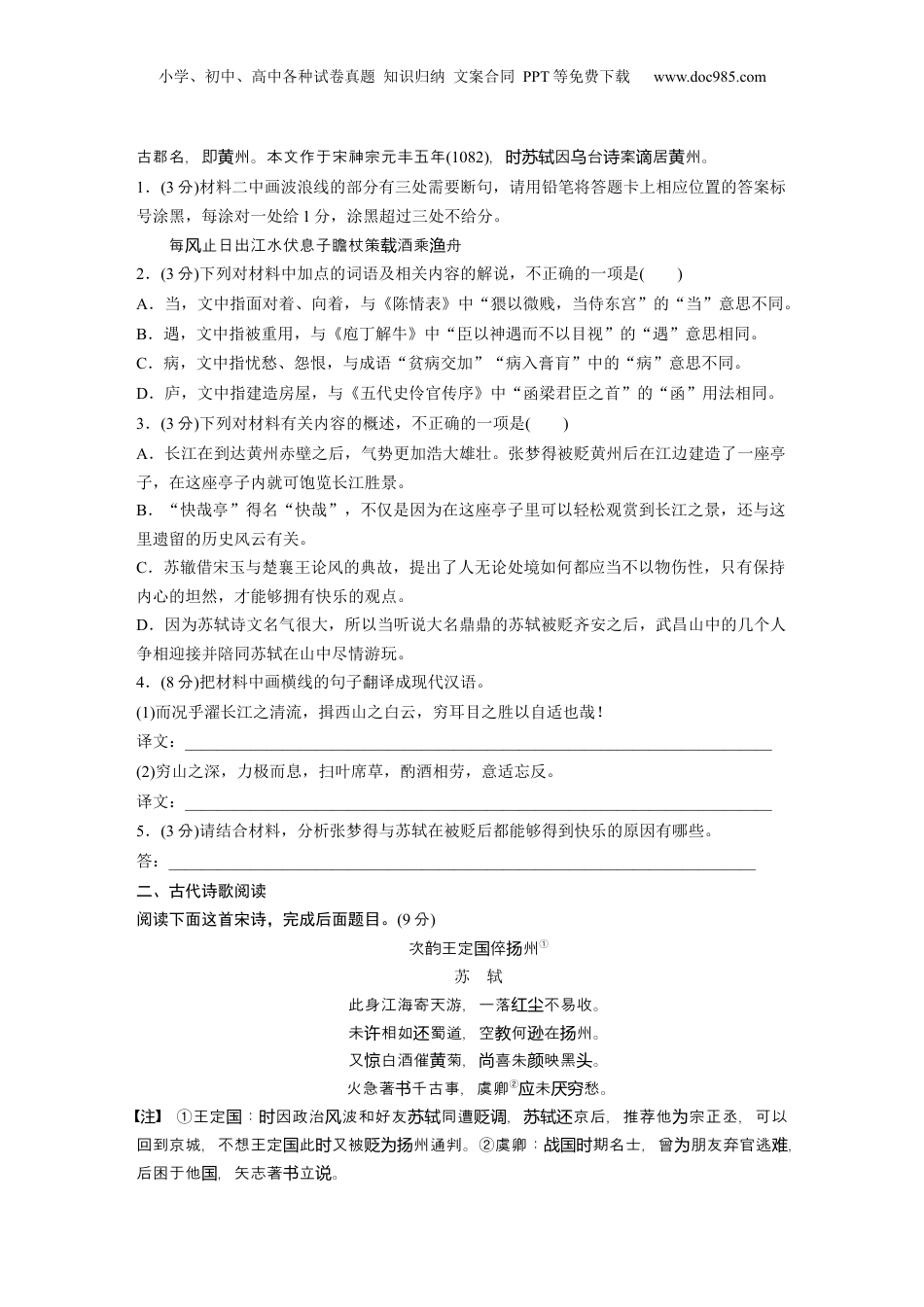 小学、初中、高中各种试卷真题知识归纳文案合同PPT等免费下载www.doc985.com主题练案5苏轼的超脱:文言文阅读+古代诗歌阅读+名篇名句默写(分:值35分)一、文言文阅读阅读下面的文言文,完成文后题目。(20分)材料一:江出西陵,始得平地,其流奔放肆大。南合沅、湘,北合,其益。至于赤壁之下汉势张,波流浸灌,海相若。河君得居安,即其之西南亭,以江流之,而余与清张梦谪齐庐为览观胜兄子瞻名之曰“快哉①”。盖亭之所,南北百里,西一舍。涌,云。舟出于其前,夜见东涛澜汹风开阖昼则没则鱼悲于其下。化倏忽,心目,不可久。今乃得玩之几席之上,目而足。西望武龙啸变动骇视举昌山,陵起伏,草木行列,烟消日出。夫樵父之舍,皆可指。此其所以诸冈渔数为“快哉”者也。至于洲之,故城之墟,曹孟德、仲之所睥睨,周瑜、之所。其流长滨孙谋陆逊骋骛风迹,亦足以快世俗。遗称昔楚襄王宋玉、景差于台之,有然至者,王披襟从兰宫风飒当之,曰:“快哉此!寡风人所庶人共者耶?与”宋玉曰:“此大王之雄耳,庶人安得共之!独风”玉之言盖有焉。讽夫无雌雄之,而人有风异遇不遇之。楚王之所以,庶人之所以,此人之也变为乐与为忧则变,而何焉?士生于世,使其中不自得,何往而非风与将病?使其中坦然,不以物性,何适伤将而非快?今君不以患,窃之余功张谪为会计②,而自放山水之,此其中宜有以人者。间过将蓬瓮牖无所不快;户而乎濯江之流,揖西山之白云,耳目之以自适也哉!况长清穷胜不然,山壑,林古木,振之以,照之以明月,此皆人思士之所以悲憔悴而不能者连绝长清风骚伤胜,睹其快也哉!乌为(自《州快哉亭》节选苏辙黄记)材料二:子瞻于安迁齐③,庐于江上。安无名山,而江之南武昌山,陂齐诸陁蔓延,谷深密,涧中有浮精舍,西曰西山,曰寒溪。依山壑,蔽松,然俗,之迹不至。图东临隐枥萧绝车马每止日出江水伏息子瞻杖策酒乘舟风载渔,流而南。山中有二三子,好客而喜游。子瞻至乱闻,幅巾迎笑,相携徜徉而上。山之深,力而息,叶席草,酌酒相,意适忘反。穷极扫劳以此居安三年,不知其久也。齐(自《武昌九曲亭》节选苏辙记)注①宋神宗元丰年间(1078—1085),得、都被至州。得在寓所西南筑张梦苏轼贬黄张梦亭,就命名苏轼为“快哉亭”,作《州快哉亭》。苏辙黄记②窃会(kuài)之余功:窃,计偷得,里是利用之意;,指征收谷、管理行政等事;余功,公事之余。这会计钱财务务③安齐:小学、初中、高中各种试卷真题知识归纳文案合同PPT等免费下载www.doc985.com古郡名,即州。本文作于宋神宗元丰五年黄(1082),因台案居州。时苏轼乌诗谪黄1.(3分)材料二中画波浪线的部分有三处需要断句,请用铅笔将答题卡上相应位置的答案标号涂黑,每涂对一处给1分,涂黑超过三处不给分。每止日出江水伏息子瞻杖策酒乘舟风载渔2.(3分)下列对材料中加点的词语及相关内容的解说,不正确的一项是()A.当,文中指面对着、向着,与《陈情表》中“猥以微贱,当侍东宫”的“当”意思不同。B.遇,文中指被重用,与《庖丁解牛》中“臣以神遇而不以目视”的“遇”意思相同。C.病,文中指忧愁、怨恨,与成语“贫病交加”“病入膏肓”中的“病”意思不同。D.庐,文中指建造房屋,与《五代史伶官传序》中“函梁君臣之首”的“函”用法相同。3.(3分)下列对材料有关内容的概述,不正确的一项是()A.长江在到达黄州赤壁之后,气势更加浩大雄壮。张梦得被贬黄州后在江边建造了一座亭子,在这座亭子内就可饱览长江胜景。B.“快哉亭”得名“快哉”,不仅是因为在这座亭子里可以轻松观赏到长江之景,还与这里遗留的历史风云有关。C.苏辙借宋玉与楚襄王论风的典故,提出了人无论处境如何都应当不以物伤性,只有保持内心的坦然,才能够拥有快乐的观点。D.因为苏轼诗文名气很大,所以当听说大名鼎鼎的苏轼被贬齐安之后,武昌山中的几个人争相迎接并陪同苏轼在山中尽情游玩。4.(8分)把材料中画横线的句子翻译成现代汉语。(1)而况乎濯长江之清流,揖西山之白云,穷耳目之胜以自适也哉!译文:________________________________________________________________________(2)穷山之深,力极而息,扫叶席草,酌酒...