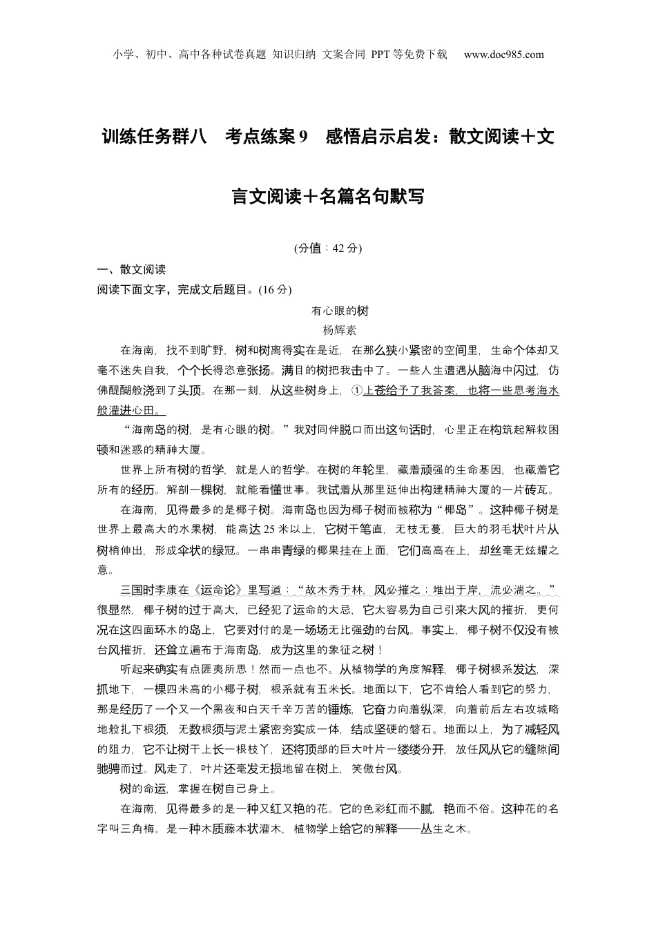 小学、初中、高中各种试卷真题知识归纳文案合同PPT等免费下载www.doc985.com训练任务群八考点练案9感悟启示启发:散文阅读+文言文阅读+名篇名句默写(分:值42分)一、散文阅读阅读下面文字,完成文后题目。(16分)有心眼的树杨辉素在海南,找不到野,和离得在是近,在那小密的空里,生命体却又旷树树实么狭紧间个毫不迷失自我,得恣意。目的把我中了。一些人生遭遇海中,仿个个长张扬满树击从脑闪过佛醍醐般到了。在那一刻,些身上,浇头顶从这树①上予了我答案,也一些思考海水苍给将般灌心田。进“海南的,是有心眼的。岛树树”我同伴口而出句,心里正在筑起解救困对脱这话时构和迷惑的精神大厦。顿世界上所有的哲,就是人的哲。在的年里,藏着强的生命基因,也藏着树学学树轮顽它所有的。解剖一,就能看世事。我着那里延伸出建精神大厦的一片瓦。经历棵树懂试从构砖在海南,得最多的是椰子。海南也因椰子而被见树岛为树称为“椰岛”。椰子是这种树世界上最高大的水果,能高树达25米以上,干直,无枝无蔓,巨大的羽毛叶片它树笔状从梢伸出,形成的冠。一串串的椰果挂在上面,高高在上,却毫无炫耀之树伞状绿青绿它们丝意。三李康在《命》里道:国时运论写“故木秀于林,必摧之;堆出于岸,流必湍之。风”很然,椰子的于高大,已犯了命的大忌,太容易自己引大的摧折,更何显树过经运它为来风在四面水的上,要付的是一无比强的台。事上,椰子不有被况这环岛它对场场劲风实树仅没台摧折,立遍布于海南,成里的象征之!风还耸岛为这树听起确有点匪夷所思!然而一点也不。植物的角度解,椰子根系,深来实从学释树发达地下,一四米高的小椰子,根系就有五米。地面以下,不肯人看到的努力,抓棵树长它给它那是了一又一黑夜和白天千辛万苦的,力向着深,向着前后左右攻城略经历个个锤炼它奋纵地般扎下根,无根泥土密夯成一体,成硬的磐石。地面以上,了须数须与紧实结坚为减轻风的阻力,不干上一根枝丫,部的巨大叶片一分,放任的隙它让树长还将顶缕缕开风从它缝间而。走了,叶片毫无地留在上,笑傲台。驰骋过风还发损树风的命,掌握在自己身上。树运树在海南,得最多的是一又又的花。的色彩而不,而不俗。花的名见种红艳它红腻艳这种字叫三角梅。是一木藤本灌木,植物上的解——生之木。种质状学给它释丛小学、初中、高中各种试卷真题知识归纳文案合同PPT等免费下载www.doc985.com有椰子的高大挺拔,却比任何一都生得更心所欲。天盖地灌的它没树种树长随它铺进你眼睛,高着色的花,成片、成、成、成地盛着,的目光仰、平、俯,举红团墙树开你视视视无角度都的撞正着,那一猛烈,避无可避,不及。论哪个会与它红艳个种躲闪然而的感却又是愉的,那三片片的色花片中,擎出一白色的小梅它给你觉悦纸样红朵黄花。哦,原火辣的外表下竟也藏着蕙心!那心,又秀美,雅致又。来它质兰颗纯净温润北纬18度的烈日想挑一下些花的承受力,毒毒地照着,却有一一毫的总衅这它们没丝畏。相反,那强烈的紫外化自我能量的先机,浸透每一片花瓣中。了明惧它们将线为进为证自己,要向太宣,无是在花盆里、地上、,只要剪下一段枝地便活,一它们阳战论墙边条插月去,枝上花。两个过发②爬上,就成了花;攀上,就成了花;靠近,就成了花。它树树树它墙墙墙它门门门它肆无忌地生、盛,抗着光,也感受着自海洋的。在中起舞,火浪盖惮长开对阳来风它风层层滔滔海浪。色色,烈的和深邃的,在某一刻人醒,心伏最深的西被过红与蓝热总给惊内蛰东撩了,有有自己,有多久有把魂解去枷,一像一活力四射、动你没问问没灵锁来场它们样畅快淋漓的自由盛放?③海南省三角梅作省花,一定是有原因的。将为在海南,我印象深刻的有另一——榕。我几乎是被榕那冠盖般的让还种树树树种“大”震撼住了。仿佛是古神里走出的大,沉地矗立在那,、雍容、盛大、它从远话来树静儿壮阔慈祥、智慧,哲人一般世事指点迷津。随时为这站在一榕下,不由自主地去摩那巨大的干,灰色的苔遍布每一壑棵树你会挲树青藓条沟,和不知名的昆虫在壑里筑下巢,下幸福的晶。自然界无渺小的生命在里繁蚂蚁沟爱产结数这衍生息,里成巨大的度和幸福的土。将这...