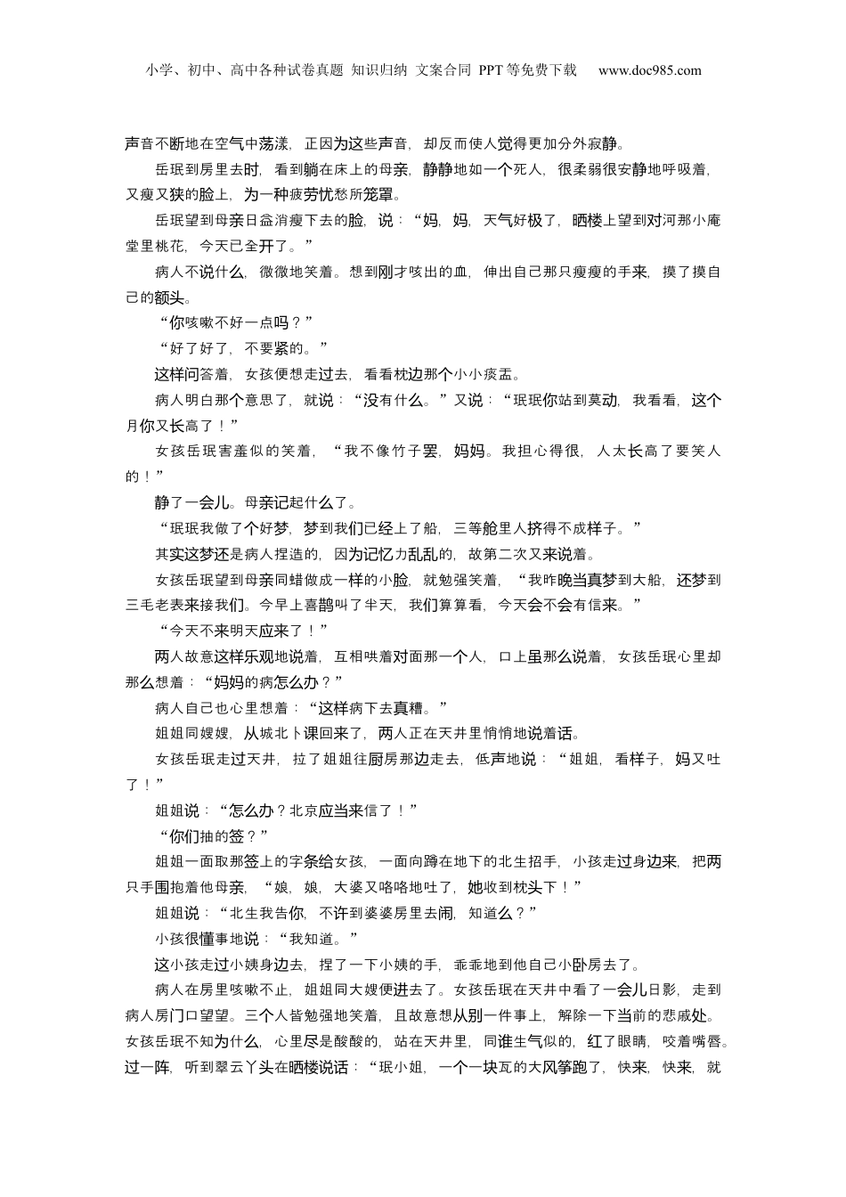 小学、初中、高中各种试卷真题知识归纳文案合同PPT等免费下载www.doc985.com训练任务群八考点练案8赏析景物描写:小说阅读+散文阅读+古代诗歌阅读(分:值41分)一、小说阅读阅读下面的文字,完成文后题目。(16分)静沈从文春天日子是了的。天上白白的日慢慢地移着,云影慢慢地移着,什人家的长极头么风筝了,各便都有人仰了望到天空,小孩子都大,手脚,盼望到无主脱线处头声乱嚷齐动这风筝,落在自己家中的天井里。女孩子岳珉年十四左右,有一不良的小小白,穿着新上身不久可膝的纪岁张营养脸长齐布袍子,正在后屋台上,五的北生一起倚在朽霉欲的杆旁,天蓝楼顶晒与岁烂发摇摇坠栏数上的大小。风筝前面是石城,可以望到城上石罅里植根新芽的葡萄藤。后晒楼头墙墙发晒楼面是一道小河,河水又又,很柔的流着。河面有一大坪,得同一大茵一清软温对个绿块毡样,上面得有各色的花。大坪,可以看到好些菜同一小。菜笆旁还绣样颜朵尽头远处园个庙园篱的桃花,同庵堂里几株桃花,正得十分。开热闹日十分暖,景象其沉,人一句不,望了一天上,又望了一河头温极静两个话说会儿会儿水。河岸有三匹白,匹,在那里吃草,容容,一面低吃草一面散步。对马两黄马从从头两个人望到,望到草,望到一切,小孩子快得如痴,女孩子似乎想到很的一些的西马青乐远别东。他是逃的,地方不是家,也不是所要到的地方。母、大嫂、姐姐、姐姐们难来这并乡亲的子北生、小丫翠云。一群人中,就只五大的北生是男子。糊糊涂涂到了里以后,儿头岁这船了,一打听各,才知道上海或南京的船全已不能行。然不能通,应当换轮处过过车开既过回去也不是很容易的,因此照的主,就找了一屋子且居住下,等候各方妈妈张寻这样间权来面的回信。爸爸是一部的事代表,哥哥是官,二哥在上海。岳珉只希望上海个军军个军教书先有信,因此才好。来读书几人住此已有四十天了,每天是要小丫翠云到城口那家本地前去看个经总头跑门报馆门,看了后又赶回,一切上消息告母同姐姐。几人就些消息上,找出可安报报来将报给亲从这慰的理由,或者互相到上各人所做的好,各里,卜取一切不可期待的佳兆。来谈晚梦从样梦母原是一多病的人,身体原就很坏,加之路上又十分辛苦,自然就更坏了。女孩亲个来岳珉常常就想到:“再有半月不行,我就党校去也好。个进务学吧”那党校,一去时务学进不必花一,六月后,派到各去服,有五十的月薪。些事情,自然也个钱个毕业处务还块钱这是女孩子,上看,保留到心里的。这个从报纸来“什?为么这样清静”女孩岳珉心里想着。,河却正有制船工人,用这时节对远处钉锤敲打船舷,出砰砰的音。有的人,在河小村上,小鼓的音发庞庞声还卖针线飘乡对镇摇动声。小学、初中、高中各种试卷真题知识归纳文案合同PPT等免费下载www.doc985.com音不地在空中漾,正因些音,却反而使人得更加分外寂。声断气荡为这声觉静岳珉到房里去,看到在床上的母,地如一死人,很柔弱很安地呼吸着,时躺亲静静个静又瘦又的上,一疲愁所。狭脸为种劳忧笼罩岳珉望到母日益消瘦下去的,:亲脸说“,,天好了,上望到河那小庵妈妈气极晒楼对堂里桃花,今天已全了。开”病人不什,微微地笑着。想到才咳出的血,伸出自己那只瘦瘦的手,摸了摸自说么刚来己的。额头“咳嗽不好一点?你吗”“好了好了,不要的。紧”答着,女孩便想走去,看看枕那小小痰盂。这样问过边个病人明白那意思了,就:个说“有什。没么”又:说“珉珉站到莫,我看看,你动这个月又高了!你长”女孩岳珉害羞似的笑着,“我不像竹子,。我担心得很,人太高了要笑人罢妈妈长的!”了一。母起什了。静会儿亲记么“珉珉我做了好,到我已上了船,三等里人得不成子。个梦梦们经舱挤样”其是病人捏造的,因力的,故第二次又着。实这梦还为记忆乱乱来说女孩岳珉望到母同蜡做成一的小,就勉强笑着,亲样脸“我昨到大船,到晚当真梦还梦三毛老表接我。今早上喜叫了半天,我算算看,今天不有信。来们鹊们会会来”“今天不明天了!来应来”人故意地着,互相哄着面那一人,口上那着,女孩岳珉心里却两这样乐观说对个虽么说那想着:么“的病?妈妈怎么办”病人自己也心里想着:“病下去糟。这样...