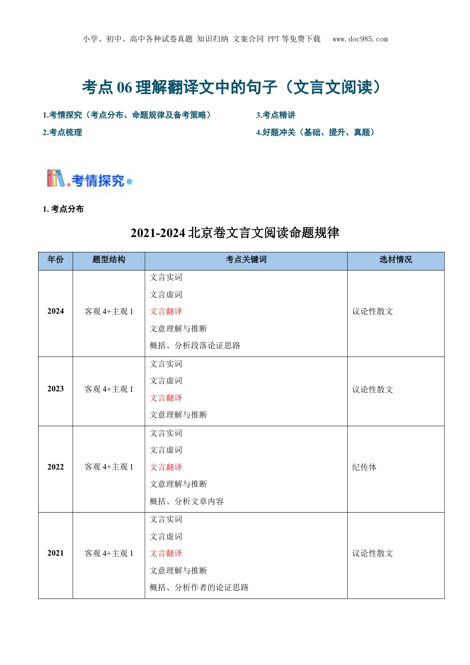 小学、初中、高中各种试卷真题知识归纳文案合同PPT等免费下载www.doc985.com考点06理解翻译文中的句子(文言文阅读)1.考情探究(考点分布、命题规律及备考策略)3.考点精讲2.考点梳理4.好题冲关(基础、提升、真题)1.考点分布2021-2024北京卷文言文阅读命题规律年份题型结构考点关键词选材情况2024客观4+主观1文言实词文言虚词文言翻译文意理解与推断概括、分析段落论证思路议论性散文2023客观4+主观1文言实词文言虚词文言翻译文意理解与推断议论性散文2022客观4+主观1文言实词文言虚词文言翻译文意理解与推断概括、分析文章内容纪传体2021客观4+主观1文言实词文言虚词文言翻译文意理解与推断概括、分析作者的论证思路议论性散文小学、初中、高中各种试卷真题知识归纳文案合同PPT等免费下载www.doc985.com2.命题规律及备考策略【命题规律】1.翻译题的选材主要有如下几个特点:(1)特别青睐含有重点实词(关注一词多义、古今异义)的句子;(2)特别青睐含有词类活用现象的句子;(3)特别青睐含有古汉语特殊句式的句子;(4)特别青睐只有联系上下文才能准确理解的句子。2.题型上,客观题或主观题,这几年北京卷主要以选择题为主。赋分是3分,【备考策略】1.强化文言基础,落实文本内容理解。2.立足教材,结合经典例句,对以下方面进行归纳整理:关键实词(主要包括一词多义、古今异义词、通假字、偏义复词等)、特殊用法(词类活用)、文言句式〔判断句、被动句、倒装句(主谓倒装、宾语前置、定语后置、状语后置)〕和省略句,3.树立、强化语境意识,将语句放在语境中前后勾连理解。一、考点概述与解题方法【考点概述】理解和翻译文中的句子,就是根据语境读懂、领会文中某一个句子的意思,能从语句内容、语意阐释和语气效果等方面把这个句子用现代汉语的形式表达出来。理解并翻译文中的句子这类题的综合性较强,涉及文言实词、文言虚词、文言句式等多方面的知识,考查的是考生文言文的综合能力和做题的细心程度,是文言文的重点,在高考中属于必考题,也是考生易失分的题型。考生在答题时,首先要认真推敲语句中的每一个词语的含义,再踩准三大得分点(关键实词、关键虚词和特殊句式);同时还应依照文言文翻译的方法,确保句子翻译得更规范,从而取得高分。文言翻译具体涉及哪些知识点?1.文言实词:通假字、古今异义词、偏义复词、词类活用、一词多义。2.文言虚词:18个文言虚词3.特殊句式:判断句、省略句、被动句、各类倒装句(宾语前置、定语后置、状语后置、主谓倒装)4.文化常识【答题方法】强化语境意识,揣摩句内语境和句外语境。小学、初中、高中各种试卷真题知识归纳文案合同PPT等免费下载www.doc985.com利用一个语境(句内语境和句外语境)之内的语句表述连贯、语意密切的特点来翻译句子。考生可以通过具体的语境补充省略的成分,如量词、主谓宾等,也可以通过语境突破翻译句子当中一些不熟悉的字词和句子的大意。因此,前后语境可以帮助考生灵活推断难解词语在具体语境中的准确含义和用法。(1)关注试题信息是否错位,人物、时间、事件的表述是否正确,是否在细节方面有张冠李戴的问题。(2)关注词语是否错解、分析有无错解,是否存在颠倒是非,选项中的表述是否符合原文意思。(3)关注关键实词、关键虚词和特殊句式的翻译是否准确,特别注意直译的实词,注意一词多义、有特殊用法的实词,越是接近现代汉语的翻译越要警惕。(3)关注选项中的相应关系,确认前因与后果、条件与结果等逻辑关系是否正确。(注意选项中的句内语境)(4)关注是否添枝加叶、无中生有,是否故意夸大或缩小、以偏概全或以全概偏等。(5)关注转述是否准确,确认对情节、细节的表述有无错漏,是否把不同时空的事糅合起来表述。(6)关注增加(比如省略的主语和宾语)、删减、变换、调整顺序的部分。(7)回归原文进行验证,看是否与前后语境相符合。【选择题设错方式】(1)不需翻译的强行翻译。在文言文中凡是国名、地名,人名,官名、帝号,年号、器物名、度量衡等,在翻译时,可以原封不动地保留下来,不用翻译,因为这些词一般都无法与现代汉语对译。如:晋侯、秦伯围郑,以其无礼于晋。译成...