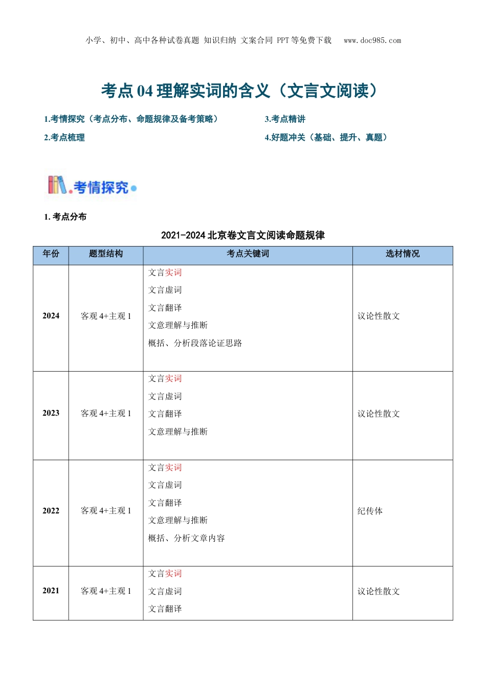 小学、初中、高中各种试卷真题知识归纳文案合同PPT等免费下载www.doc985.com考点04理解实词的含义(文言文阅读)1.考情探究(考点分布、命题规律及备考策略)3.考点精讲2.考点梳理4.好题冲关(基础、提升、真题)1.考点分布2021-2024北京卷文言文阅读命题规律年份题型结构考点关键词选材情况2024客观4+主观1文言实词文言虚词文言翻译文意理解与推断概括、分析段落论证思路议论性散文2023客观4+主观1文言实词文言虚词文言翻译文意理解与推断议论性散文2022客观4+主观1文言实词文言虚词文言翻译文意理解与推断概括、分析文章内容纪传体2021客观4+主观1文言实词文言虚词文言翻译议论性散文小学、初中、高中各种试卷真题知识归纳文案合同PPT等免费下载www.doc985.com文意理解与推断概括、分析作者的论证思路2.命题规律及备考策略【整体命题规律】1.文言文阅读题具有稳定性、基础性、育人性的特点。(1)题目设置具有稳定性、基础性。北京卷文言文阅读从对文本内容(实词、虚词、句子)的理解、句式的把握、句子翻译等角度设题,体现出对考生文言文基础知识和基本能力的考查。(2)选材体现育人性。无论是《墨子·非命》《汉书•贾谊传》《论衡•非韩》,还是《史记》《资治通鉴》,都强调了对中国传统文化的学习、领悟和传承,体现出了育人的特点。2.试题内容稳定中有创新,凸显应用性、综合性、创造性。如2022年北京卷第7题,考查学生对文言词语“亡”“之”“而”“或”的意义和用法进行判断的能力,将实词和虚词组合在一起考查,帮助考生更好地理解文言词语的意义和用法。3.题型上,客观题+主观简答题,采用4+1的模式。【备考策略】1.强化文言基础,落实文本内容理解。课外文言文的加点实词解释和虚词的比较判断,来自于平时对课文中的实、虚词的积累。所以,对课文中的词语、虚词的积累尤为重要。做此题时,要注意把课内的所学灵活运用到课外。链接教材小学、初中、高中各种试卷真题知识归纳文案合同PPT等免费下载www.doc985.com从教材的选文看,写人叙事类文本仅6篇:史传4篇,小说1篇,寓言1篇。论辩杂记类文本26篇:其中诸子散文10篇(儒家6篇、道家3篇、墨家1篇),其余有书信3篇,序文2篇,游记2篇,史论2篇,赋2篇,辞1篇,表1篇,疏1篇,志1篇,说1篇。从对教材的梳理分析看,文言文选材众体兼备,议论抒情性文本占比明显大于记叙性文本。这是备考要关注的。2.树立、强化语境意识,将语句放在语境中前后勾连理解;3.树立整体意识,学会提取议论性文言文作者观点,理清行文思路;4.加强审题,明确题目限制及指向,明确答题对象及答题角度,理清答题语句之间的内在逻辑;5.规范作答,答案表述应思路清晰。一、考点概述与解题方法【考点概述】文言实词主要指名词、动词、形容词、数量词。文言实词是构成文言文的主体,是学好文言文的基础,是阅读浅易文言文的前提。实词理解题,主要考查考生利用上下文对词义进行推断的能力。做好文言实词题,首先要掌握一词多义、古今异义、词类活用、通假字和偏义复词这五大知识点。【文言实词的推断方法】小学、初中、高中各种试卷真题知识归纳文案合同PPT等免费下载www.doc985.com不论是理解文言文内容,还是“理解并翻译文中的重要句子”,最终也要落实到实词的判断上,因而掌握实词至关重要。那么,如何要正确理解和解释文言实词的意义?首先,必须通过一定量的诵读,增强语感;其次,要掌握一批常用实词的常用义项和用法;再次,就是在上述基础上进一步把知识转化为解决实际问题的能力,即掌握一些推断文言实词意义的方法。方法一字形推断法汉字是表意文字,“六书”中的象形、指事、会意字多能直接反映出其本义,形声字占汉字总量的80%以上,它的形旁往往是表意的。我们可以根据字形推断出词的大概意义范畴,再根据上下文来确定词的具体含义。例题:1.丰则贵籴[dí],歉则贱粜[tiào]译文:粮食丰收时就用高价收购粮食,歉收时就用低价卖出粮食。2.冀得一归觐译文:希望能够回去拜见一次。知识归整:常见形旁的词义指向:1.形旁从“刂(刀)、弓、矛、戈、斤(斧)、殳shū”者与兵器有关;2.从“马、牛、羊、豕、犭、鸟、虫”者与动物有关;3....