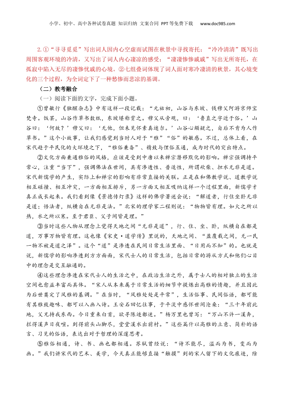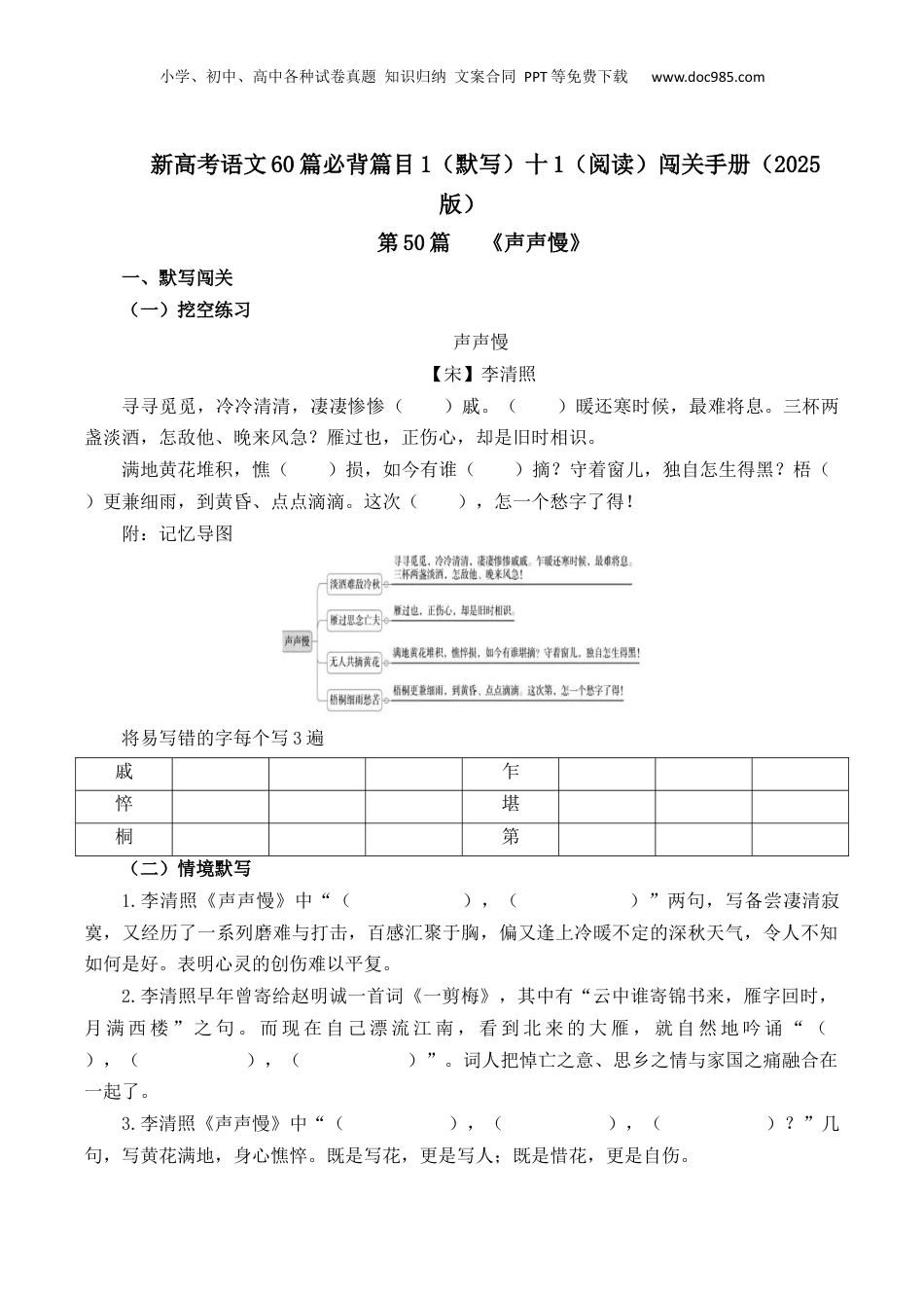 小学、初中、高中各种试卷真题知识归纳文案合同PPT等免费下载www.doc985.com新高考语文60篇必背篇目1(默写)十1(阅读)闯关手册(2025版)第50篇《声声慢》一、默写闯关(一)挖空练习声声慢【宋】李清照寻寻觅觅,冷冷清清,凄凄惨惨()戚。()暖还寒时候,最难将息。三杯两盏淡酒,怎敌他、晚来风急?雁过也,正伤心,却是旧时相识。满地黄花堆积,憔()损,如今有谁()摘?守着窗儿,独自怎生得黑?梧()更兼细雨,到黄昏、点点滴滴。这次(),怎一个愁字了得!附:记忆导图将易写错的字每个写3遍戚乍悴堪桐第(二)情境默写1.李清照《声声慢》中“(),()”两句,写备尝凄清寂寞,又经历了一系列磨难与打击,百感汇聚于胸,偏又逢上冷暖不定的深秋天气,令人不知如何是好。表明心灵的创伤难以平复。2.李清照早年曾寄给赵明诚一首词《一剪梅》,其中有“云中谁寄锦书来,雁字回时,月满西楼”之句。而现在自己漂流江南,看到北来的大雁,就自然地吟诵“(),(),()”。词人把悼亡之意、思乡之情与家国之痛融合在一起了。3.李清照《声声慢》中“(),(),()?”几句,写黄花满地,身心憔悴。既是写花,更是写人;既是惜花,更是自伤。小学、初中、高中各种试卷真题知识归纳文案合同PPT等免费下载www.doc985.com4.温庭筠《更漏子》中写到“梧桐树,三更雨,不道离情正苦,一叶叶,一声声,空阶滴到明。”李清照在《声声慢》中化用了这几句:“(),(),()”。语言更精炼,情感更深切,内蕴也更深厚了。【参考答案】1.乍暖还寒时候最难将息2.雁过也正伤心却是旧时相识3.满地黄花堆积憔悴损如今有谁堪摘4.梧桐更兼细雨到黄昏点点滴滴二、阅读闯关(一)课内阅读阅读下面诗歌,完成下列小题。声声慢【宋】李清照寻寻觅觅,冷冷清清,凄凄惨惨戚戚。乍暖还寒时候,最难将息。三杯两盏淡酒,怎敌他、晚来风急?雁过也,正伤心,却是旧时相识。满地黄花堆积,憔悴损,如今有谁堪摘?守着窗儿,独自怎生得黑?梧桐更兼细雨,到黄昏、点点滴滴。这次第,怎一个愁字了得!1.对李清照《声声慢》一词的思想内容和写作方法理解不正确的一项是()A.前三句用一连串叠词,写出一种愁惨而凄厉的氛围,是词人血和泪的吞吐,也是向苍天的悲惨呼告,是词人后期凄凉悲惨生活的真实写照B.上阕从一个人寻觅无着,写到酒难浇愁;风送雁声,反而增加了思乡的惆怅,最后“雁过也”三句在内容上承上,在结构上启下,自然地把抬头仰望过渡到低头俯视。C.“梧桐更兼细雨”两句写桐叶簌簌,秋雨滴滴,像鬼语戚戚、幽灵啜泣,这就更加令人难过了。这里是从正面渲染作者的悲苦心情。D.最后用一个“愁”字来概括,具有画龙点睛的作用。全词用象征手法,把国破家亡的身世寓于景物描写之中,表现了词人忧国忧民的心理。2.后人评论这首词前三句中叠词的运用“情景婉绝”,请简要分析。【参考答案】1.D【解析】本题主要考查鉴赏文学作品的形象、语言和表达技巧与评价作者的观点态度、思想感情的能力。D.“象征手法”错误,这首词主要的写作手法为借景抒情,没有用象征手法。故选D。小学、初中、高中各种试卷真题知识归纳文案合同PPT等免费下载www.doc985.com2.①“寻寻觅觅”写出词人因内心空虚而试图在秋景中寻找寄托;“冷冷清清”既写出周围客观环境的冷清,又写出了词人内心凄凉的感受;“凄凄惨惨戚戚”写出无所寄托,在孤寂中陷入无尽的凄惨忧戚的心境。②七组叠词体现了词人面对寒冷凄清的秋景,其心境变化的三个过程,为全词定下了一种愁惨而悲凉的基调。(二)教考融合(一)阅读下面的文字,完成下面小题。①曾敏行《独醒杂志》中有这样一段记载:“元祐初,山谷与东坡、钱穆父阿游京师宝梵寺。饭罢,山谷作草书数纸,东坡堪称赏之。穆父从旁观,曰:‘鲁直之字近于俗。’山谷曰:‘何故?’穆父曰:‘无他,但未见怀素真迹尔。’山谷心颇疑之,自后不肯为人作草书。”这个小故事,让我们感觉到当时人对于“雅”“俗”的敏感。不过,总体上看,在宋代趋于平民化的大环境之下,“雅俗兼备”、精致与俚俗互通,成为时代的突出特点。②文化方面兼通雅俗的风格,应该是受到中...