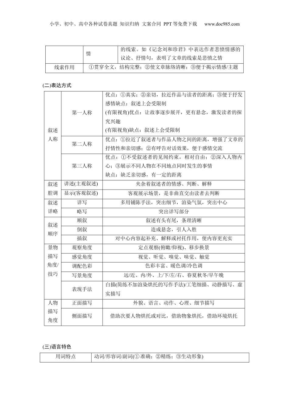 小学、初中、高中各种试卷真题知识归纳文案合同PPT等免费下载www.doc985.com二小说散文新诗必备知识文学类文本阅读包括小说、散文与现代诗歌等文体,考生在阅读时必须强化文体意识,以免盲目答题。小说的文体特征由人物、情节、环境、主题这几个关键词构成,因此这几个方面的特征决定了高考在小说阅读上的考查点和答题的思考方向。散文的文体特征概括来说就是“形散神聚”,所谓“形”即作者所写的人物、事物、景物、器物,联想广泛,时空纵横,但“形”虽散,目的却是统一的——用来抒发感情、阐述哲理、表达志趣等,这就是“神聚”。简而言之,散文即是考查作者写了什么,需要表达什么。现代诗歌由意象、手法、情感、语言等要素组成,同时也是高考考查的方向。不过,如果要考查,多半同古代诗歌一样重点考查内容(词句)、情感与技巧等方面。(一)结构思路结构的定义文章不同部分之间的关系常见结构手法作用过渡①内容连贯;②承上启下,衔接自然;③结构严谨照应(呼应)①强调突出;②情节连贯;③构思精巧铺垫①构思精巧,行文缜密,耐人寻味;②蓄积气势;③突出主旨抑扬①强调突出;②曲折多变,跌宕起伏;③增强作品的可读性对比①强调突出;②结构清晰;③突出主旨线索的定义作者组织材料的思路常见线索①时间线索;②空间线索;③人物线索;④事物线索;⑤某一具体事件为线索;⑥情感线索;⑦以心理时序展开(意识流小说)双线安排明线(人物活动或事件发展所直接呈现出来的线索)、暗线(未直接描绘的人物活动或事件所间接呈现出来的线索)找出线索——“四看”定线索看标题有些标题就揭示了线索。如《白杨礼赞》,其标题所揭示的对白杨树的赞美就是文章的情感线索看时空词语有些时间、空间词语很可能就是“时间线索”或“空间线索”。如《荷塘月色》就有空间线索看“物”文章中某一“物”若反复出现,很可能就是线索。如《记一辆纺车》就是以“一辆纺车”这一常出现的物件为线索的看议论、抒文中的议论、抒情句子中蕴含的“情”往往就是文章小学、初中、高中各种试卷真题知识归纳文案合同PPT等免费下载www.doc985.com情的线索。如《记念刘和珍君》中表达作者悲愤情感的议论、抒情句,表明了文章的线索是悲愤之情线索作用①贯穿全文,结构完整;②使文章脉络清晰;③便于揭示情感/主题(二)表达方式叙述人称第一人称优点:①真实;②亲切,拉近作品与读者的距离;③便于抒发感情缺点:叙述上会受限制(有限视角)优点:让故事逐步展开,更有悬念,激发读者的探究兴趣(有限视角)缺点:叙述上会受限制第二人称优点:①拉近了叙述者与作品人物之间的距离,增强了文章的抒情性和亲切感;②有呼告对话效果,便于感情交流第三人称优点:①不受叙述者的见闻约束,相对自由;②深入人物内心;③展示不同人物在不同地点同时发生的事情缺点:缺乏亲切感,有一定的距离叙述腔调讲述(主观叙述)夹杂着叙述者的情感、判断、解释显示(客观叙述)客观展示场景,是非曲直交由读者去判断叙述详略详写多用铺陈手法,突出细节,渲染气氛,突出中心略写突出详写部分叙述顺序顺叙叙述有头有尾,条理清晰倒叙造成悬念,引人入胜插叙对中心内容起补充、解释或衬托作用,使内容更充实景物描写角度/技巧观察角度定点观察(俯瞰/仰视)、移步换景感觉角度视觉、听觉、嗅觉、味觉、触觉调配色彩色彩丰富、暖色调/冷色调写景角度远/近、内/外、上/下/左/右、春夏秋冬/早午晚表现手法白描(简练不加渲染烘托的写作手法)/工笔细描、动静描写、虚实描写人物描写角度正面描写外貌、语言、动作、心理、细节描写侧面描写借助次要人物烘托或对比,借助物象烘托,借助环境烘托(三)语言特色用词特点动词/形容词/副词(①准确;②精练;③生动形象)小学、初中、高中各种试卷真题知识归纳文案合同PPT等免费下载www.doc985.com叠词(①增强韵律感;②使意象更形象;③强化情感)成语/古语(①富有文采;②典雅优美)口头语/方言(①朴素自然;②亲切生动)褒义词/贬义词/贬词褒用/褒词贬用句式特点长句(①表达严密;②内容丰富)短句(①简洁;②明快;③有力;④韵味无穷)整散结合(①句式富于变化;②节奏顿挫,音韵和谐)语言风格/语气特点①...