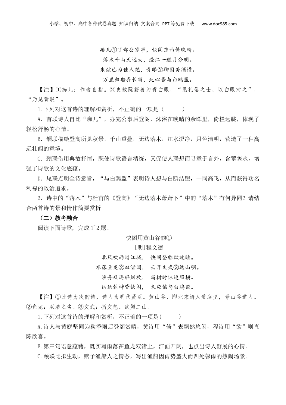 小学、初中、高中各种试卷真题知识归纳文案合同PPT等免费下载www.doc985.com新高考语文60篇必背篇目1(默写)十1(阅读)闯关手册(2025版)第47篇《登快阁》一、默写闯关(一)挖空练习登快阁黄庭坚痴儿了却公家事,快阁东西()晚晴。落木千山天远大,()江一道月分明。朱弦已为佳人绝,青眼()因美酒横。万里归船弄长笛,此心吾与白()盟。附:记忆导图将易写错的字每个写3遍倚澄聊鸥(二)情境默写1.诗句“无边落木萧萧下,不尽长江滚滚来”写景阔远清旷,自古推为名句,《登快阁》中也有类似的诗句:“(),()。”2.黄庭坚在《登快阁》中描绘自己初登快阁亭时所览胜景,展现自己胸襟怀抱的两句是“(),()。”3.《登快阁》中“(),()”透露了诗人对官场生涯的厌倦和对登快阁亭欣赏自然景色的渴望。二、阅读闯关(一)课内阅读阅读下面诗歌,完成1~2题。登快阁黄庭坚小学、初中、高中各种试卷真题知识归纳文案合同PPT等免费下载www.doc985.com痴儿①了却公家事,快阁东西倚晚晴。落木千山天远大,澄江一道月分明。朱弦已为佳人绝,青眼②聊因美酒横。万里归船弄长笛,此心吾与白鸥盟。【注】①痴儿:作者自指。②史载阮籍善为青白眼,“见礼俗之士,以白眼对之”,“乃见青眼”。1.下列对这首诗的理解和赏析,不正确的一项是()A.首联诗人自比“痴儿”,办完公事后登阁,沐浴在晚晴的余晖里,倚栏远眺,体现了轻松舒畅的心情。B.颔联描绘登高所见秋景,千山重叠,无边落木,江水澄净,月色清明,营造了一种高远壮阔的意境。C.颈联借用典故抒情,既使诗歌语言精练,又促使人联想而寻意于言外,含蓄隽永,增强了诗歌的文化底蕴。D.尾联点明全诗意旨,“与白鸥盟”表明诗人想与白鸥结盟,一同高飞,从而获得功名利禄的政治追求。2.诗中的“落木”与杜甫的《登高》“无边落木萧萧下”中的“落木”有何异同?请结合两首诗的景和情作简要赏析。(二)教考融合阅读下面诗歌,完成1~2题。快阁用黄山谷韵①[明]程文德北风吹雨暗江城,快阁登临欲晚晴。水落鱼龙②双渚阔,云开文武③远山明。渔舟乱逐轻烟放,霜树时惊返照横。纳纳乾坤皆快阁,未应偏与白鸥盟。【注】①此诗为次韵诗,诗人为明代贤臣。黄山谷,即北宋诗人黄庭坚,号山谷道人。②鱼龙:双渚之名。③文武:指文笔、武姆二山。1.下列对这首诗的理解和赏析,不正确的一项是()A.诗人与黄庭坚同为秋季雨后登阁赏晴,黄诗用“倚”表飘然悠闲,程诗用“欲”则直陈欣喜。B.第三句语意蕴藉,既实写雨落在鱼龙双渚上,江面开阔,也点出诗人舒展的心情。C.颈联比拟生动,赋予渔船人之情态,写出渔船因雨势盛大而四处躲雨的热闹场景。小学、初中、高中各种试卷真题知识归纳文案合同PPT等免费下载www.doc985.comD.数百年后,诗人登临快阁和诗前人,语陈意新,境界阔大,胸怀广远,气韵端方。2.本诗与黄庭坚《登快阁》尾联“万里归船弄长笛,此心吾与白鸥盟”一样,都写到了“白鸥”,但各有用意,请结合诗句简要分析。对比阅读,完成3、4题。病后登快哉亭①贺铸经雨清蝉得意鸣,征尘断处见归程病来把酒不知厌,梦后倚楼无限情鸦带斜阳投古刹,草将野色入荒城故园又负黄华②约,但觉秋风发上生登快阁黄庭坚痴儿了却公家事,快阁东西倚晚晴.落木千山天远大,澄江一道月分明朱弦已为佳人绝,青眼聊因美酒横万里归船弄长笛,此心吾与白鸡盟。【注】①快哉亭:位于彭城(今徐州)东南,本诗是诗人被贬徐州病后所作。②黄华:菊花3.下列对两首诗的理解和赏析,不正确的一项是()A.贺诗与黄诗都以登楼抒情,贺诗以“病后”登楼引发愁情,黄诗以“了却公事”引发快意B.贺诗“倚楼”黄诗“倚晴”,黄诗用“倚”字虚实相兼地展现了快阁之上的“晚睛”美景C.贺诗与黄诗都以对美酒的贪恋和青睐来消解愁情,黄诗以典故表达了知音难寻的落寞无奈D.黄诗尾联以与鸥鸟相伴来表达归隐之志,贺诗的尾联亦如此,借负菊花之约表达归隐之志.4.同样登高望远,贺诗的颈联和黄诗的领联在意境营造和情感表达上有何不同?请简要分析。(三)拓展迁移阅读下面这首宋诗,完成问题。赣上食莲有感①小学、初中、高中各种试卷真题知识归纳文案合同PPT等免费下...