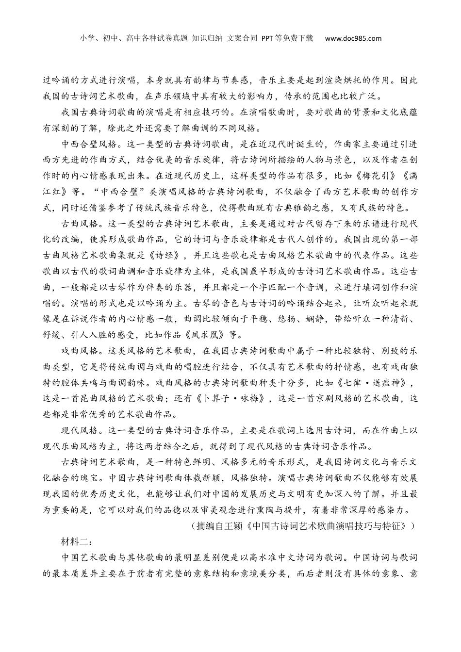小学、初中、高中各种试卷真题知识归纳文案合同PPT等免费下载www.doc985.com新高考语文60篇必背篇目1(默写)十1(阅读)闯关手册(2025版)第46篇《念奴娇·赤壁怀古》一、默写闯关(一)挖空练习念奴娇·赤壁怀古苏轼大江东去,浪()尽,千古风流人物。故垒西边,人道是,三国周()赤壁。乱石穿空,惊涛拍岸,卷起千堆雪。江山如画,一时多少豪杰。遥想公()当年,小乔初嫁了,雄()英发。羽扇()巾,谈笑间,()()灰飞烟灭。故国神游,多情应笑我,早生()发。人生如梦,一()还()江月。附:记忆导图将易写错的字每个写3遍淘郎瑾姿纶樯橹华尊酹(二)情境默写1.《念奴娇·赤壁怀古》中,表现词人凭吊英雄人物,抒发自己壮志难酬的苦闷心情,只好以一杯清酒祭月的诗句:“(),()。”2.在《念奴娇·赤壁怀古》中,作者从视觉和听觉角度,生动描写赤壁雄奇壮阔的景观的句子:“(),(),()。”3.苏轼《念奴娇·赤壁怀古》中“()”一句,写的是周瑜的儒将装束,“()”一句,表明了周瑜的赫赫战功。小学、初中、高中各种试卷真题知识归纳文案合同PPT等免费下载www.doc985.com4.苏轼《念奴娇·赤壁怀古》中,先写“()”,以美女衬英雄;再用“()”,以曹军惨败来突出周瑜英气勃发的形象。二、阅读闯关(一)课内阅读阅读下面唐诗和宋词,完成1-2题。赤壁杜牧折戟沉沙铁未销,自将磨洗认前朝。东风不与周郎便,铜雀①春深锁二乔。念奴娇·赤壁怀古苏轼大江东去,浪淘尽,千古风流人物。故垒西边,人道是,三国周郎赤壁。乱石穿空,惊涛拍岸,卷起千堆雪。江山如画,一时多少豪杰。遥想公瑾当年,小乔初嫁了,雄姿英发。羽扇纶巾,谈笑间,樯橹灰飞烟灭。故国神游,多情应笑我,早生华发。人生如梦,一尊还酹江月。【注】①铜雀,即铜雀台。三国时期,曹操击败袁绍后营建邺都,修建了铜雀、金虎、冰井三台。1.下面对这两首诗词的理解不正确的一项是()A.《赤壁》开头两句,描写发现旧日武器,磨洗辨认朝代的场景,引起人们冷静的历史沉思。B.《赤壁》后两句从正面落笔,选择了周郎以及他倚以致胜的因素——东风来写,含蓄蕴藉。C.《念奴娇·赤壁怀古》上阕即地写景,为风流人物、英雄豪杰——周瑜的出场作了铺垫。D.两诗作者,对同一个历史人物和事件产生了共同的兴趣,挖掘出历史给人的启迪作用。2.请从抒发情感的角度概括这两首诗词的异同之处,并结合文本具体分析。(二)教考融合(一)阅读下面的文字,完成1~5题。材料一:从题材与形式上来分析,我国的古诗词艺术歌曲与西方的艺术歌曲之间存在共同之处,两者都是通过诗词的形式来表现作者的情感与意境。而不同之处在于,中国古诗词主要是通小学、初中、高中各种试卷真题知识归纳文案合同PPT等免费下载www.doc985.com过吟诵的方式进行演唱,本身就具有韵律与节奏感,音乐主要是起到渲染烘托的作用。因此我国的古诗词艺术歌曲,在声乐领域中具有较大的影响力,传承的范围也比较广泛。我国古典诗词歌曲的演唱是有相应技巧的。在演唱歌曲时,要对歌曲的背景和文化底蕴有深刻的了解,除此之外还需要了解曲调的不同风格。中西合璧风格。这一类型的古典诗词歌曲,是在近现代时诞生的,作曲家主要通过引进西方先进的作曲方式,结合优美的音乐旋律,将古诗词所描绘的人物与景色,以及作者在创作时的内心情感表现出来。在近现代历史上,这样类型的作品有很多,比如《梅花引》《满江红》等。“中西合璧”类演唱风格的古典诗词歌曲,不仅融合了西方艺术歌曲的创作方式,同时还借鉴参考了传统民族音乐特色,使得歌曲既有古典雅韵之感,又有民族的特色。古曲风格。这一类型的古典诗词艺术歌曲,主要是通过对古代留存下来的乐谱进行现代化的改编,使其形成歌曲作品,它的诗词与音乐旋律都是古代人创作的。我国出现的第一部古曲风格艺术歌曲集就是《诗经》,并且这些歌也是古曲风格艺术歌曲中的代表作品。这些歌曲以古代的歌词曲调和音乐旋律为主体,是我国最早形成的古诗词艺术歌曲作品。这些古曲,一般都是以古琴作为伴奏的乐器,并且都是一个字匹配一个音调,来进行填词创作和演唱的。演唱的形式也是以吟诵为...