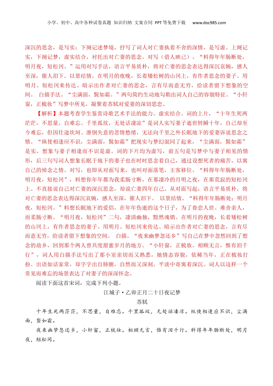 小学、初中、高中各种试卷真题知识归纳文案合同PPT等免费下载www.doc985.com新高考语文60篇必背篇目1(默写)十1(阅读)闯关手册(2025版)第45篇《江城子·乙卯正月二十日夜记梦》一、默写闯关(一)挖空练习江城子•乙卯正月二十日夜记梦苏轼十年生死两茫茫,不思量,自难忘。千里孤坟,无处话凄凉。纵使相逢应不识,尘满面,()如霜。夜来()梦忽还乡,小()窗,正梳()。相顾无言,()有泪千行。料得年年肠断处,明月夜,短松()。附:记忆导图将易写错的字每个写3遍鬓幽轩妆惟冈(二)情境默写1.词中“(),(),()”三句表明妻子死去的时间长,生者难忘死者,思念实在太苦。2.想到爱妻埋在千里之外,无人陪伴,词人感到孤独凄凉的句子:“()、()。”3.“(),(),()”这三个长短句,词人把现实与梦幻混同了起来,将爱妻死后自己的种种忧愤、容颜的苍老、形体的衰败一一展现。4.下阕入题开始“记梦”,“()”是记叙,写自己在梦中忽然回到了故乡,“(),()”是写那小室内,爱妻正在梳妆打扮。5.“(),(),()”三句从梦小学、初中、高中各种试卷真题知识归纳文案合同PPT等免费下载www.doc985.com境落回到现实,词人想象着长眠地下的亡妻一个人在凄冷幽静的明月之夜的心境。【参考答案】1.十年生死两茫茫不思量自难忘2.千里孤坟无处话凄凉3.纵使相逢应不识尘满面鬓如霜4.夜来幽梦忽还乡小轩窗正梳妆5.料得年年肠断处明月夜短松冈二、阅读闯关(一)课内阅读阅读下面这首词,完成各题。江城子•乙卯正月二十日夜记梦苏轼十年生死两茫茫,不思量,自难忘。千里孤坟,无处话凄凉。纵使相逢应不识,尘满面,鬓如霜。夜来幽梦忽还乡,小轩窗,正梳妆。相顾无言,惟有泪千行。料得年年肠断处,明月夜,短松冈。1.对上词解读不正确的项是()A.这是苏轼为悼念原配妻子王弗而写的一首悼亡词,表现了绵绵不尽的哀伤和思念。上片写诗人对亡妻的深沉的思念,是写实。B.“无处话凄凉”既是诗人自己因仕途坎坷、潦倒失意的悲情愁绪,无法向千里之外长眠地下的爱妻诉说,亦包括亡妻亦无法向千里之外的诗人诉说凄凉在内。C.“尘满面,鬓如霜”寥寥数字,刻画的是外部形象,却表现出丰富复杂的思想感情。跟妻子死别十年来的痛苦经历、感情,都含蕴在这六个字之中了。D.下片记述梦境,表达了诗人对亡妻执着不舍的深情。全词浓墨重彩,抒写出对亡妻的情意缠绵,字字血泪,情调凄凉哀婉。2.本词运用了多种表现手法,请结合诗句具体分析。【参考答案】1.D【解析】本题考查学生理解和赏析诗歌思想内容的能力。D.“全词浓墨重彩”错误,该词采用白描手法,比如“小轩窗,正梳妆。相顾无言,惟有泪千行”,出语如话家常,却字字出自肺腑,自然而又深刻,平淡中寄寓着深沉。故选D。2.手法:虚实结合、白描手法、以景结情、对写法等。虚实结合:上阕写词人对亡妻的小学、初中、高中各种试卷真题知识归纳文案合同PPT等免费下载www.doc985.com深沉的思念,是写实;下阕记述梦境,抒写了词人对亡妻执着不舍的深情,是写虚。上阕记实,下阕记梦,虚实结合,衬托出对亡妻的思念。对写(借人映己)。“料得年年肠断处,明月夜,短松冈。”运用对写手法,语言平易质朴,将对亡妻的思念表达得深沉哀婉,感人至深,催人泪下。以景结情。在明月的夜晚,长着矮松树的山冈上,有作者思念的妻子。用明月、短松冈来传达、暗示出作者对亡妻的思念,言有尽而意无穷,给读者留下想象的空间。白描手法。“尘满面,鬓如霜。”两句简约生动地勾勒出词人自己的容貌特征。“小轩窗,正梳妆”写梦中所见,凝聚着苏轼对爱妻的深切思恋。【解析】本题考查学生鉴赏诗歌艺术手法的能力。虚实结合。词的上片,“十年生死两茫茫,不思量,自难忘。千里孤坟,无处话凄凉”是词人实写妻子逝世转瞬十年,自己却至今难忘,但因仕途坎坷、潦倒失意的悲情愁绪,无法向千里之外长眠地下的爱妻诉说思念之情。“纵使相逢应不识,尘满面,鬓如霜”把现实与梦幻混同了起来,“尘满面,鬓如霜”是实,想象与妻子相逢而不识是虚。词的下片均为虚写,前五句是写梦中与妻子相见的情形,后三句写词人想象长眠于...