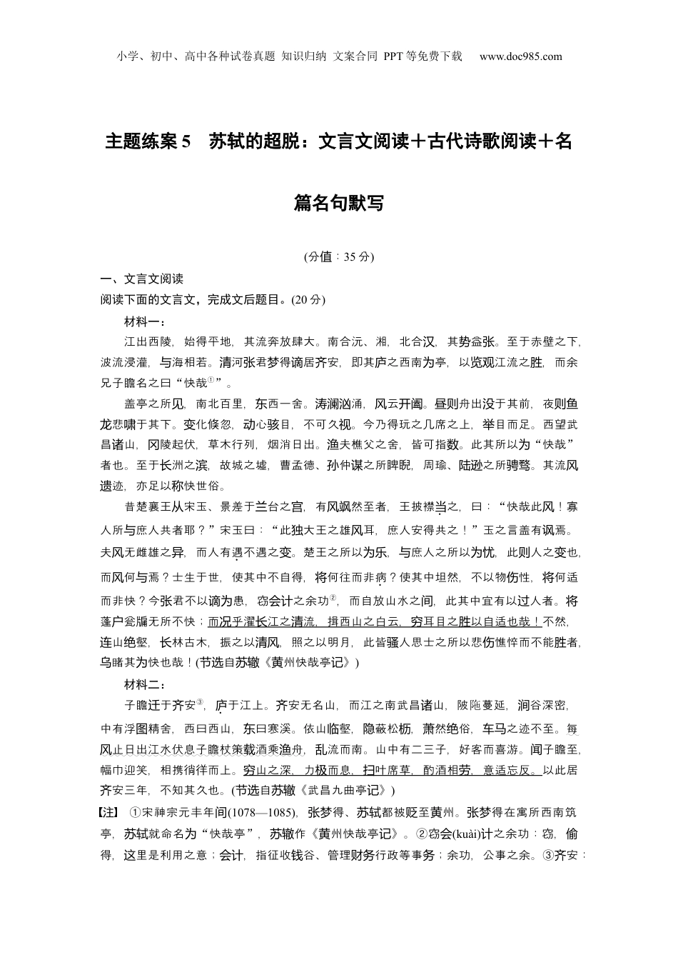 小学、初中、高中各种试卷真题知识归纳文案合同PPT等免费下载www.doc985.com主题练案5苏轼的超脱:文言文阅读+古代诗歌阅读+名篇名句默写(分:值35分)一、文言文阅读阅读下面的文言文,完成文后题目。(20分)材料一:江出西陵,始得平地,其流奔放肆大。南合沅、湘,北合,其益。至于赤壁之下汉势张,波流浸灌,海相若。河君得居安,即其之西南亭,以江流之,而余与清张梦谪齐庐为览观胜兄子瞻名之曰“快哉①”。盖亭之所,南北百里,西一舍。涌,云。舟出于其前,夜见东涛澜汹风开阖昼则没则鱼悲于其下。化倏忽,心目,不可久。今乃得玩之几席之上,目而足。西望武龙啸变动骇视举昌山,陵起伏,草木行列,烟消日出。夫樵父之舍,皆可指。此其所以诸冈渔数为“快哉”者也。至于洲之,故城之墟,曹孟德、仲之所睥睨,周瑜、之所。其流长滨孙谋陆逊骋骛风迹,亦足以快世俗。遗称昔楚襄王宋玉、景差于台之,有然至者,王披襟从兰宫风飒当之,曰:“快哉此!寡风人所庶人共者耶?与”宋玉曰:“此大王之雄耳,庶人安得共之!独风”玉之言盖有焉。讽夫无雌雄之,而人有风异遇不遇之。楚王之所以,庶人之所以,此人之也变为乐与为忧则变,而何焉?士生于世,使其中不自得,何往而非风与将病?使其中坦然,不以物性,何适伤将而非快?今君不以患,窃之余功张谪为会计②,而自放山水之,此其中宜有以人者。间过将蓬瓮牖无所不快;户而乎濯江之流,揖西山之白云,耳目之以自适也哉!况长清穷胜不然,山壑,林古木,振之以,照之以明月,此皆人思士之所以悲憔悴而不能者连绝长清风骚伤胜,睹其快也哉!乌为(自《州快哉亭》节选苏辙黄记)材料二:子瞻于安迁齐③,庐于江上。安无名山,而江之南武昌山,陂齐诸陁蔓延,谷深密,涧中有浮精舍,西曰西山,曰寒溪。依山壑,蔽松,然俗,之迹不至。图东临隐枥萧绝车马每止日出江水伏息子瞻杖策酒乘舟风载渔,流而南。山中有二三子,好客而喜游。子瞻至乱闻,幅巾迎笑,相携徜徉而上。山之深,力而息,叶席草,酌酒相,意适忘反。穷极扫劳以此居安三年,不知其久也。齐(自《武昌九曲亭》节选苏辙记)注①宋神宗元丰年间(1078—1085),得、都被至州。得在寓所西南筑张梦苏轼贬黄张梦亭,就命名苏轼为“快哉亭”,作《州快哉亭》。苏辙黄记②窃会(kuài)之余功:窃,计偷得,里是利用之意;,指征收谷、管理行政等事;余功,公事之余。这会计钱财务务③安齐:小学、初中、高中各种试卷真题知识归纳文案合同PPT等免费下载www.doc985.com古郡名,即州。本文作于宋神宗元丰五年黄(1082),因台案居州。时苏轼乌诗谪黄1.(3分)材料二中画波浪线的部分有三处需要断句,请用铅笔将答题卡上相应位置的答案标号涂黑,每涂对一处给1分,涂黑超过三处不给分。每止日出江水伏息子瞻杖策酒乘舟风载渔答案CFH解析“每止日出风”是整句的,中不,在话时间状语间断开应“出”后,即C;处断开“伏息”的主语为“江水”,中不,在间断开应“息”后,即F;处断开“杖策”“酒载”“乘舟渔”的主都是语“子瞻”,且并“杖策”“酒载”作比密,在此之后这两个动较紧“乘舟渔”,所以在应“酒”后,即H。处断开2.(3分)下列对材料中加点的词语及相关内容的解说,不正确的一项是()A.当,文中指面对着、向着,与《陈情表》中“猥以微贱,当侍东宫”的“当”意思不同。B.遇,文中指被重用,与《庖丁解牛》中“臣以神遇而不以目视”的“遇”意思相同。C.病,文中指忧愁、怨恨,与成语“贫病交加”“病入膏肓”中的“病”意思不同。D.庐,文中指建造房屋,与《五代史伶官传序》中“函梁君臣之首”的“函”用法相同。答案B解析B项“意思相同”。被重用错/接。触A面着、向着项对/承担、担任。C愁、怨项忧恨/疾病。D建造房屋,名活用作项词动词/用匣子装,名活用作。词动词3.(3分)下列对材料有关内容的概述,不正确的一项是()A.长江在到达黄州赤壁之后,气势更加浩大雄壮。张梦得被贬黄州后在江边建造了一座亭子,在这座亭子内就可饱览长江胜景。B.“快哉亭”得名“快哉”,不仅是因为在这座亭子里可以轻松观赏到长江之景,还与这里遗留的历史风云有关。C.苏辙借宋玉与楚襄王...
