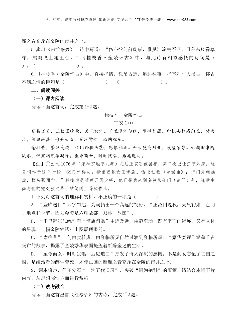 小学、初中、高中各种试卷真题知识归纳文案合同PPT等免费下载www.doc985.com新高考语文60篇必背篇目1(默写)十1(阅读)闯关手册(2025版)第44篇《桂枝香·金陵怀古》一、默写闯关(一)挖空练习桂枝香金陵怀古・王安石登临送目,正故国晚秋,天气初肃。千里()江似练,翠峰如()。归帆去()残阳里,背西风,酒旗斜()。彩舟云淡,星河()起,画图难足。念往昔,繁华()逐,叹门外楼头,悲恨相续。千古凭高对此,()嗟荣辱。六朝旧事随流水,但寒烟衰草凝绿。至今商女,时时犹唱,后庭遗曲。附:记忆导图将易写错的字每个写3遍澄簇梓鹭竞谩(二)情境默写1.《桂枝香·金陵怀古》中,由对美丽江山的描写转入对金陵人文的刻画,远近动静结合的诗句是(),(),()。2.《桂枝香·金陵怀古》中,雄壮宽广的气度,开阔旷远的视野与王勃的《滕王阁序》,千古传诵的“落霞与孤鹜齐飞,秋水共长天一色”可谓异曲同工的名句是:(),()。3.《桂枝香·金陵怀古》一词中,()四字道出了六朝更替的根本原因。4.《桂枝香》一词中,(),(),()抒发了诗人深沉的感慨:不是商女忘记了亡国之恨,是统治者的醉生梦死,才使亡国的靡小学、初中、高中各种试卷真题知识归纳文案合同PPT等免费下载www.doc985.com靡之音充斥在金陵的市井之上。5.窦巩《南游感兴》一诗中写道:“伤心欲问前朝事,惟见江流去不回。日暮东风眷草绿,鹧鸪飞上越王台。”《桂枝香·金陵怀古》中,与此诗有相似感慨的诗句是(),()。6.《桂枝香·金陵怀古》中,直接抒情,凭吊古迹,追述往事,抒写对前人吊古、怀古不满之情的诗句是(),()。二、阅读闯关(一)课内阅读阅读下面这首词,完成第1-2题。桂枝香金陵怀古・王安石①登临送目,正故国晚秋,天气初肃。千里澄江似练,翠峰如簇。归帆去梓残阳里,背西风,酒旗斜矗。彩舟云淡,星河鹭起,画图难足。念往昔,繁华竞逐,叹门外楼头②,悲恨相续。千古凭高对此,谩嗟荣辱。六朝旧事随流水,但寒烟衰草凝绿。至今商女,时时犹唱,后庭遗曲。【注】①公元1076年(宋神宗熙宁九年)之后王安石被罢相,第二次出任江宁知府。这首词作于这个时段。②门外楼头:指南朝陈亡国惨剧。语出杜牧《台城曲》:“门外韩擒虎,楼头张丽华。”韩擒虎是隋朝开国大将,他已带兵来到金陵朱雀门(南门)外,陈后主尚与他的宠妃张丽华于结绮阁上寻欢作乐。1.下列对这首词的理解和赏析,不正确的一项是()A.“登临送目”四字领起,为词拓出一个高远的视野。“正故国晚秋,天气初肃”点明了地点和季节,因为金陵是六朝故都,乃称“故国”。B.“千里澄江似练”至“酒旗斜矗”由近及远,由静至动,既有平面的铺展,又有立体的呈现,一幅金陵锦绣江山图展现眼前。C.“念往昔”一句由实转虚,由登临所见自然过渡到登临所想。“繁华竞逐”涵盖千古兴亡的故事,揭露了金陵繁华表面掩盖着纸醉金迷的生活。D.“至今商女,时时犹唱,后庭遗曲”抒发了诗人深沉的感慨:不是商女忘记了亡国之恨,是统治者的醉生梦死,才使亡国的靡靡之音充斥在金陵的市井之上。2.词本倚声,但王安石“一洗五代旧习”,突破“词为艳科”的藩篱,请结合本词下片内容,从思想感情方面进行赏析。(二)教考融合阅读下面这首出自《红楼梦》的古诗,完成1~2题。小学、初中、高中各种试卷真题知识归纳文案合同PPT等免费下载www.doc985.com梦玉人引范成大①共登临处,飘风袂、倚空碧。雨卷云飞,长有桂娥②看客。箫鼓生春,遍锦城如画,雪山无色。一梦才成,恍天涯南北。舞余歌罢,料宣华③、回首尽陈迹。万里秦吴,有情应问消息。我欲归耕,如何重来得。故人若望江南,且折梅花相忆。【注】①范成大,南宋名臣、诗人,曾任成都路制置使,作此词时词人任建康知府,本词是写给蜀地友人之作。②桂娥,指嫦娥。③宣华,宜华夫人陈氏,南北朝时南朝陈宜帝女、陈后主之妹。隋开皇九年,隋灭陈,陈氏与其他陈皇室成员作为俘虏从建康西人大兴(今西安),后被选为南文帝嫔妾。1.下列对这首诗的理解和赏析,不正确的一项是()A.词人曾与故友一起登高赏景、凭栏远望,蕴含着对以往美好时光的怀念之情。B.词人...