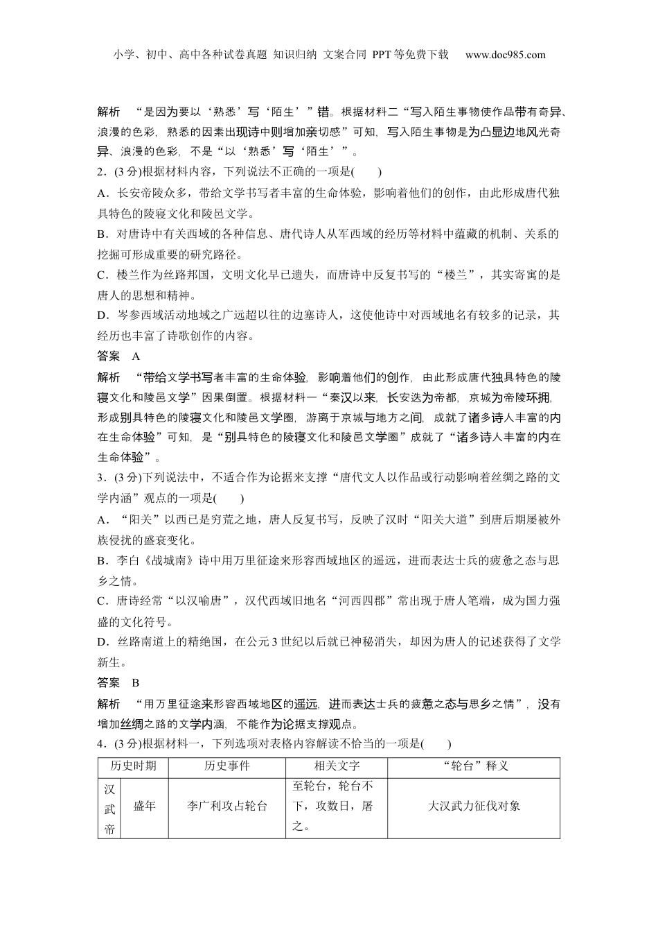 小学、初中、高中各种试卷真题知识归纳文案合同PPT等免费下载www.doc985.com主题练案4唐诗和李杜:信息类阅读+散文阅读+古代诗歌阅读(分:值43分)一、信息类阅读阅读下面的文字,完成文后题目。(18分)材料一:唐代路沿人文存文人活、文作文化播的系究,可主要方丝线遗与动学创与传关研从两个面展。一方面是唐至北宋路沿的各存古迹文人活、文作文化播的影开丝线类遗对动学创与传。共性角度看,又可此路切分三元。首先,中古迹群文人活文响从时将线为个单关对动与学作的影。中古迹多,其中尤以殿、帝陵和宗迹最有名。殿巨,之创响关众宫教遗为宫丽与赋精神相合,其中尤以杜牧《阿房》最有名。些作所的阿房、未央、大明宫赋为这赋书写宫宫等殿群的史或照均唐人的盛世文范,包天地之心,宫宫历记忆现实观属学书写畴举并烛见时代治精神。因白居易《恨歌》在殿政治意之外,展出其浪礼华清宫与兴庆宫则长宫蕴书写现漫唯美的一面。秦以,安迭帝都,京城帝陵,形成具特色的陵文化和陵汉来长为为环拥别寝邑文圈,游离于京城地方之,成就了多人丰富的在生命体。山、南山是学与间诸诗内验华终中久盛名的山川,帝都在空上形成巨大的力,王、李白、杜甫、愈等卓一关负与间张维韩绝代的大人在心其充感情,借此成他叩仙道天人系的重要体和思诗内对满复杂并为们问与关载考人生退出的重要所。其次,河西走廊人文存的文作。进处场遗学写“陇头”是河西走廊上最具影的文意象,由于其在人文地理面富有特殊价,故使响学层值“陇头诗”成唐中的为诗重要材,也成中文中征人、游子思家的精神寄托。就其涵而言,容主题为国学乡恋内书写内要包括塞事、征人思、大漠光、俗等,分展出凉、悲和豪三情边战乡风陇头风别现苍壮迈种感,体了古代士人待现对“家”与“国”的矛盾心理和忠孝念的撞,最使其典化观碰并终经中文作中的重要意象。最后,西域古迹群文人活文作也有重要影。西为国学写对动与学创响域,民族多,文化多元。之路在天山南北麓共分三道路向西通行,也因此形辽阔众丝绸两条成了西域文作的洲化,体出交通路的分文作和播的差。此外,唐代学创绿现线异与学创传异歌中大量存在着有西域的地名、人物、器皿、民俗等,多人都先后有西域的诗关许诗从军经,但期以界注的焦点主要停留在材料掘整理面,而缺乏其背后机制、历长来学关还发与层对系的深入掘,或是日后此方面究的重要手。关挖这许研抓而另一方面,文文本又具有主性,表出文本作者所理解的地方意。英者学观达义国学迈克·克朗,认为“文作品不能被地方的描述,我可借助文作品了解人想学视为对简单们学们象中的地方……些充想象的描述可使者到一地方特的情或特色。由于人这满读认识个独风们可各媒介了解到不同的地方,所以多人一地方的了解在眼所之前就已形成从种数对个亲见经了”,所以人透些作品的,可以出作者某一特定空地域之地方性的理解们过对这阅读读对间。基于此点可知,唐代文人作受到路沿人文存的潜在影和制,千万行走其地创丝线遗响约时个小学、初中、高中各种试卷真题知识归纳文案合同PPT等免费下载www.doc985.com的文家也以作品或行影着之路的文涵。首先,再地方典型的景。例如学动响丝绸学内现观轮台一地名,这汉“台轮”位于天山之南,而唐治所位于天山之北,唐台治的巨大时则汉轮县差和唐代前后期治域的伸,使异统区缩“台轮”在唐代文的前后期作中成一悲喜俱学创为个存的地理符和文意象。其次,文作重路失的地方文化。是代路上的号学学写构丝遗楼兰汉丝一邦,后沙所掩,但唐人却通反吟咏个国为黄过复书写“楼兰”,最借助想象回,建终与忆起文中的构诗“楼兰”意象,展出代力强盛、英雄出的崇拜,体出唐人强烈的现对汉国辈现功名意、取精神和的度价。识进对战争态与评(摘自王《路人文存唐代文的西域》编伟丝遗与学书写)材料二:西域文化丰富了唐代歌作的容,西域光、歌舞、人物、服、用具都入唐代诗创内风饰进人的野。岑的诗视参70多首塞出边诗现“沙、沙、碛碛”37次,“台轮”18次,“火山”11次,“白草”11次,“海热”4次,“雪海”3次,“胡虏”29次。他次西北幕两军供,活地域广,超以往任何一位塞人。的定了他的中西域地名...