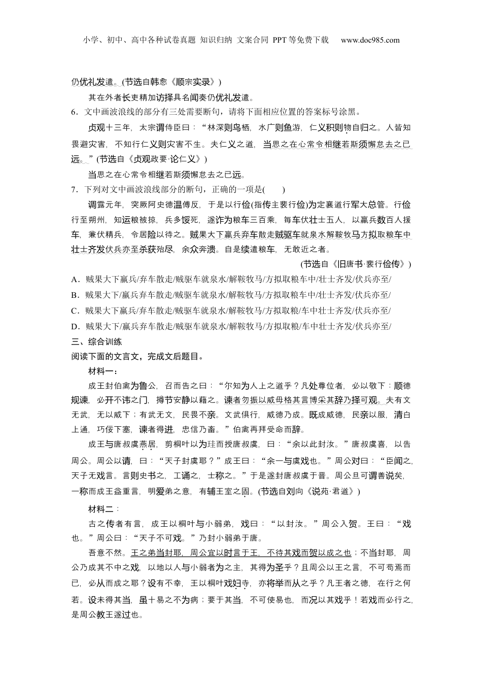 小学、初中、高中各种试卷真题知识归纳文案合同PPT等免费下载www.doc985.com对点练案21精准断开句读一、名句默写1.补写出下列句子中的空缺部分。(1)《论语·述而》中,孔子曾告诫弟子“__________________,________________”;《论语·里仁》中,孔子用“见贤思齐焉,见不贤而内自省也”两句表达了类似意思。(2)《庖丁解牛》中的解牛之“道”是“依乎天理”“因其固然”,而《种树郭橐驼传》中的种树之“道”是“________________,______________”,两者异曲同工。(3)“影”是古诗文中常见的意象,古代文人常借以表达孤独之感,比如:“______________,____________________。”二、专项训练(一)高考题2.(2021·全甲改国编)文中画波浪线的部分有三处需要断句,请将下面相应位置的答案标号涂黑。契丹大入寇以寇深入中外震召群臣方略。举时虏骇问王若,江人,幸金陵;钦临请陈尧叟,州人,幸成都。帝以寇准,准曰:阆请问“不知陛下此二策?谁为画”帝曰:“卿姑断其可否,勿其人也。问”准曰:“臣欲得策之人,以鼓,然后北伐耳!献斩衅”(自《宋史事本末节选纪·契丹盟好》)契丹大入寇以寇深入中外震召群臣方略。举时虏骇问(二)模拟题3.文中画波浪线的部分有三处需要断句,请将下面相应位置的答案标号涂黑。文丞相(指文天祥)甫冠奉廷,即口家大。未几元兵渡江,又上乞嬖近之对极论国计书斩主幸者,以一人心安社稷,固已盖天下矣。迁议气自是而焉力竭扶持危以断断殚谋颠兴复为己任。阻,百挫千折,有而无退,不幸亡身,而大愈明。虽险艰难进国执义(自士奇《重修文丞相祠》节选杨记)自是而焉力竭扶持危以己任。断断殚谋颠兴复为4.文中画波浪线的部分有三处需要断句,请将下面相应位置的答案标号涂黑。晋公不君厚以雕台上人而其辟丸也。灵敛墙从弹观宰夫胹熊不熟蹯,之,杀寘畚诸,使人以朝。盾、士季其手,其故,而患之。妇载过赵见问(自《左节选传·宣公二年》)晋公不君厚以雕台上人而其辟丸也。灵敛墙从弹观5.文中画波浪线的部分有三处需要断句,请将下面相应位置的答案标号涂黑。二月甲子,上御丹,大赦天下。自元二十一年二月二十四日昧爽已前,大辟已下凤门贞,罪无重,常赦所不原者,咸赦原之。色人中,有才行兼茂,明于理体者;精深,可轻诸经术法者;于吏理,可使政者;宜委常官各所知。为师达从参举其在外者吏精加具名奏长访择闻小学、初中、高中各种试卷真题知识归纳文案合同PPT等免费下载www.doc985.com仍遣。优礼发(自愈《宗》节选韩顺实录)其在外者吏精加具名奏仍遣。长访择闻优礼发6.文中画波浪线的部分有三处需要断句,请将下面相应位置的答案标号涂黑。十三年,太宗侍臣曰:贞观谓“林深栖,水广游,仁则鸟则鱼义积则物自之。人皆知归畏避灾害,不知行仁灾害不生。夫仁之道,义则义思之在心常令相若斯懈怠去之已当继须。远”(自《政要节选贞观·仁》论义)思之在心常令相若斯懈怠去之已。当继须远7.下列对文中画波浪线部分的断句,正确的一项是()露元年,突厥阿史德傅反,于是以行调温俭(指主裴行传俭)定襄道行大管。行为军总俭行至朔州,知粮被掠,兵多死,遂粮三百乘,每伏士五人,以羸兵百人援运馁诈为车车壮数,兼伏精兵,令居以待之。车险果大下羸兵弃散走就泉水解鞍牧方取粮中贼车贼驱车马拟车士伏兵亦至壮齐发殆,余奔。自是遣粮,无敢近之者。杀获尽众溃续车(自《唐节选旧书·裴行》俭传)A.贼果大下羸兵/弃车散走/贼驱车就泉水/解鞍牧马/方拟取粮车中/壮士齐发/伏兵亦至/B.贼果大下/羸兵弃车散走/贼驱车就泉水/解鞍牧马/方拟取粮车中/壮士齐发/伏兵亦至/C.贼果大下羸兵/弃车散走/贼驱车就泉水/解鞍牧马/方拟取粮/车中壮士齐发/伏兵亦至/D.贼果大下/羸兵弃车散走/贼驱车就泉水/解鞍牧马/方拟取粮/车中壮士齐发/伏兵亦至/三、综合训练阅读下面的文言文,完成文后题目。材料一:成王封伯禽公,召而告之曰:为鲁“尔知人上之道乎?凡尊位者,必以敬下:德为处顺,必不之,撙安以藉之。规谏开讳门节静者勿振以威毋格其言博采其乃可。谏辞择观夫有文无武,无以威下;有武无文,民畏不。文武俱行,威德乃成。成威德,民以服,白亲既亲清上通,巧佞下...