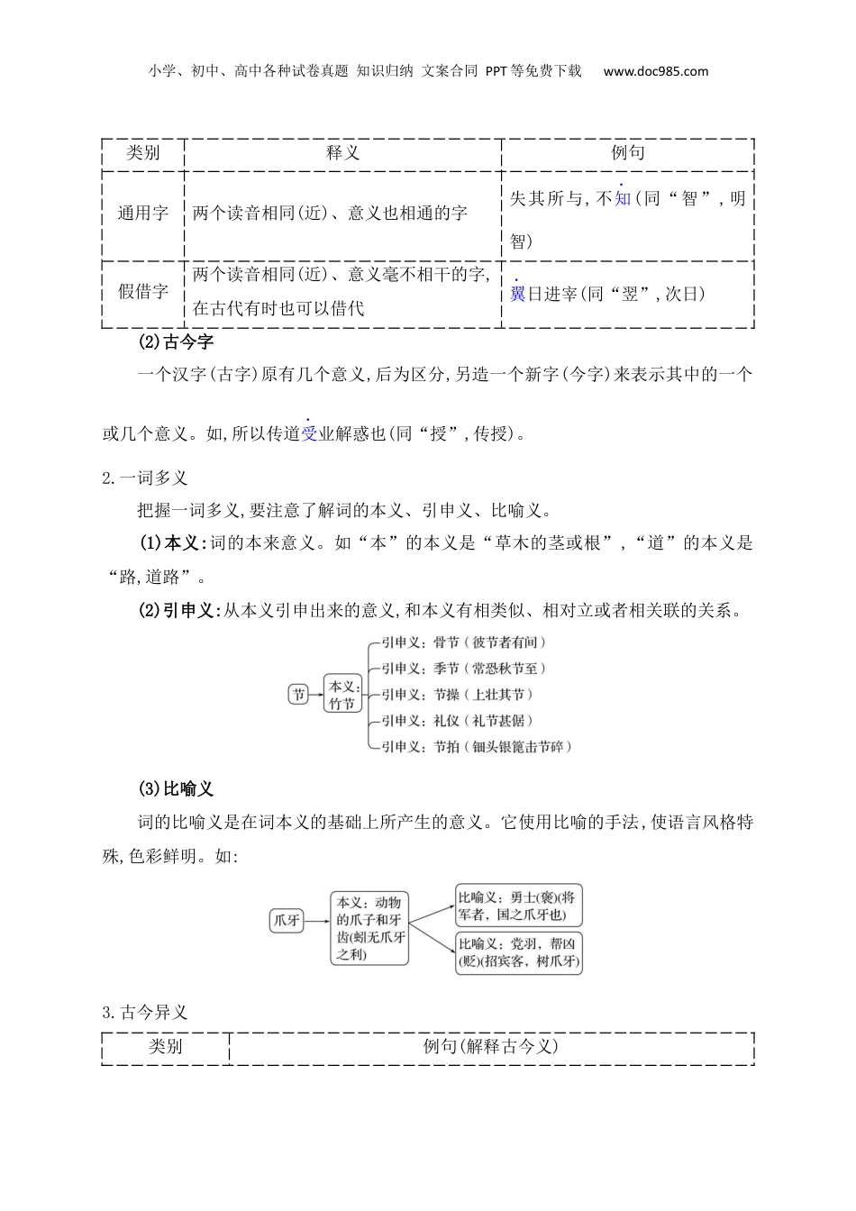 小学、初中、高中各种试卷真题知识归纳文案合同PPT等免费下载www.doc985.com【2025高考一轮复习考点专题精讲】第二部分古代诗文阅读文言文阅读五法推断文言实词,解除翻译疑难杂症——文言实词推断教学目标掌握文言实词一词多义、古今异义的正确判断法教学重点结合具体语境,根据上下文准确判断多义词及古今异义词的准确含义。教学难点结合具体语境,根据上下文准确判断多义词及古今异义词的准确含义。教学过程【命题初探·微观考情】文言实词主要指名词、动词、形容词和数量词,这些词是构成文言文的主体。2022年新高考卷将实词的理解和文化常识融合在一个选择题中,考查的形式为课内外词义结合;全国甲卷和乙卷,则采用与课内词语比较的形式直接考查了文言实词的含义,特别是多义词和古今异义词。文言文断句、文意理解、语句翻译和简答题都是对文言实词的间接考查,因此,准确理解文言实词的含义是文言文复习的重要一环。真题示例:【2024年文言文翻译题】(2024年新高考1卷)13.把材料中画横线的句子翻译成现代汉语。(1)愿得自当一队,到兰干山南以分单于兵,毋令专乡贰师军。(2)李陵曰“思一得当以报汉”,愧苏武而为之辞也。其背逆也,固非迁之所得而文焉者也。【答案】(1)我愿意亲自率领一支队伍,到兰干山南面去分散单于的兵力,不让他全小学、初中、高中各种试卷真题知识归纳文案合同PPT等免费下载www.doc985.com力对付贰师将军的军队。(2)李陵说“我是想找一个适当的机会来报答汉朝”,只不过是见到苏武义举感到惭愧而找的借口。他的背叛,本来就不是司马迁所能文饰的。【解析】实词得分点:(1)“当”,主持,引申为率领;“专”,专门,可意译为“全力”;“乡”,同“向”,朝着某个方向前进,引申为对付。(2)“得当”,适当的机会;“愧”,感到惭愧;“文”,文饰,掩饰。(2024年新高考2卷)13.把材料中画横线的句子翻译成现代汉语。(1)吾求公数岁,公辟逃我,今公何自从吾儿游乎?(2)却军还众,不犯魏境者,贤干木之操,高魏文之礼也。【答案】:(1)我访求先生们好几年了,先生们都逃避我,现在先生们为何自愿跟随我儿交游呢?(2)撤回军队,不去侵犯魏国领土,是因为秦军尊重段干木操行贤良,推崇魏文侯的礼义。【解析】实词得分点::(1)“辟”,通“避”,逃避,躲避;“自”,自愿;“游”,交游。(2)“……者,……也”,……的原因是……,……是因为;“贤”,以……为贤;“高”,形容词做动词,推崇。(2023年全国甲卷)13.把文中画横线的句子翻译成现代汉语。(1)操使霸出二人,霸曰:“霸所以能自立者,以不为此也。”(2)吾前听谗言,与汝父大义不笃,以此负汝。【答案】:(1)曹操让臧霸交出那两个人,臧霸说:“我之所以能够自立的原因,是因为不做这样的事情。”(2)我以前听信谗言,与令尊的关系不够深厚,因此辜负了你。【解析】实词得分点::(1)“出”,交出;“所以”,……的原因;“以”,因为;“者……也”,表判断。(2)“汝”,你;“笃”,深厚;“负”,辜负。【文言实词·必备知识】1.通假字(1)通假字小学、初中、高中各种试卷真题知识归纳文案合同PPT等免费下载www.doc985.com类别释义例句通用字两个读音相同(近)、意义也相通的字失其所与,不知(同“智”,明智)假借字两个读音相同(近)、意义毫不相干的字,在古代有时也可以借代翼日进宰(同“翌”,次日)(2)古今字一个汉字(古字)原有几个意义,后为区分,另造一个新字(今字)来表示其中的一个或几个意义。如,所以传道受业解惑也(同“授”,传授)。2.一词多义把握一词多义,要注意了解词的本义、引申义、比喻义。(1)本义:词的本来意义。如“本”的本义是“草木的茎或根”,“道”的本义是“路,道路”。(2)引申义:从本义引申出来的意义,和本义有相类似、相对立或者相关联的关系。(3)比喻义词的比喻义是在词本义的基础上所产生的意义。它使用比喻的手法,使语言风格特殊,色彩鲜明。如:3.古今异义类别例句(解释古今义)小学、初中、高中各种试卷真题知识归纳文案合同PPT等免费下载www.doc985.com词义扩大小子无所畏,何敢助妇语。古义:指小孩子。今义:北方人称男孩;对青年人的鄙...