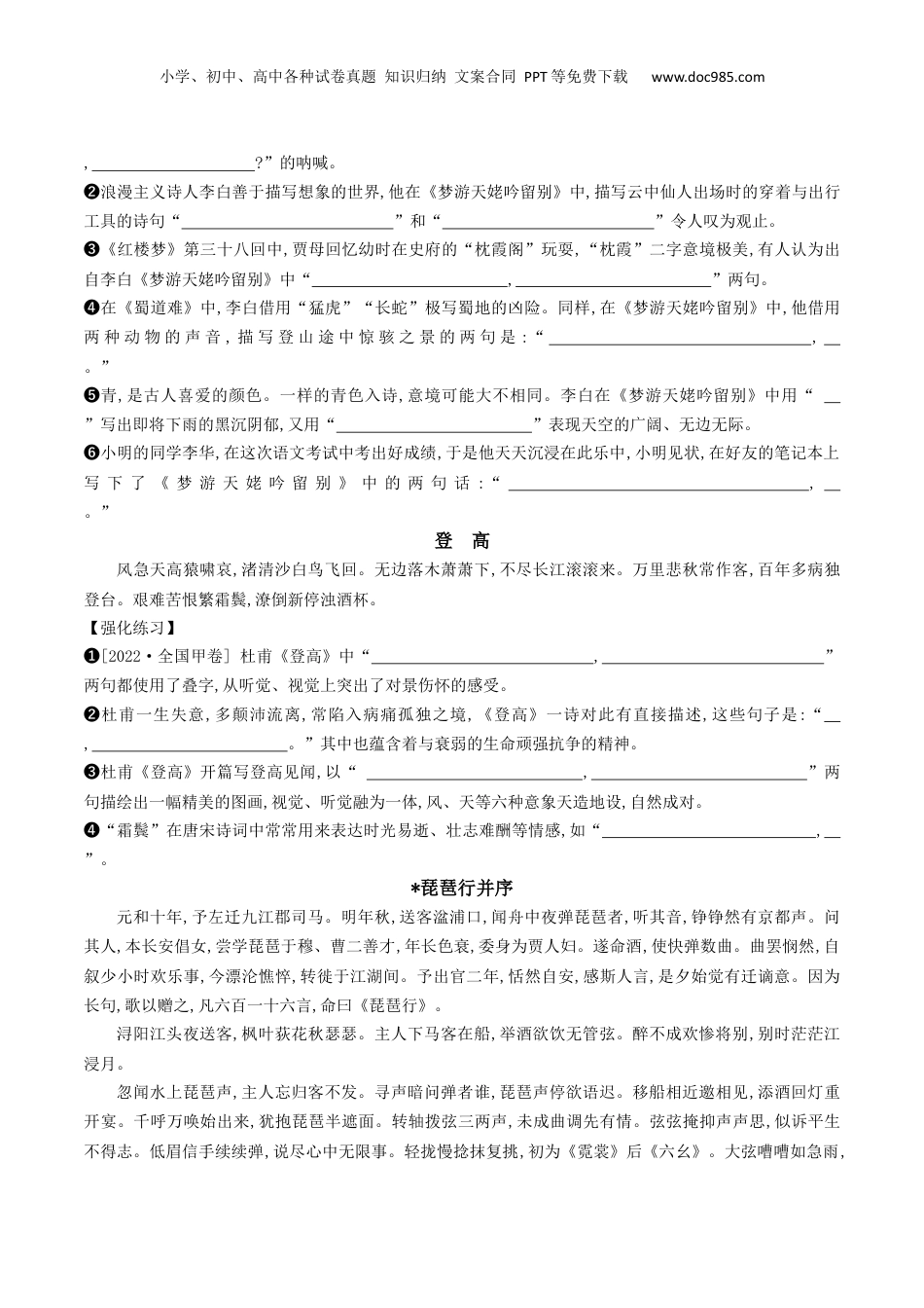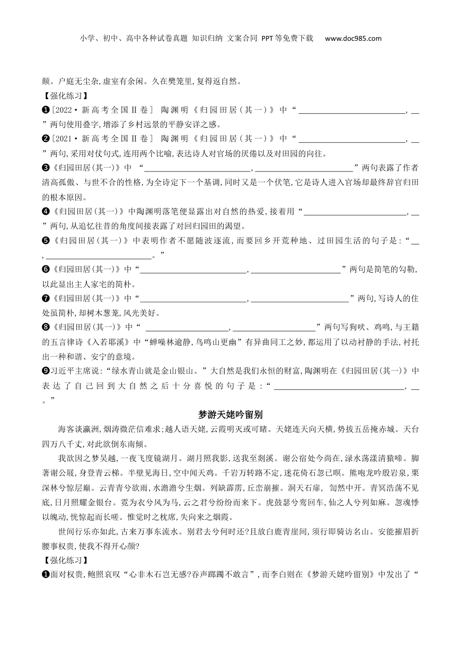 小学、初中、高中各种试卷真题知识归纳文案合同PPT等免费下载www.doc985.com【2025高考一轮复习考点专题助记】2025高考一轮复习文言文知识助记2025高考古诗文60篇背诵篇目过关助记一、必修上册短歌行对酒当歌,人生几何!譬如朝露,去日苦多。慨当以慷,忧思难忘。何以解忧?唯有杜康。青青子衿,悠悠我心。但为君故,沉吟至今。呦呦鹿鸣,食野之苹。我有嘉宾,鼓瑟吹笙。明明如月,何时可掇?忧从中来,不可断绝。越陌度阡,枉用相存。契阔谈讌,心念旧恩。月明星稀,乌鹊南飞。绕树三匝,何枝可依?山不厌高,海不厌深。周公吐哺,天下归心。【强化练习】❶[2022·新高考全国Ⅱ卷]曹操《短歌行》中“,”两句,后世一直传诵不已,苏轼《赤壁赋》中就曾引用过。❷《短歌行》中“,?”两句,把贤才比作光照宇内、可望而不可即的明月,表达了对贤才的渴望。❸《短歌行》中借用《诗经》中姑娘思念情人来形容渴望得到贤才的诗句是:“,。”❹《短歌行》中写诗人在酒席上歌声激越不平、忧郁长久难遣的诗句是:“,。”❺借酒浇愁是很多忧愁幽思之人的选择,李白曾放声高歌“五花马、千金裘,呼儿将出换美酒,与尔同销万古愁”,曹操在《短歌行》中运用设问表达此情的诗句是:“?。”❻《短歌行》中“,”两句,曹操以周公自比,表示自己胸怀大志,像周公一样热切殷勤地接待贤才,有着一统天下的愿望。❼小明在写作文时,想要列举表达古诗中喝酒之后听歌和感叹人生短促的句子,就想起了《短歌行》中的两句诗是:“,!”❽《谏逐客书》中有“太山不让土壤,故能成其大;河海不择细流,故能就其深”的句子,这样的意思,曹操在《短歌行》中用“,”两句诗表现了出来。❾“露”是由水蒸气在夜晚遇冷凝结而成,具有鲜明的时令特征,也常常寄托了人们内心的情感,古代关于“露”的诗文很多,如“,”。*归园田居(其一)少无适俗韵,性本爱丘山。误落尘网中,一去三十年。羁鸟恋旧林,池鱼思故渊。开荒南野际,守拙归园田。方宅十余亩,草屋八九间。榆柳荫后檐,桃李罗堂前。暧暧远人村,依依墟里烟。狗吠深巷中,鸡鸣桑树小学、初中、高中各种试卷真题知识归纳文案合同PPT等免费下载www.doc985.com颠。户庭无尘杂,虚室有余闲。久在樊笼里,复得返自然。【强化练习】❶[2022·新高考全国Ⅱ卷]陶渊明《归园田居(其一)》中“,”两句使用叠字,增添了乡村远景的平静安详之感。❷[2021·新高考全国Ⅱ卷]陶渊明《归园田居(其一)》中“,”两句,采用对仗句式,连用两个比喻,表达诗人对官场的厌倦以及对田园的向往。❸《归园田居(其一)》中“,”两句表露了作者清高孤傲、与世不合的性格,为全诗定下一个基调,同时又是一个伏笔,它是诗人进入官场却最终辞官归田的根本原因。❹《归园田居(其一)》中陶渊明落笔便显露出对自然的热爱,接着用“,”两句,从追忆往昔的角度间接表露了对回归园田的渴望。❺《归园田居(其一)》中表明作者不愿随波逐流,而要回乡开荒种地、过田园生活的句子是:“,。”❻《归园田居(其一)》中“,”两句是简笔的勾勒,以此显出主人家宅的简朴。❼《归园田居(其一)》中“,”两句,写诗人的住处虽简朴,却树木葱茏,风光美好。❽《归园田居(其一)》中“,”两句写狗吠、鸡鸣,与王籍的五言律诗《入若耶溪》中“蝉噪林逾静,鸟鸣山更幽”有异曲同工之妙,都运用了以动衬静的手法,衬托出一种和谐、安宁的意境。❾习近平主席说:“绿水青山就是金山银山。”大自然是我们永恒的财富,陶渊明在《归园田居(其一)》中表达了自己回到大自然之后十分喜悦的句子是:“,。”梦游天姥吟留别海客谈瀛洲,烟涛微茫信难求;越人语天姥,云霞明灭或可睹。天姥连天向天横,势拔五岳掩赤城。天台四万八千丈,对此欲倒东南倾。我欲因之梦吴越,一夜飞度镜湖月。湖月照我影,送我至剡溪。谢公宿处今尚在,渌水荡漾清猿啼。脚著谢公屐,身登青云梯。半壁见海日,空中闻天鸡。千岩万转路不定,迷花倚石忽已暝。熊咆龙吟殷岩泉,栗深林兮惊层巅。云青青兮欲雨,水澹澹兮生烟。列缺霹雳,丘峦崩摧。洞天石扉,訇然中开。青冥浩荡不见底,日月照耀金银台。霓为衣兮风为马,云之君兮纷纷而来下。虎鼓瑟兮鸾回车,仙之人兮列如麻。忽魂悸以魄动,恍惊起而长嗟。惟觉时之枕席,失向来之烟霞。世间行乐亦如此,古来万事东流...