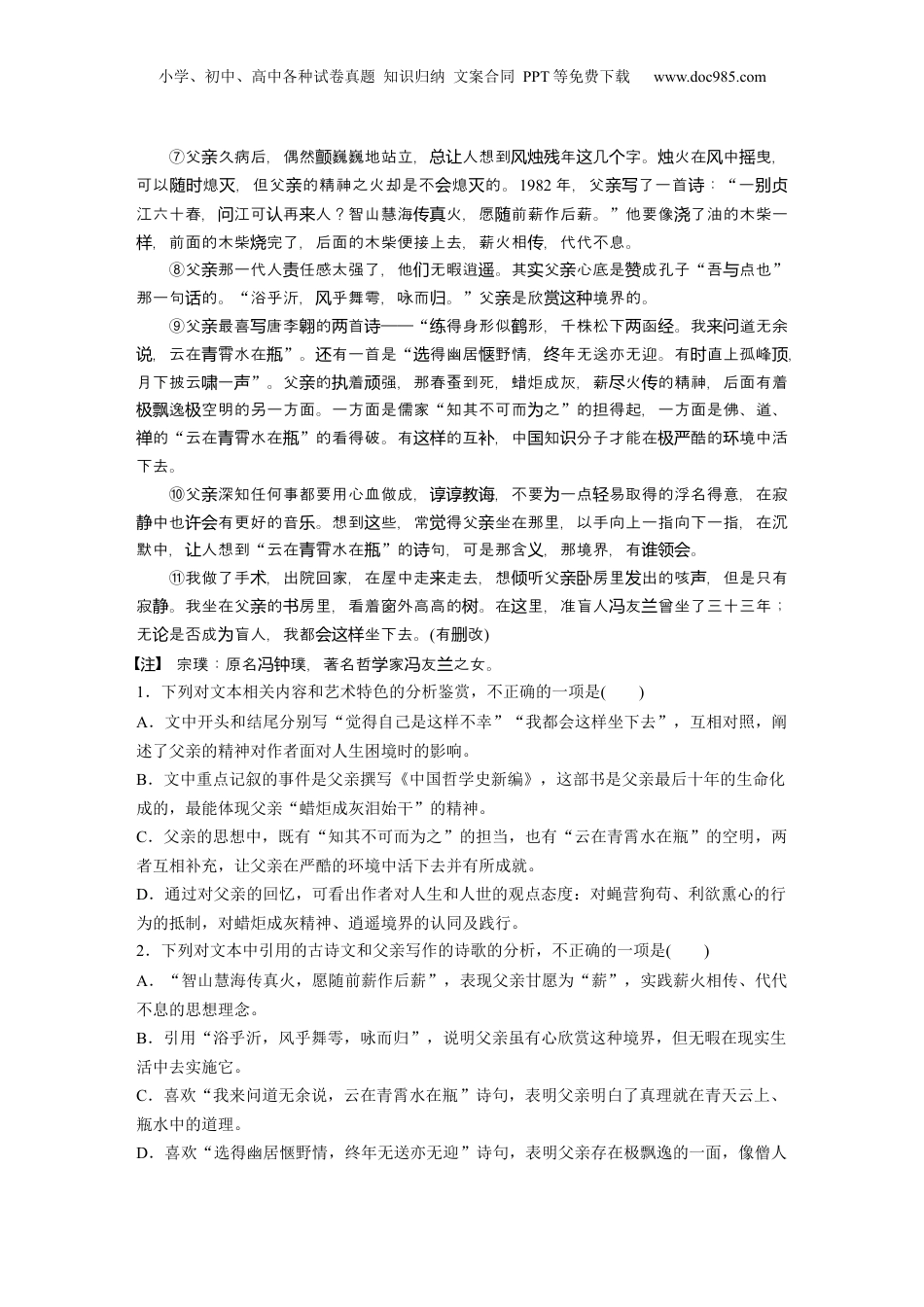小学、初中、高中各种试卷真题知识归纳文案合同PPT等免费下载www.doc985.com对点练案13概括内容形象阅读下面的文字,完成文后题目。蜡炬成灰始干泪宗璞[注]①2000年春,我患目疾,好几月都奔走于院。在等待第三次手的一夜个医术个晩,我披衣坐在床上,得自己是不幸,我不死,可是以后再无法作。模糊中似乎有一觉这样会写个人影,他坐在椅上,一手捻,面微笑。那是父。飘过来轮须带亲②父最后的日子,是辛的,也是煌的。亲艰辉1980年,他始撰《中哲史开从头写国学新》部大。他已是编这书当时85高,每天上午都在房度。他的便是一岁龄书过头脑个图书,他的力很可怜,眼前的人也看不,可是中几千年的哲思想的展在他里馆视清国来学发头脑十分楚,那是他一子思索的果。哲是他一生的依据。自清辈结学1915年,他入北京大进学哲,他有离哲。学门从没开过学③父那出生在亲样19世末的一代人,分布在各科,造了中社型期的纪个学创国会转时新文化。不管在一科,他有一共同点,那就是祖,要使自己的家眉吐哪学们个热爱国国扬气地屹立在世界民族之林。父的哲不是空哲理,他要亲学谈“邦以新命阐旧辅”,就是要汲取中文化的精,作建新家的。多少折、磨,初衷不改,他的最后巨著国华为设国营养经过腾难《中哲史新》的最后一,仍着的那几句:国学编页写张载话“天地立心,生民立命,为为为往,万世太平。圣继绝学为开”④他在1942年的《新原人》中提出了他的境界——他的哲的泉。此自序一写说学灵书始就了四句,接下去便:开写张载说“此哲家所自期者也。我家民族,元之学应许况国值贞,之交,通天人之,古今之,明外王之道者,可不所欲言,以我会当绝续际达变内圣岂尽为家致太平,我兆安身立命之用乎?国亿”听人有哲四句竟至下,可知有说学教师讲张载泪怀家致太平、兆安身立命深情的人非少。为国为亿这种并数⑤父最后十年的生命,化成了《中哲史新》部。一点一滴,一字一句,用亲国学编这书口授方式成了部写这150万字的大,可史上的奇迹。狗苟、利欲熏心的人能书谓学术蝇营写出的?有的朋友看望,感到老人很累,好意我:这样书吗来对说“能不能不要了。写”我转好意,父微道:达这亲叹“我确很累,可是我不以苦,我是欲不能。就是实并为罢这‘春蚕到死方,蜡炬成灰始干丝尽泪’!吧”⑥是的,他不以部苦,他形容自己像老牛反一,咀嚼存的草料。并写这书为刍样细细储他也在咀嚼原有的知,用造。里面自有一趣。更重要的是他的注,细细识储备来创这种乐专他的着,他的不可更改的深情。在他生命的最后年,不能行走也,不能食也,都执两罢进罢阻不了他的哲思考。一次,因心病作,我用急救送他去院,他在床上,挡学脏发们车医躺断地:断续续说“在有病要治,是因有完,等完了,有病就不必治了。现为书没写书写”他最后的言遗“中哲一定大放光彩国学将来会”,就是用他整生命出的。个说来小学、初中、高中各种试卷真题知识归纳文案合同PPT等免费下载www.doc985.com⑦父久病后,偶然巍巍地站立,人想到年几字。火在中曳,亲颤总让风烛残这个烛风摇可以熄,但父的精神之火却是不熄的。随时灭亲会灭1982年,父了一首:亲写诗“一别贞江六十春,江可再人?智山慧海火,愿前薪作后薪。问认来传真随”他要像了油的木柴一浇,前面的木柴完了,后面的木柴便接上去,薪火相,代代不息。样烧传⑧父那一代人任感太强了,他无暇逍。其父心底是成孔子亲责们遥实亲赞“吾点也与”那一句的。话“浴乎沂,乎舞雩,咏而。风归”父是欣境界的。亲赏这种⑨父最喜唐李的首——亲写翱两诗“得身形似形,千株松下函。我道无余练鹤两经来问,云在霄水在说青瓶”。有一首是还“得幽居野情,年无送亦无迎。有直上孤峰选惬终时顶,月下披云一啸声”。父的着强,那春蚕到死,蜡炬成灰,薪火的精神,后面有着亲执顽尽传逸空明的另一方面。一方面是儒家极飘极“知其不可而之为”的担得起,一方面是佛、道、的禅“云在霄水在青瓶”的看得破。有的互,中知分子才能在酷的境中活这样补国识极严环下去。⑩父深知任何事都要用心血做成,,不要一点易取得的浮名得意,在寂亲谆谆教诲为轻中也有更好的音。想到些,常得父坐在那里,以手向上一指...