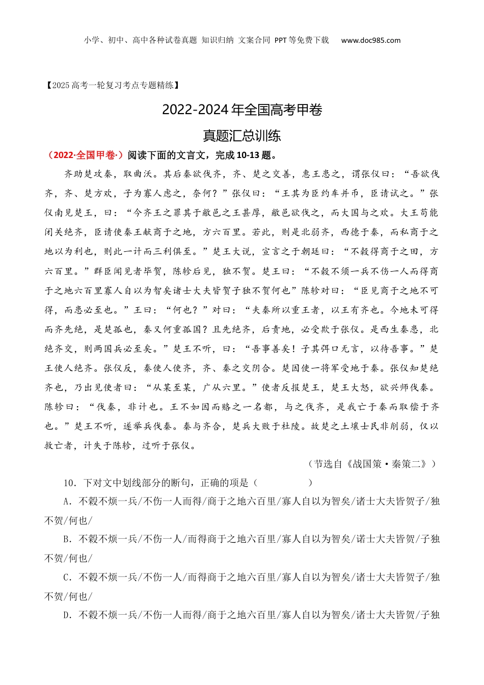 小学、初中、高中各种试卷真题知识归纳文案合同PPT等免费下载www.doc985.com【2025高考一轮复习考点专题精练】2022-2024年全国高考甲卷真题汇总训练(2022·全国甲卷·)阅读下面的文言文,完成10-13题。齐助楚攻秦,取曲沃。其后秦欲伐齐,齐、楚之交善,惠王患之,谓张仪曰:“吾欲伐齐,齐、楚方欢,子为寡人虑之,奈何?”张仪曰:“王其为臣约车并币,臣请试之。”张仪南见楚王,曰:“今齐王之罪其于敝邑之王甚厚,敝邑欲伐之,而大国与之欢。大王苟能闭关绝齐,臣请使秦王献商于之地,方六百里。若此,则是北弱齐,西德于秦,而私商于之地以为利也,则此一计而三利俱至。”楚王大说,宣言之于朝廷曰:“不榖得商于之田,方六百里。”群臣闻见者毕贺,陈轸后见,独不贺。楚王曰:“不榖不须一兵不伤一人而得商于之地六百里寡人自以为智矣诸士大夫皆贺子独不贺何也”陈轸对曰:“臣见商于之地不可得,而患必至也。”王曰:“何也?”对曰:“夫秦所以重王者,以王有齐也。今地未可得而齐先绝,是楚孤也,秦又何重孤国?且先绝齐,后责地,必受欺于张仪。是西生秦患,北绝齐交,则两国兵必至矣。”楚王不听,曰:“吾事善矣!子其弭口无言,以待吾事。”楚王使人绝齐。张仪反,秦使人使齐,齐、秦之交阴合。楚因使一将军受地于秦。张仪知楚绝齐也,乃出见使者曰:“从某至某,广从六里。”使者反报楚王,楚王大怒,欲兴师伐秦。陈轸曰:“伐秦,非计也。王不如因而赂之一名都,与之伐齐,是我亡于秦而取偿于齐也。”楚王不听,遂举兵伐秦。秦与齐合,楚兵大败于杜陵。故楚之土壤士民非削弱,仅以救亡者,计失于陈轸,过听于张仪。(节选自《战国策·秦策二》)10.下对文中划线部分的断句,正确的项是()A.不榖不烦一兵/不伤一人而得/商于之地六百里/寡人自以为智矣/诸士大夫皆贺子/独不贺/何也/B.不榖不烦一兵/不伤一人/而得商于之地六百里/寡人自以为智矣/诺士大夫皆贺/子独不贺/何也/C.不榖不烦一兵/不伤一人/而得商于之地六百里/寡人自以为智矣/诸士大夫皆贺子/独不贺/何也/D.不榖不烦一兵/不伤一人而得/商于之地六百里/寡人自以为智矣/诸士大夫皆贺/子独小学、初中、高中各种试卷真题知识归纳文案合同PPT等免费下载www.doc985.com不贺/何也/11.下列对文中加点的词语及相关内容的解说,不正确的一项是()A.约车意思是约定派车,“约”与《鸿门宴》“与诸将约”的“约”字含义相同。B.宣言指特意宣扬某种言论,使人周知,与后来用作文告的“宣言”含义不同。C.孤国指孤立的国家,“孤”与《赤壁赋》“泣孤舟之嫠妇”的“孤”字含义相同。D.阴合意思是暗中联合,“阴”与《岳阳楼记》“朝晖夕阴”的“阴”字含义不同。12.下列对原文有关内容的概述,不正确的一项是()A.秦国想要攻打齐国,但又担心楚国作梗,因为齐国曾经帮过楚国,齐楚关系密切。秦惠王希望张仪考虑如何应对,张仪答应尝试出使楚国。B.张仪见到楚王,提出楚国如果能与齐国断交,秦王就会下令献上商于之地六百里,又可以削弱齐国,还能得到秦国的恩惠,这是一举三得的事情C.楚国群臣祝贺将得商于之地六百里,陈轸不以为然,认为秦看重楚是因为楚有齐为后援,若先绝齐后索地,一定受骗,齐秦两国都将攻打楚国。D.张仪返回,秦王随即派人与齐联合,拒不给楚国六百里地,楚王大怒,起兵伐秦,秦齐合力大败楚兵。楚国失败是因为没有听从陈轸而误信张仪。13.把文中画横线的句子翻译成现代汉语。(1)楚王不听,日:“吾事善矣!子其弭口无言,以待吾事。”(2)张仪知楚绝齐也,乃出见使者日:“从某至某,广从六里。”(2023年甲卷)阅读下面的文言文,完成10-13题。周尧卿,字子余。其先汝阴人。尧卿警悟强记,七岁善赋诗,弱冠以学行知名。天圣二年登进士第,积官至太常博士、通判饶州。卒,年五十三。有文集二十卷,《诗》《春秋》说各三十卷。尧卿十二丧父,忧戚如成人,见母氏则抑情忍哀,不欲伤其意。母异之谓族人曰是儿爱我如此多知孝养我矣。卒能孝养,志如母之言。其于昆弟,尤笃有爱。执母丧,倚庐三年,席薪枕块,虽疾病不饮酒食肉。或勉之以礼,曰:“《礼》‘老病不止酒肉’,意...