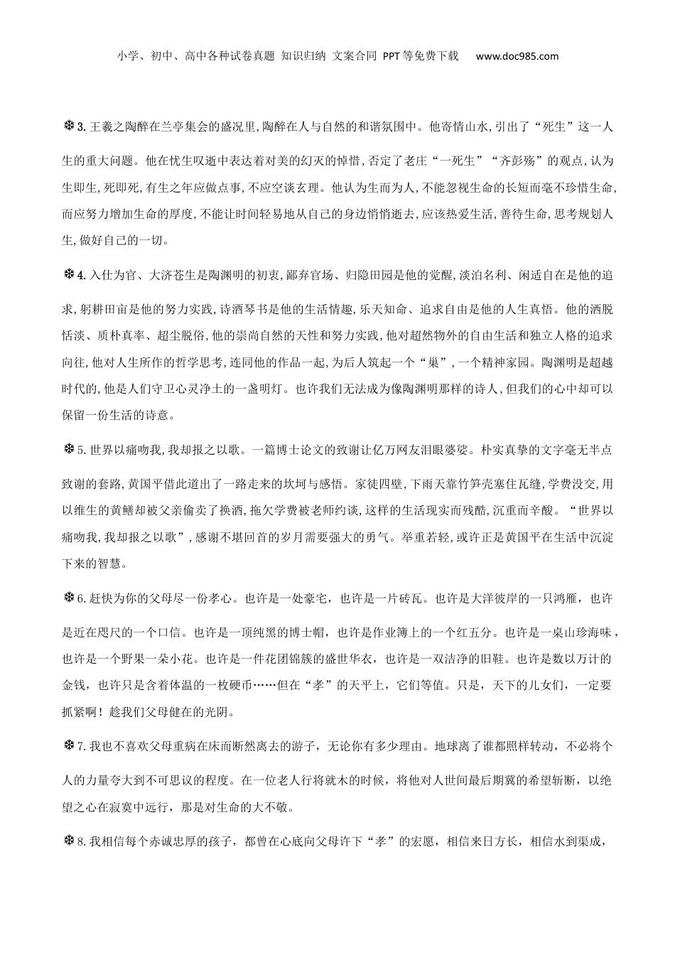 小学、初中、高中各种试卷真题知识归纳文案合同PPT等免费下载www.doc985.com专题03至情至性专题目录01重,明确涵温导语内02素材精,主适用选题03考合,型探究教结题04拓展演,强化固练巩05元作,任拓展单写务选择性必修下第三单元选取了两晋到明代的六篇古代散文名作。古今不相远,此心即彼心——注重传统文化经典研习,用历史和现代的眼光审视传统文化的历史价值和时代意义,从中汲取前进力量,筑牢文化根基。《陈情表》纯是一片至性语,《项脊轩志》一往情深,两文都以情真见长。《陈情表》有明确对象和实际目的,事祖母至孝之情;进退狼狈之窘情;不矜名节,陨首结草之忠情;犬马怖惧之情。李密暂缓出仕不仅归功于辞表的情满笔端、婉转恳切,而且要得益于写作过程中的智慧。《项脊轩志》以自我变现、自我抒情为主。后人评《陈情表》,“不事雕琢,唯见天真烂漫”,评《项脊轩志》“不俟修饰而能情辞并得”,两文在语言方面都较少华丽雕饰,以传情达意为主。《兰亭集序》心连广宇,体悟生命,表达出富有哲理的生命之思,特别是文中点睛之笔,“固知一死生为虚诞,齐彭殇为妄作”,引发了不同时代读者心灵的共鸣。陶渊明平生志事,在于兼济天下,猛志所向,超越四海,而世道艰险,淹留无成。光阴流逝,五次出仕,志业未成,生命价值未能实现。而《归去来兮辞》是鄙弃仕途,归隐田园的诗意自白。“文章合为时而著”,柳宗元借郭橐驼之口由种树之道,而得养人术。《石钟山记》是一篇带有考辨性质的游记,苏轼的结论并不准确,但此文仍流传至今,备受赞誉。本单元属于“中华传统文化经典研习”任务群。旨在引导学生阅读中华传统文化经典作品,积累文言阅读经验,培养民族审美趣味,增进对中华传统文化的理解,提升对中华民族文化的认同感、自豪感,增小学、初中、高中各种试卷真题知识归纳文案合同PPT等免费下载www.doc985.com强文化自信,更好地继承和弘扬中华优秀传统文化。中华优秀传统文化是坚定文化自信的底色。传统文化经典作品是民族文化的重要载体,让学生在潜移默化中完善人格,浸润心灵,丰富情感。六篇古代散文名作或以情见长,至情至性;或以理取胜,理趣盎然。体裁不一,风格各异。让学生在学习中体会在情感、思想和人生感悟,是“文化传承与理解”这一学科核心素养在语文教材中的具体落实。名言素材1.失去了慈母便像花插在瓶子里,虽然还有色有香,却失去了根。——老舍2.良心是灵魂之声,而情愫是肉体之声。(卢梭)3.无言的纯朴所表示的情感,才是最丰富的。(莎士比亚)4.情感,是指嗜欲,愤怒,恐惧,自信,妒忌,喜悦,友情,憎恨,渴望,好胜心,怜悯心,和一般伴随痛苦或快乐的各种感情。(亚里士多德)5.人的情感,人的理智,这两重灵性的发达与天赋,不一定是平均的。有些人,是理智胜于情感,有些人是情感溢于理智。(郁达夫)6.笑是感情的舒展,泪是感情的净化。(柯灵)主题素材❆1.李密从小父丧母弃,伶仃孤苦;祖母含辛茹苦,促其成才。他一度沦为亡国之奴,归家供养祖母终老。后来他因孝被举荐,屡被征召;祖母却日薄西山,朝不虑夕。尽忠还是尽孝,李密进退维谷。侍奉新君,焉知福祸,且远离祖母,情何以堪?辞命尽孝,报养祖母,却逆君美意,横祸将至。李密思量再三,婉转陈词,恳请皇帝准许他先尽孝后尽忠。他十分睿智,避而不谈转事新君的忧惧及不满,却大肆渲染自己对祖母的感情与孝心。“尽节于陛下之日长,报养刘之日短”,李密用婉转恳切之辞感动了皇帝,得以报答祖母养育之恩,且避免了拒任新朝的罪过。李密机警善辩,以退为进,既赡养了祖母,又保全了自己。❆2.方丈之间,流淌着一段不老的真情项脊轩,百年老屋,历经岁月沧桑。方丈之间,流淌着的却是一段不老的真情。在归有光的读书生涯中,有它的陪伴,那盏寒夜孤灯不再寂寞。满院的兰桂竹木在月夜摇曳生姿,冥然几坐,偃仰啸歌,翻读案头圣贤书,莫论功名,仅此足矣!在这里,传响呱呱而泣的婴孩声,"儿寒乎,欲食乎?"这是母亲最质朴的关切;在这里,祖母以象笏相送,"他日汝当用之",这是老人殷切的期盼;在这里,"诸父异赛,内外多置小门墙,往往而是",大家分成小家;在这里,吾妻来归,学书问古,琴瑟相悦。时间可以冲淡世间的爱恨情仇,但有些熟悉的声音却无法用时间遗忘。...