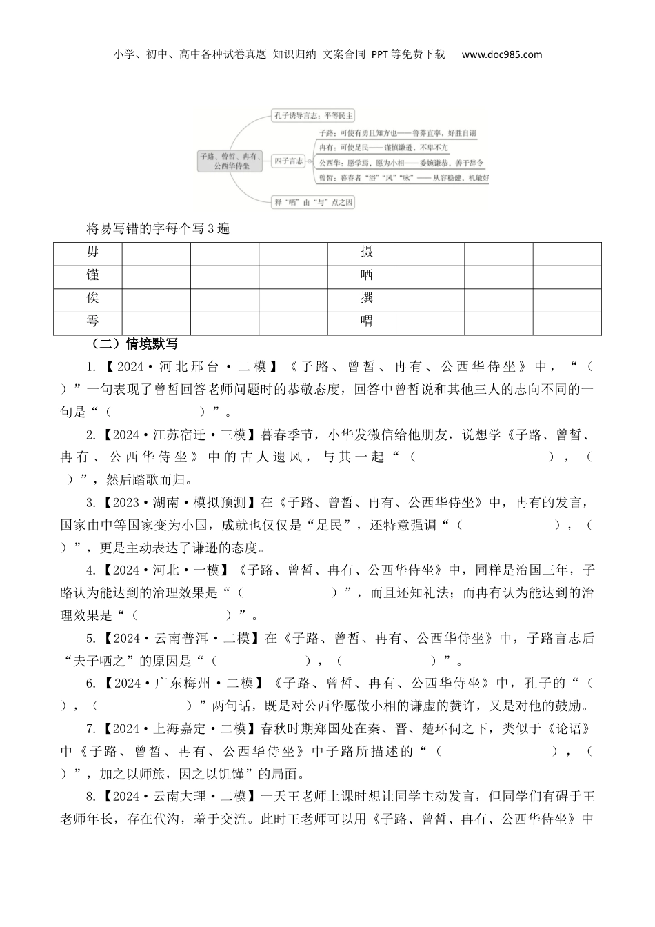 小学、初中、高中各种试卷真题知识归纳文案合同PPT等免费下载www.doc985.com新高考语文60篇必背篇目1(默写)十1(阅读)闯关手册(2025版)第11篇《子路、曾皙、冉有、公西华侍坐》一、默写闯关(一)挖空练习《子路、曾皙、冉有、公西华侍坐》子曰:“以吾一日长乎尔,()吾以也。居则曰;‘不吾知也。’如或知尔,则何以哉?”子路率尔而对曰:“千乘之国,()乎大国之间,加之以师旅,因之以饥();由也为之,比及三年,可使有勇,且知方也。”夫子()之。“求!尔何如?”对曰:“方六七十,如五六十,求也为之,比及三年,可使足民。如其礼乐,以()君子。”“赤!尔何如?”对曰:“非曰能之,愿学焉。宗庙之事,如会同,端章甫,愿为小相焉。”“点!尔何如?”鼓瑟希,铿尔,舍瑟而作,对曰:“异乎三子者之()。”子曰:“何伤乎?亦各言其志也。”曰:“莫春者,春服既成,冠者五六人,童子六七人,浴乎沂,风乎舞(),咏而归。”夫子()然叹曰:“吾与点也!”三子者出,曾皙后。曾皙曰:“夫三子者之言何如?”子曰:“亦各言其志也已矣。”曰:“夫子何哂由也?”曰:“为国以礼,其言不让,是故哂之。”“唯求则非邦也与?”“安见方六七十如五六十而非邦也者?”“唯赤则非邦也与?”宗庙会同,非诸侯而何?赤也为之小,孰能为之大?”附:记忆导图小学、初中、高中各种试卷真题知识归纳文案合同PPT等免费下载www.doc985.com将易写错的字每个写3遍毋摄馑哂俟撰雩喟(二)情境默写1.【2024·河北邢台·二模】《子路、曾皙、冉有、公西华侍坐》中,“()”一句表现了曾皙回答老师问题时的恭敬态度,回答中曾皙说和其他三人的志向不同的一句是“()”。2.【2024·江苏宿迁·三模】暮春季节,小华发微信给他朋友,说想学《子路、曾皙、冉有、公西华侍坐》中的古人遗风,与其一起“(),()”,然后踏歌而归。3.【2023·湖南·模拟预测】在《子路、曾皙、冉有、公西华侍坐》中,冉有的发言,国家由中等国家变为小国,成就也仅仅是“足民”,还特意强调“(),()”,更是主动表达了谦逊的态度。4.【2024·河北·一模】《子路、曾皙、冉有、公西华侍坐》中,同样是治国三年,子路认为能达到的治理效果是“()”,而且还知礼法;而冉有认为能达到的治理效果是“()”。5.【2024·云南普洱·二模】在《子路、曾皙、冉有、公西华侍坐》中,子路言志后“夫子哂之”的原因是“(),()”。6.【2024·广东梅州·二模】《子路、曾皙、冉有、公西华侍坐》中,孔子的“(),()”两句话,既是对公西华愿做小相的谦虚的赞许,又是对他的鼓励。7.【2024·上海嘉定·二模】春秋时期郑国处在秦、晋、楚环伺之下,类似于《论语》中《子路、曾皙、冉有、公西华侍坐》中子路所描述的“(),()”,加之以师旅,因之以饥馑”的局面。8.【2024·云南大理·二模】一天王老师上课时想让同学主动发言,但同学们有碍于王老师年长,存在代沟,羞于交流。此时王老师可以用《子路、曾皙、冉有、公西华侍坐》中小学、初中、高中各种试卷真题知识归纳文案合同PPT等免费下载www.doc985.com的“(),()”两句进行引导。9.【2023·河南新乡·模拟预测】《子路、曾皙、冉有、公西华侍坐》中,曾皙的理想社会是在“(),()”情况下,成年人带几个孩子自由自在地生活在和谐的社会里。10.【2023·湖南·模拟预测】《子路、曾皙、冉有、公西华侍坐》中,子路认为,哪怕面对“(),()”这样内忧外患、治理难度大的国家,他也只需三年便可扭转局面。【参考答案】1.舍瑟而作;异乎三子者之撰。2.浴乎沂,风乎舞雩。3.如其礼乐,以俟君子。4.可使有勇;可使足民。5.为国以礼,其言不让。6.赤也为之小,孰能为之大。7.千乘之国,摄乎大国之间。8.以吾一日长乎尔,毋吾以也。9.莫春者,春服既成。10.加之以师旅,因之以饥馑。二、阅读闯关(一)课内阅读阅读下面的文言文,完成下题。子路、曾皙、冉有、公西华侍坐子曰:“以吾一日长乎尔,毋吾以也。居则曰:‘不吾知也!’如或知尔,则何以哉?”子路率尔而对曰:“千乘之国,摄乎大国之间,加之以师旅,因之以饥馑;由也为之,比...