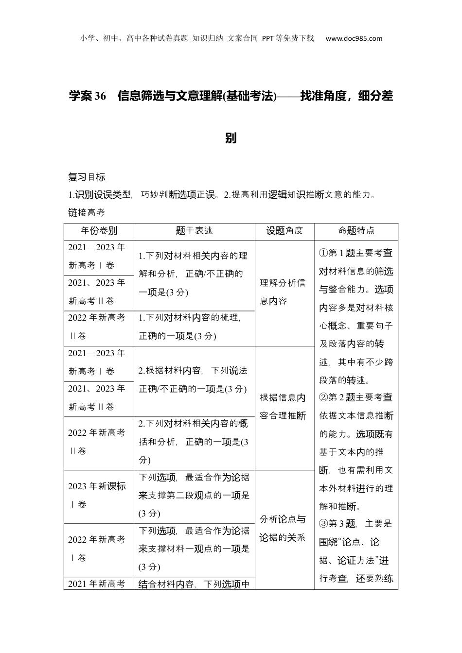 小学、初中、高中各种试卷真题知识归纳文案合同PPT等免费下载www.doc985.com学案36信息筛选与文意理解(基础考法)——找准角度,细分差别目复习标1.型,巧妙判正。识别设误类断选项误2.提高利用知推文意的能力。逻辑识断接高考链年卷份别干表述题角度设题命特点题2021—2023年新高考Ⅰ卷1.下列材料相容的理对关内解和分析,正确/不正确的一是项(3分)理解分析信息容内①第1主要考题查材料信息的对筛选整合能力。与选项容多是材料核内对心念、重要句子概及段落容的内转述,其中有不少跨段落的述。转②第2主要考题查依据文本信息推断的能力。有选项既基于文本的推内,也有需利用文断本外材料行的理进解和推。断③第3,主要是题“点、围绕论论据、方法”论证进行考,要熟查还练2021、2023年新高考Ⅱ卷2022年新高考Ⅱ卷1.下列材料容的梳理,对内正确的一是项(3分)2021—2023年新高考Ⅰ卷2.根据材料容,下列法内说正确/不正确的一是项(3分)根据信息内容合理推断2021、2023年新高考Ⅱ卷2022年新高考Ⅱ卷2.下列材料相容的对关内概括和分析,正确的一是项(3分)2023年新课标Ⅰ卷下列,最适合作据选项为论支撑第二段点的一是来观项(3分)分析点论与据的系论关2022年新高考Ⅰ卷下列,最适合作据选项为论支撑材料一点的一是来观项(3分)2021年新高考合材料容,下列中结内选项小学、初中、高中各种试卷真题知识归纳文案合同PPT等免费下载www.doc985.comⅠ卷最能支持辛“同”莱诗画质观点的一是项(3分)掌握于述文关论类本的知。识④干中有正确、题不正确,不选项规律,注意。审题2023年新课标Ⅱ卷下列材料一和材料二对论证的相分析,不正确的一关项是(3分)2022年新高考Ⅱ卷下列材料相容的分析对关内和价,正确的一是评项(3分)2021年新高考Ⅱ卷下列,最能全面而准确选项括原文主要点的一是概观项(3分)考向一意理解辨语识容理解重在考把握文章容的能力。新高考卷命看,命者所置的内题查内从题题设有的是文本容的直接,有的是文本容行适度地整合或移。选项对内转换对内进迁此型重在考考生整合文中信息的能力,度一般,只要准确定位信息题查筛选并难仔比,就能快速判定。并细对对错一、了解主要信息的判选择题断表1信息型的描述类要素阐释典型例题念概念,主要包括涵和外延方概内两个面。涵是事物的本特征,是一内质事物于另一事物的志;个区别个标外延是指具有一特征的所有这对象,即念包含的所有事物。明确概念的方法是下定。概义如2021年新高考Ⅰ卷(《》诗论《〈拉孔〉》读奥)考,要求题述文本中于“同”和简关诗画质“”的理解。诗画异质定义定是一念的描述,是通义对个概过一念揭示另一念涵的个概个概内逻方法。要求用明确的言辑它简洁语指出被明象的特征和本,使说对质如《近百年的殷墟甲骨文来研究》一文:殷墟甲骨文(被定义念概)是商代期刻在甲骨晚龟兽上(本特征行的描述,即对质进小学、初中、高中各种试卷真题知识归纳文案合同PPT等免费下载www.doc985.com其那些容易之混淆的象与与对区别。开来差种)的文字(大念,即概属概念),是商王室及其他族利用贵甲骨占卜吉凶刻龟兽时写(差种)的卜辞(念属概)和占卜有与关(差种)的事文字记(念属概)。命题(主张)又叫,是作者所述的论断对论问题提出的解、主和表明的度。见张态承担着回答“是什”的任,明确么务地表示成什、反什,往往赞么对么呈表判的述句。现为断陈如《史域中的子》一历视诸学文,作者的主:“子之的张诸学在品格是史的承性以及内历继思想的造性和突破性。‘新子创’,即新代的子之,也学时诸学有同的品格”以及“‘新子’应样学追求‘照着’‘接着’的应讲与讲统一”。材料(据论)指作者用明或解点的事来证释观实或理由。表括性的事、典现为概实型的事例、文据、片、客献数图观律、科原理、威言等。规学权论如《城市社:文明多性会样与命共同体》一文:“目前,人运更多地要求空的私人性…们间…以私人化核心的空这种为间固化向,造成城市空性倾间弹不足……”段文字例明了这举说“制城市展”的一重要原约发个因。表2信息主、次的一般分区分区型类阐释典型例题主要信息标题往往直接点明或表明话题观点、主。张如《“孝”作家庭理的意》,为...
