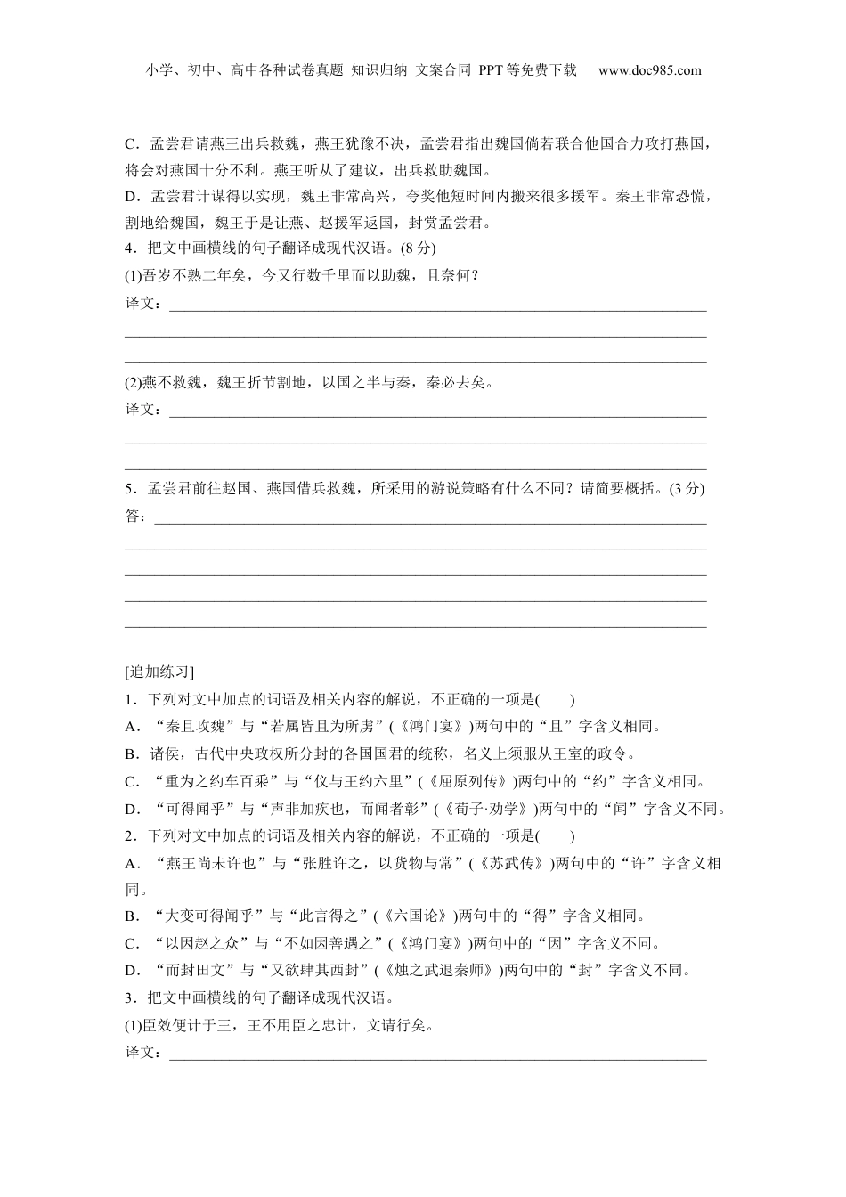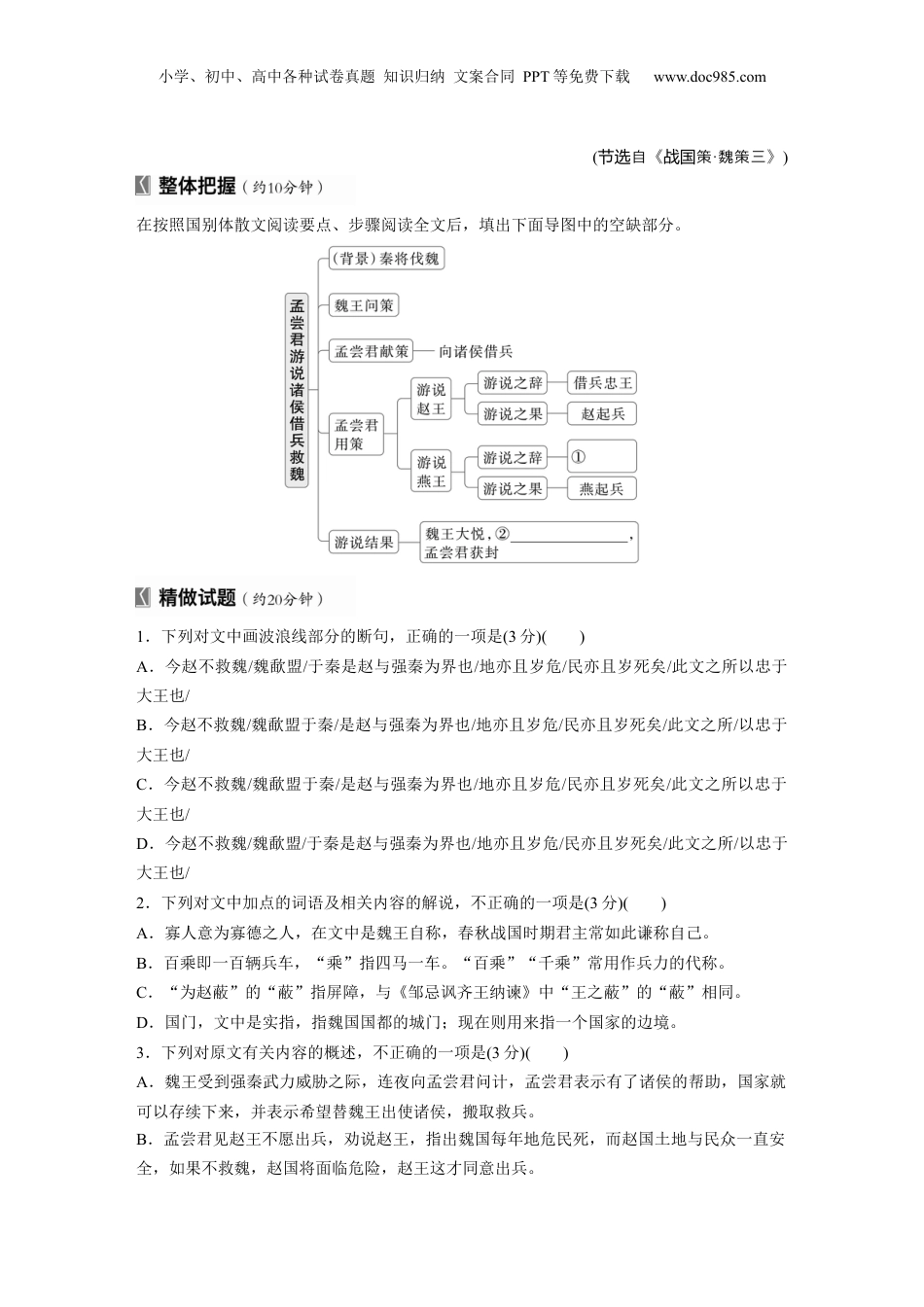 小学、初中、高中各种试卷真题知识归纳文案合同PPT等免费下载www.doc985.com学案46研练两年高考真题(二)——吃透精髓,把握方向复习任务精做2022年新高考卷文言文阅读试题,吃透试题精髓,把握复习方向。课标要求考情表览均见学案45活动一研练2022年新高考Ⅰ卷试题国别体散文阅读要点:抓住三个问题:①某国发生了何事?——了解事情发生的背景。②策士如何献策用策?——了解策士游说经过。③国君用策结果如何?——了解事情结果。(2022·新高考Ⅰ)阅读下面的文言文,完成后面任务。秦伐魏,魏王之,夜孟君,告之曰:将闻见尝“秦且攻魏,子为寡人,奈何?谋”孟尝君曰:“有侯诸之救,可存也。则国”王曰:“寡人愿子之行也!”重之为约车百乘。孟尝君之,王曰:赵谓赵“文愿借兵以救魏!”王曰:赵“寡人不能。”孟君曰:尝“夫敢借兵者,以忠王也。”王曰:“可得闻乎?”孟君曰:尝“夫之兵非能强于魏之兵,魏之兵非赵能弱于也。然而之地不危而民不死,而魏之地危而民死者,何也?以其西赵赵岁岁岁岁为赵蔽也。今不救魏魏歃盟于秦是强秦界也地亦且危民亦且死矣此文之所以忠于大赵赵与为岁岁王也”王,起兵十万、三百乘。又北燕王曰:赵许诺为车见“今秦且攻魏,愿大王之救之!”燕王曰:“吾不熟二年矣,今又行千里而以助魏,且奈何?岁数”田文曰:“夫行数千里而救人者,此之利也。今魏王出国国门而望,欲行千里而助人,可得乎?见军虽数”燕王未尚许也。田文曰:“臣效便于王,王不用臣之忠,文行矣。计计请恐天下之有大将变也。”王曰:“大可变得乎?闻”曰:“燕不救魏,魏王折割地,以之半秦,秦必去节国与矣。秦已去魏,魏王悉、魏之兵,又西借秦兵,以韩因之,以四攻燕,王且何利?利赵众国行千里而助人乎?利出燕南而望乎?道里近而又易矣。王何利?数门见军则输”燕王曰:“子行矣,寡人听子。”乃之起兵八万、二百乘,以田文。魏王大曰:为车从说“君得燕、之兵甚且亟矣。赵众”秦王大恐,割地于魏。请讲因燕、之兵,而归赵封田文。小学、初中、高中各种试卷真题知识归纳文案合同PPT等免费下载www.doc985.com(自《策节选战国·魏策三》)在按照国别体散文阅读要点、步骤阅读全文后,填出下面导图中的空缺部分。1.下列对文中画波浪线部分的断句,正确的一项是(3分)()A.今赵不救魏/魏歃盟/于秦是赵与强秦为界也/地亦且岁危/民亦且岁死矣/此文之所以忠于大王也/B.今赵不救魏/魏歃盟于秦/是赵与强秦为界也/地亦且岁危/民亦且岁死矣/此文之所/以忠于大王也/C.今赵不救魏/魏歃盟于秦/是赵与强秦为界也/地亦且岁危/民亦且岁死矣/此文之所以忠于大王也/D.今赵不救魏/魏歃盟/于秦是赵与强秦为界也/地亦且岁危/民亦且岁死矣/此文之所/以忠于大王也/2.下列对文中加点的词语及相关内容的解说,不正确的一项是(3分)()A.寡人意为寡德之人,在文中是魏王自称,春秋战国时期君主常如此谦称自己。B.百乘即一百辆兵车,“乘”指四马一车。“百乘”“千乘”常用作兵力的代称。C.“为赵蔽”的“蔽”指屏障,与《邹忌讽齐王纳谏》中“王之蔽”的“蔽”相同。D.国门,文中是实指,指魏国国都的城门;现在则用来指一个国家的边境。3.下列对原文有关内容的概述,不正确的一项是(3分)()A.魏王受到强秦武力威胁之际,连夜向孟尝君问计,孟尝君表示有了诸侯的帮助,国家就可以存续下来,并表示希望替魏王出使诸侯,搬取救兵。B.孟尝君见赵王不愿出兵,劝说赵王,指出魏国每年地危民死,而赵国土地与民众一直安全,如果不救魏,赵国将面临危险,赵王这才同意出兵。小学、初中、高中各种试卷真题知识归纳文案合同PPT等免费下载www.doc985.comC.孟尝君请燕王出兵救魏,燕王犹豫不决,孟尝君指出魏国倘若联合他国合力攻打燕国,将会对燕国十分不利。燕王听从了建议,出兵救助魏国。D.孟尝君计谋得以实现,魏王非常高兴,夸奖他短时间内搬来很多援军。秦王非常恐慌,割地给魏国,魏王于是让燕、赵援军返国,封赏孟尝君。4.把文中画横线的句子翻译成现代汉语。(8分)(1)吾岁不熟二年矣,今又行数千里而以助魏,且奈何?译文:______________________________________________________...
