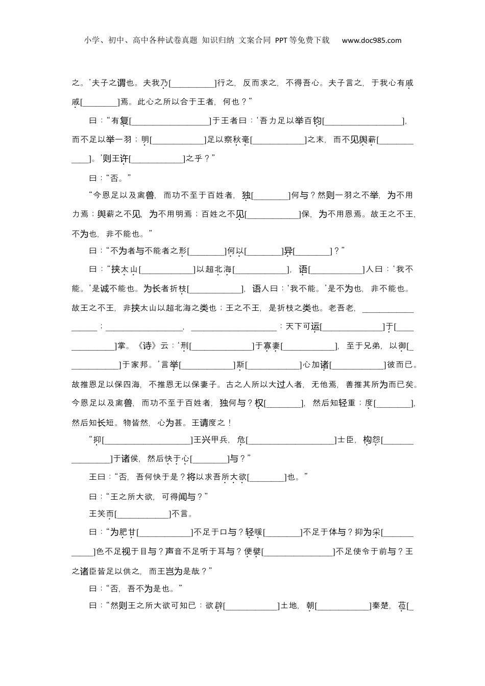 小学、初中、高中各种试卷真题知识归纳文案合同PPT等免费下载www.doc985.com学案4《齐桓晋文之事》一、文再空落课读挖实解加点的含或用法,上相的句。请释词语义并补写横线关词宣王曰:“桓、晋文之事可得乎?”齐问齐闻孟子曰:“仲尼之徒无对道[____________]桓文之事者,是以后世无焉,臣未之也传闻。无以[____________],则王[____________]乎?”曰:“德何如可以王矣?”则曰:“保[____________]民而王,莫[____________]之能御也。”曰:“若寡人者,可以保民乎哉?”曰:“可。”曰:“何由知吾可也?”曰:“臣之胡曰:王坐于堂上,有牛而堂下者,王之,曰:‘牛闻龁牵过见何之[____________]?’曰:‘以对将衅钟[____________]。’王曰:‘舍[____________]之!吾不忍其________,若无罪而就[________]死地。’曰:‘然?’曰:‘何可也?以羊易之。’不对则废衅钟与废识有诸[________]?”曰:“有之。”曰:“是心足以王矣。百姓皆以王为爱[____________]也,臣固知王之不忍也。”王曰:“然,有百姓者。诚齐国虽褊小[____________],吾何一牛?即不忍其觳,爱觫若无罪而就死地,故以羊易之也。”曰:“王无异[________________]于百姓之以王也。以小易大,彼为爱恶[________________]知之?王若隐[________________]其无罪而就死地,牛羊何则择[________________]焉?”王笑曰:“是何心哉?我非其而易之以羊也,宜诚爱财乎[____________]百姓之我谓爱也。”曰:“无也,伤是[____________]乃仁术[____________]也,牛未羊也。君子之于禽见见也,其生,不忍其死;其,不忍食其肉。是以君子庖也。”兽见见闻声远厨王说[________________],曰:“《》云:‘他人有心,予诗忖度[________________]小学、初中、高中各种试卷真题知识归纳文案合同PPT等免费下载www.doc985.com之。’夫子之也。夫我谓乃[__________]行之,反而求之,不得吾心。夫子言之,于我心有戚戚[________]焉。此心之所以合于王者,何也?”曰:“有复[__________________]于王者曰:‘吾力足以百举钧[__________________],而不足以一羽;举明[____________]足以察秋毫[____________]之末,而不见薪舆[____________]。’王则许[____________]之乎?”曰:“否。”“今恩足以及禽,而功不至于百姓者,兽独[________]何?然一羽之不,不用与则举为力焉;薪之不,不用明焉;百姓之不舆见为见[____________]保,不用恩焉。故王之不王为,不也,非不能也。”为曰:“不者不能者之为与形[________]何以[________]异[________]?”曰:“挟太山[____________]以超北海[____________],语[____________]人曰:‘我不能。’是不能也。者折诚为长枝[____________],人曰:‘我不能。’是不也,非不能也。语为故王之不王,非太山以超北海之也;王之不王,是折枝之也。老吾老,挟类类__________________;__________________,____________________:天下可运[______________]于[______________]掌。《》云:‘诗刑[______________]于寡妻[____________],至于兄弟,以御[____________]于家邦。’言举[____________]斯[____________]心加诸[____________]彼而已。故推恩足以保四海,不推恩无以保妻子。古之人所以大人者,无他焉,善推其所而已矣过为。今恩足以及禽,而功不至于百姓者,何?兽独与权[________],然后知重;轻度[________],然后知短。物皆然,心甚。王度之!长为请“抑[____________________]王甲兵,兴危[____________________]士臣,怨构[________________]于侯,然后诸快于心[________]?”与王曰:“否,吾何快于是?以求吾将所大欲[________]也。”曰:“王之所大欲,可得?”闻与王笑而[____________]不言。曰:“为肥甘[____________]不足于口?与暖轻[________]不足于体?抑与为采[____________]色不足于目?音不足听于耳?视与声与便嬖[________________]不足使令于前?王与之臣皆足以供之,而王是哉?”诸岂为曰:“否,吾不是也。”为曰:“然王之所大欲可知已:欲则辟[____________]土地,朝[____________]秦楚,莅[_小学、初中、高中各种试卷真题知识归纳文案合同PPT等免费下载www....