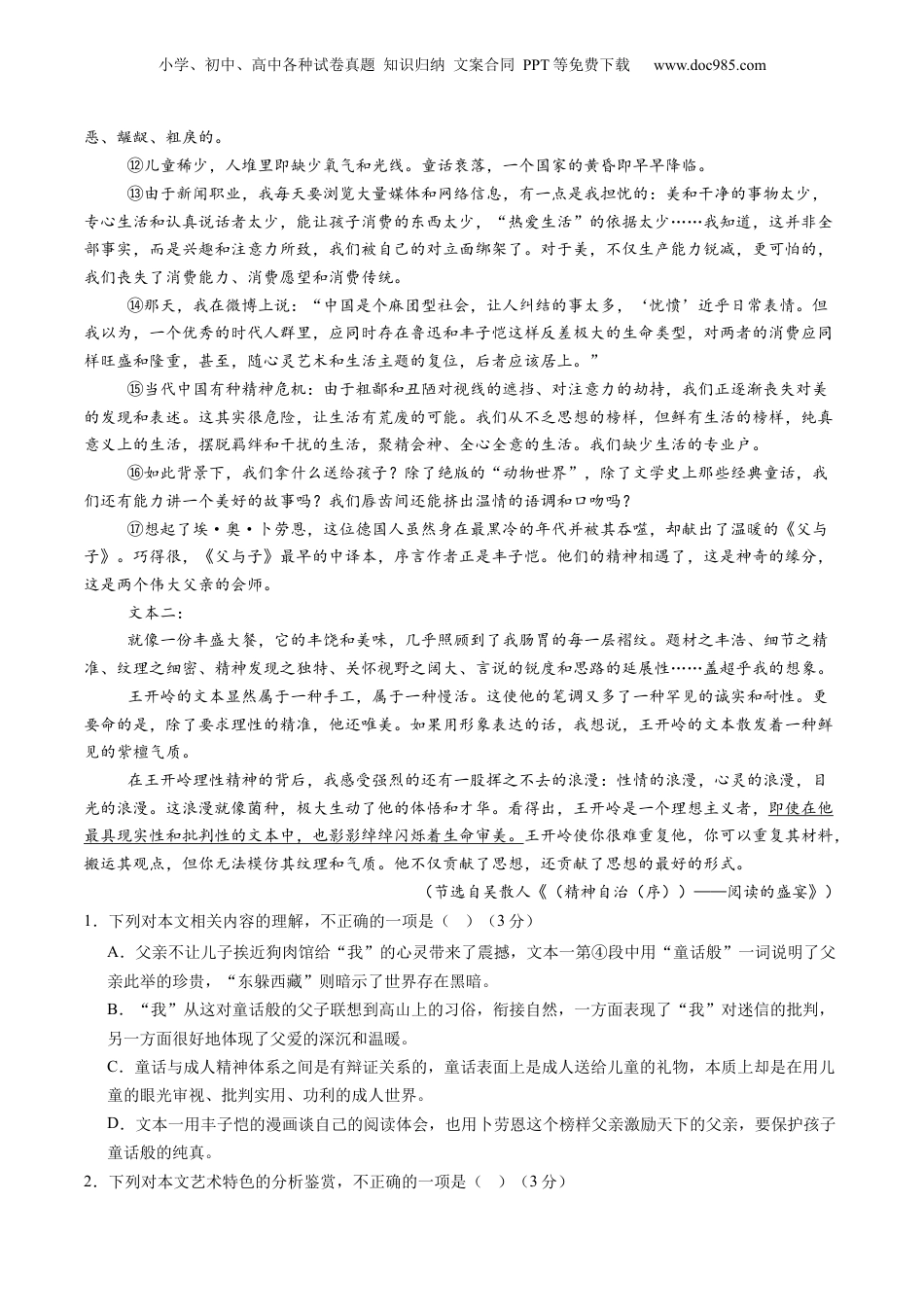 小学、初中、高中各种试卷真题知识归纳文案合同PPT等免费下载www.doc985.com综合测试06散文阅读(多文本)时间:50分钟满分:48分姓名__________得分________(2024·黑龙江佳木斯·三模)阅读下面的文字,完成下面小题(共4小题,16分)。文本一:父与子(节选)王开岭①有一条街,父亲总不让儿子挨近,总要找个理由,悄悄绕开。原来,这条街窝藏着全城的狗肉馆,一年到头,街边放满了栅笼,一只只憔悴的狗趴在里面,充当活物招牌。那条街上有股怪味,是恐惧的味道,是动物临终的味道,是血蒸发的味道,是告别身体的鲜毛皮在风里抽泣的味道……②这是个高尚的父亲。③他怕孩子吸入不良空气,他怕孩子的眼睛受伤,他怕幼小的心灵侵入毒素。他最怕的是,孩子在慢慢适应后变得坦然,在一次次惊愕和无能为力后变得麻木,最终,变成那些路人中的一个。④我不知道,这对童话般的父子,在东躲西藏的世间能躲多久,在绕来绕去的路上能走多远。但他们的存在,如金子般贵重。他们改变了人群的成分,重新编辑了我对人间的印象。⑤我想起一个高山上的习俗:一个猎人,在和野兽搏斗后,要用泉水和树叶洗净脸再回家,以免眼里有未散尽的凶煞,附体在婴儿身上。孩子断奶前,猎人不能捕杀哺乳期的动物,不能带沾血腥的兽皮回家,否则,孩子长大会成为歹人。⑥这是个美丽的迷信。大凡迷信,都有这种特点:后果不成立,但禁忌中包含的精神主张却是高贵的。⑦深夜,我欲搭一段美好时光入眠时,常把丰子恺的书搁在枕边。读漫画《趁爸爸不在》《瞻瞻的脚踏车》《爸爸回来了》《妹妹新娘子,弟弟新官人》,总忍不住笑出声,头重脚轻的小人儿,如雀、如花、如蜜饯,芬芳的童音、玻璃球似的吵闹,向日葵般的手臂……被他们簇拥着,几乎忘了那个时代的愁苦与险恶。在丰子恺眼里,婴幼儿才是真的人,童年才是未被篡改的人生。⑧我常想,一个时代的气质和日常生活,若染上一点“丰子恺味道”,该多好,该多好。⑨人生美学和美德,在儿童身上是存量最大的,只有思想成熟并保持一颗童心的人,才是美的成年人。⑩一个国家,若能从孩子对家长的使唤中发现公民的权利,从父母对骨肉的垂怜中认证自己的义务,从他们的彼此互爱中找到国与民的逻辑,从他们的亲热和信赖中反省自己的冷漠与隔膜……若将一个家庭放大无数倍,若天下之人是由一群群“丰子恺”和其“孩子们”连缀而成……那么,一个健美的时代莅临了,“国家”就有了“家国”的基因和属性,该生存共同体的气质和细节变了,道德、风尚也就变了,变得简明、温美、清纯、风和日丽。⑪看一个民族的生活美学,看一个时代的精神雅量,有个重要线索:要看它缔造和收纳了多少童话,看它的世俗文化和游戏规则是否激励、佑护童话人生,是否滋养童话发展,是否欣赏有儿童人格的成年人。表面上,童话是大人备给小儿的礼物,而更深层的真相是:童话乃成人对儿童的审美作业,反映了“大”对“小”的鉴赏力,本质上是“小”对“大”的馈赠。一个社会,若成人的精神系统里没有童话成分,若大众生活提前告别了童话,甚至贬低和嘲笑童话,那这个时代势必极度实用、功利、枯燥,人群也定是险小学、初中、高中各种试卷真题知识归纳文案合同PPT等免费下载www.doc985.com恶、龌龊、粗戾的。⑫儿童稀少,人堆里即缺少氧气和光线。童话衰落,一个国家的黄昏即早早降临。⑬由于新闻职业,我每天要浏览大量媒体和网络信息,有一点是我担忧的:美和干净的事物太少,专心生活和认真说话者太少,能让孩子消费的东西太少,“热爱生活”的依据太少……我知道,这并非全部事实,而是兴趣和注意力所致,我们被自己的对立面绑架了。对于美,不仅生产能力锐减,更可怕的,我们丧失了消费能力、消费愿望和消费传统。⑭那天,我在微博上说:“中国是个麻团型社会,让人纠结的事太多,‘忧愤’近乎日常表情。但我以为,一个优秀的时代人群里,应同时存在鲁迅和丰子恺这样反差极大的生命类型,对两者的消费应同样旺盛和隆重,甚至,随心灵艺术和生活主题的复位,后者应该居上。”⑮当代中国有种精神危机:由于粗鄙和丑陋对视线的遮挡、对注意力的劫持,我们正逐渐丧失对美的发现和表述。这其实很危...