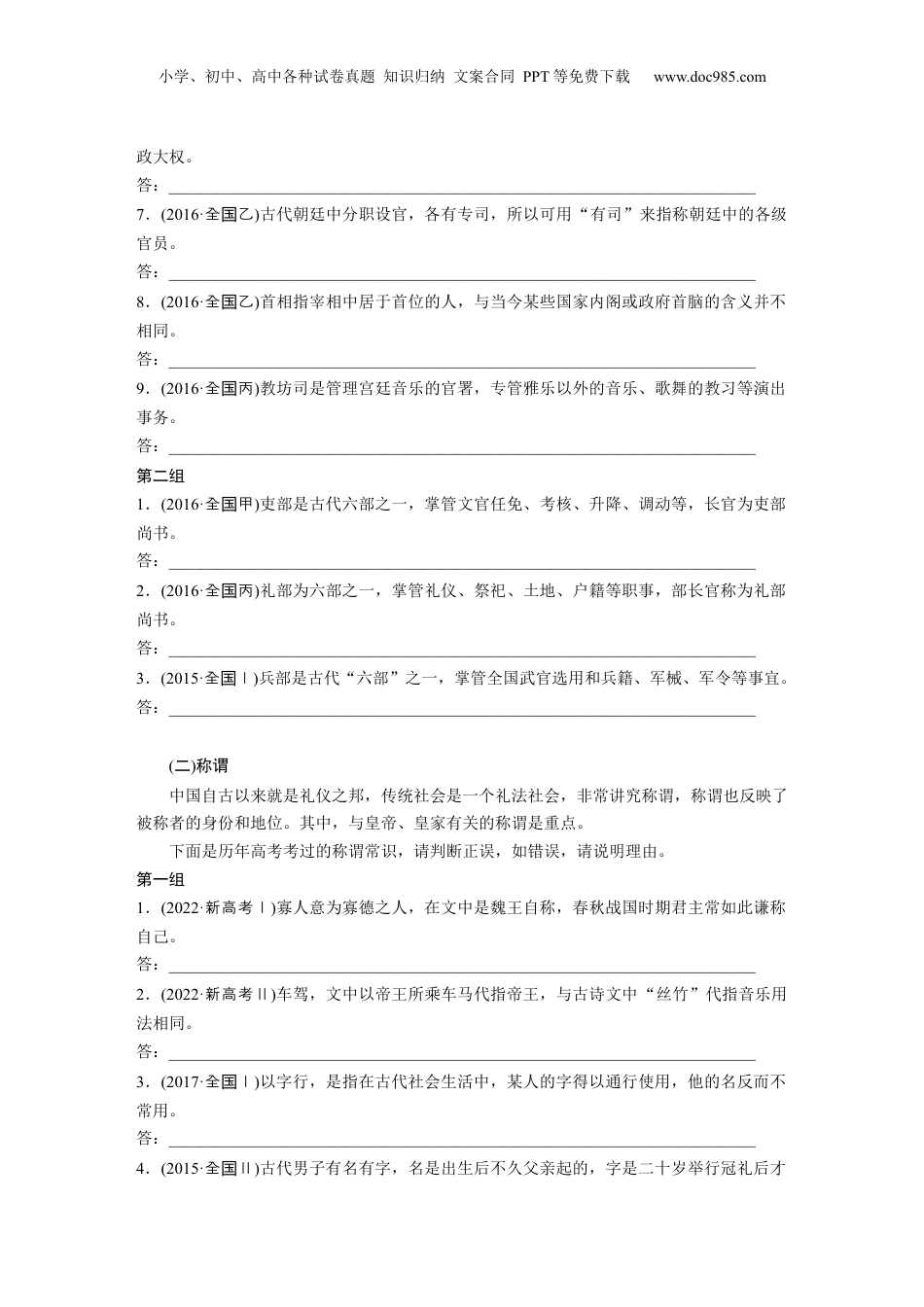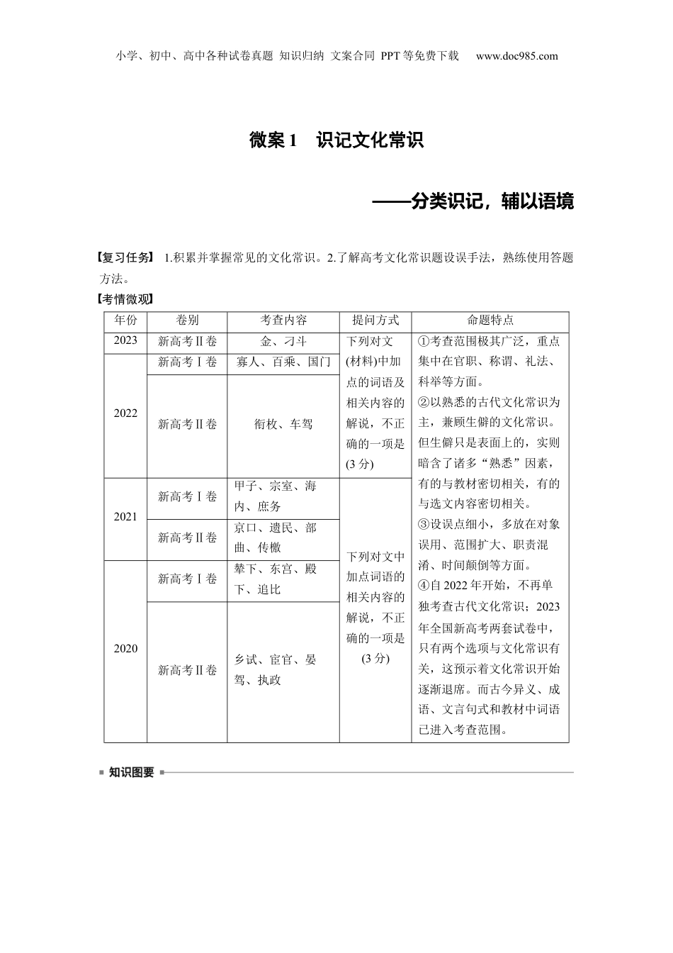 小学、初中、高中各种试卷真题知识归纳文案合同PPT等免费下载www.doc985.com微案1识记文化常识——分类识记,辅以语境复习任务1.积累并掌握常见的文化常识。2.了解高考文化常识题设误手法,熟练使用答题方法。考情微观年份卷别考查内容提问方式命题特点2023新高考Ⅱ卷金、刁斗下列对文(材料)中加点的词语及相关内容的解说,不正确的一项是(3分)①考查范围极其广泛,重点集中在官职、称谓、礼法、科举等方面。②以熟悉的古代文化常识为主,兼顾生僻的文化常识。但生僻只是表面上的,实则暗含了诸多“熟悉”因素,有的与教材密切相关,有的与选文内容密切相关。③设误点细小,多放在对象误用、范围扩大、职责混淆、时间颠倒等方面。④自2022年开始,不再单独考查古代文化常识;2023年全国新高考两套试卷中,只有两个选项与文化常识有关,这预示着文化常识开始逐渐退席。而古今异义、成语、文言句式和教材中词语已进入考查范围。2022新高考Ⅰ卷寡人、百乘、国门新高考Ⅱ卷衔枚、车驾2021新高考Ⅰ卷甲子、宗室、海内、庶务下列对文中加点词语的相关内容的解说,不正确的一项是(3分)新高考Ⅱ卷京口、遗民、部曲、传檄2020新高考Ⅰ卷辇下、东宫、殿下、追比新高考Ⅱ卷乡试、宦官、晏驾、执政小学、初中、高中各种试卷真题知识归纳文案合同PPT等免费下载www.doc985.com活动一掌握高考考查重点古代文化常识题重在考查识记能力,但由于该考点所考查的词语大多是从文言文材料中引发来的,故兼考理解能力和推断能力。对于这一考点的复习,我们首先应分析高考所涉及的考点,明确备考方向。近几年,高考考查的重点是官职、称谓、礼法、科举等方面的文化常识。(一)官职自2015年全国卷开始考查文化常识起,官职类的知识点一直是历年高考考查的重点内容。官职包括官署类与官制类,既有中央官职,又有地方官职,重点是中央官职。下面是历年高考考过的官职常识,请判断正误,如错误,请说明理由。第一组1.(2021·全乙国)大理丞,大理丞是大理寺的重要官员,大理寺是我国古代掌管刑狱的官署。答:________________________________________________________________________2.(2020·全国Ⅰ)司农是官名,又称为大司农,主要掌管农桑、仓储、租税等相关事务。答:________________________________________________________________________3.(2020·全国Ⅰ)当轴,指做官处在重要的位置;当轴者则指身居显赫职位的当权官员。答:________________________________________________________________________4.(2020·全国Ⅲ)太守是郡一级的最高行政长官,主要掌管民政、司法、军事、科举等事务。答:________________________________________________________________________5.(2020·新高考Ⅱ)执政指掌管国家政事,又指执掌国家大权的重臣,还可作为高级官员的通称。答:________________________________________________________________________6.(2019·全国Ⅲ)令尹,春秋战国时期楚国设置的最高官位,辅佐楚国国君,执掌全国的军小学、初中、高中各种试卷真题知识归纳文案合同PPT等免费下载www.doc985.com政大权。答:________________________________________________________________________7.(2016·全乙国)古代朝廷中分职设官,各有专司,所以可用“有司”来指称朝廷中的各级官员。答:________________________________________________________________________8.(2016·全乙国)首相指宰相中居于首位的人,与当今某些国家内阁或政府首脑的含义并不相同。答:________________________________________________________________________9.(2016·全丙国)教坊司是管理宫廷音乐的官署,专管雅乐以外的音乐、歌舞的教习等演出事务。答:________________________________________________________________________第二组1.(2016·全甲国)吏部是古代六部之一,掌管文官任免、考核、升降、调动等,长官为吏部尚书。答:________________________________________________________________________2.(2016·全丙国)礼部为六部之一,掌管礼仪、祭祀、土地、户籍等职事,部长官称为礼...