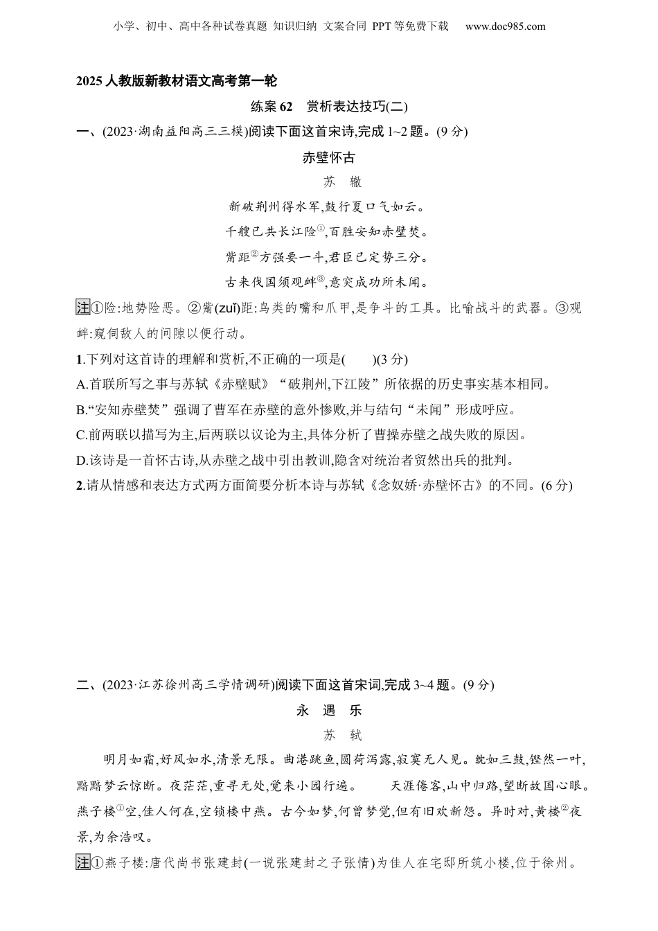 小学、初中、高中各种试卷真题知识归纳文案合同PPT等免费下载www.doc985.com2025人教版新教材语文高考第一轮练案62赏析表达技巧(二)一、(2023·湖南益阳高三三模)阅读下面这首宋诗,完成1~2题。(9分)赤壁怀古苏辙新破荆州得水军,鼓行夏口气如云。千艘已共长江险①,百胜安知赤壁焚。觜距②方强要一斗,君臣已定势三分。古来伐国须观衅③,意突成功所未闻。注①险:地势险恶。②觜(zuǐ)距:鸟类的嘴和爪甲,是争斗的工具。比喻战斗的武器。③观衅:窥伺敌人的间隙以便行动。1.下列对这首诗的理解和赏析,不正确的一项是()(3分)A.首联所写之事与苏轼《赤壁赋》“破荆州,下江陵”所依据的历史事实基本相同。B.“安知赤壁焚”强调了曹军在赤壁的意外惨败,并与结句“未闻”形成呼应。C.前两联以描写为主,后两联以议论为主,具体分析了曹操赤壁之战失败的原因。D.该诗是一首怀古诗,从赤壁之战中引出教训,隐含对统治者贸然出兵的批判。2.请从情感和表达方式两方面简要分析本诗与苏轼《念奴娇·赤壁怀古》的不同。(6分)二、(2023·江苏徐州高三学情调研)阅读下面这首宋词,完成3~4题。(9分)永遇乐苏轼明月如霜,好风如水,清景无限。曲港跳鱼,圆荷泻露,寂寞无人见。如三鼓,铿然一叶,黯黯梦云惊断。夜茫茫,重寻无处,觉来小园行遍。天涯倦客,山中归路,望断故国心眼。燕子楼①空,佳人何在,空锁楼中燕。古今如梦,何曾梦觉,但有旧欢新怨。异时对,黄楼②夜景,为余浩叹。注①燕子楼:唐代尚书张建封(一说张建封之子张情)为佳人在宅邸所筑小楼,位于徐州。小学、初中、高中各种试卷真题知识归纳文案合同PPT等免费下载www.doc985.com②黄楼:徐州东门城楼,苏轼守徐州时建造。3.下列对这首词的理解和赏析,不正确的一项是()(3分)A.上片写景时以动衬静,动静结合,跳鱼和泻露衬托出了环境的静谧。B.“小园行遍”写梦醒后游园,表现了词人游园时的欣喜与执着之情。C.结句遥想未来,词人设想后人看到黄楼后也可能会为自己发出感叹。D.词人将情、景、理结合在一起,境界清幽,风格婉约又有清旷之感。4.上片和下片在表达方式上的侧重点有何不同?请结合本词简要分析。(6分)三、(2023·海南海口一模)阅读下面两首宋诗,完成5~6题。(9分)梅花绝句陆游幽谷那堪更北枝,年年自分著花迟。高标逸韵君知否?正在层冰积雪时。武夷山中谢枋得①十年②无梦得还家,独立青峰野水涯。天地寂寥山雨歇,几生修得到梅花?注①谢枋得:宋末信州(今属江西)人,曾力抗元军,兵败后转徙武夷山中。后被胁迫至燕京,绝食而死。②十年:宋德祐元年(1275),诗人抗元失败,弃家入山。次年妻儿被俘,家破人亡,至写此诗时将近十年。5.下列对这两首诗的理解和赏析,不正确的一项是()(3分)A.陆诗中“幽谷”“层冰”“积雪”等描写了环境之艰苦,表现了梅花生长条件之恶劣。B.陆诗中“自分”表明梅花很在乎开得早还是晚,也表明了诗人对实现理想仍有期待。C.谢诗中“独立青峰野水涯”写武夷奇观,巍然挺立的青峰也是诗人性格、形象的写照。D.谢诗中“天地寂寥山雨歇”借景抒情,写雨后天地寂寥,表达了诗人孤傲寥落的情怀。小学、初中、高中各种试卷真题知识归纳文案合同PPT等免费下载www.doc985.com6.这两首诗都运用了托物言志的手法,请简要分析。(6分)四、(2023·四川遂宁高三阶段练习)阅读下面这首宋诗,完成7~8题。(9分)和子由四首·送春苏轼梦里青春可得追?欲将诗句绊余晖。酒阑病客惟思睡,蜜熟黄蜂亦懒飞。芍药樱桃俱扫地,鬓丝禅榻两忘机。凭君借取《法界观》①,一洗人间万事非。注①《法界观》,即《法界观门》,佛教华严宗的一部重要著作。7.下列对诗歌的理解和赏析,不正确的一项是()(3分)A.诗题交代写作缘起。“和”的意思是“唱和”,本诗是诗人为应和弟弟苏辙而写的。B.首联呼应题目,表明“青春”虽然已难挽回,但仍能以写诗度过余生的积极心态。C.本诗章法绵密,语意前后勾连:颈联上句关联“梦里青春”,下句上承“酒阑病客”。D.尾联表达愿望,诗人希望借《法界观》洗除世间之烦恼,反映出佛教思想对他的影响。8.本诗第二、三联抒发了怎样的情感?这两联是如何借景抒情的?(6分)小学、初中、高中各种试卷真题知识归纳文案合同PPT等免费下载www.doc985.com五、(2023·河北保定统考二...