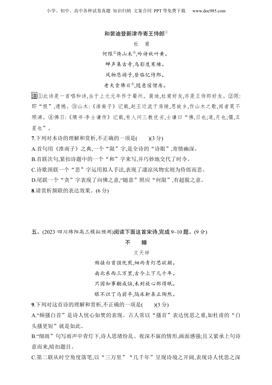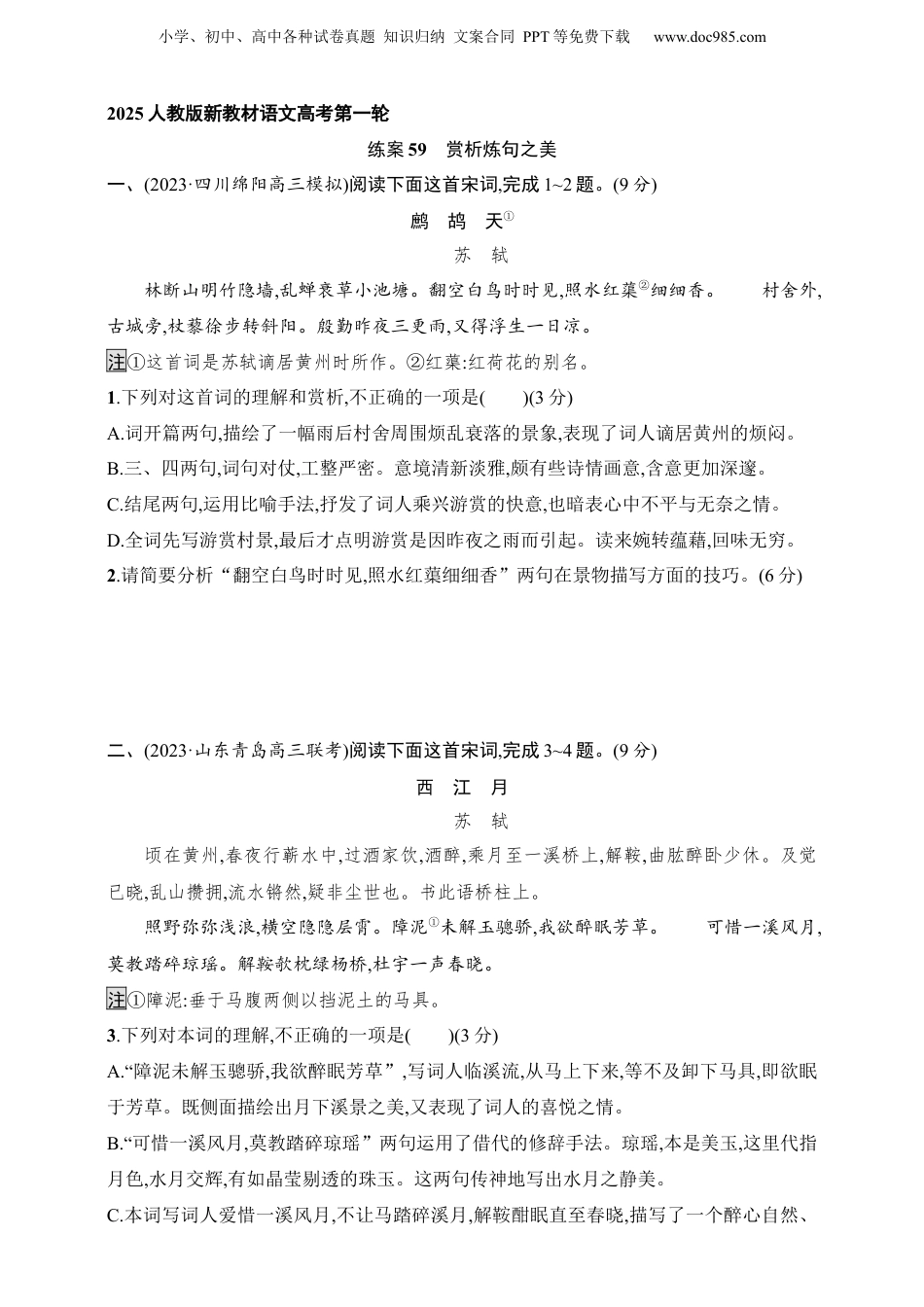 小学、初中、高中各种试卷真题知识归纳文案合同PPT等免费下载www.doc985.com2025人教版新教材语文高考第一轮练案59赏析炼句之美一、(2023·四川绵阳高三模拟)阅读下面这首宋词,完成1~2题。(9分)鹧鸪天①苏轼林断山明竹隐墙,乱蝉衰草小池塘。翻空白鸟时时见,照水红蕖②细细香。村舍外,古城旁,杖藜徐步转斜阳。殷勤昨夜三更雨,又得浮生一日凉。注①这首词是苏轼谪居黄州时所作。②红蕖:红荷花的别名。1.下列对这首词的理解和赏析,不正确的一项是()(3分)A.词开篇两句,描绘了一幅雨后村舍周围烦乱衰落的景象,表现了词人谪居黄州的烦闷。B.三、四两句,词句对仗,工整严密。意境清新淡雅,颇有些诗情画意,含意更加深邃。C.结尾两句,运用比喻手法,抒发了词人乘兴游赏的快意,也暗表心中不平与无奈之情。D.全词先写游赏村景,最后才点明游赏是因昨夜之雨而引起。读来婉转蕴藉,回味无穷。2.请简要分析“翻空白鸟时时见,照水红蕖细细香”两句在景物描写方面的技巧。(6分)二、(2023·山东青岛高三联考)阅读下面这首宋词,完成3~4题。(9分)西江月苏轼顷在黄州,春夜行蕲水中,过酒家饮,酒醉,乘月至一溪桥上,解鞍,曲肱醉卧少休。及觉已晓,乱山攒拥,流水锵然,疑非尘世也。书此语桥柱上。照野弥弥浅浪,横空隐隐层霄。障泥①未解玉骢骄,我欲醉眠芳草。可惜一溪风月,莫教踏碎琼瑶。解鞍欹枕绿杨桥,杜宇一声春晓。注①障泥:垂于马腹两侧以挡泥土的马具。3.下列对本词的理解,不正确的一项是()(3分)A.“障泥未解玉骢骄,我欲醉眠芳草”,写词人临溪流,从马上下来,等不及卸下马具,即欲眠于芳草。既侧面描绘出月下溪景之美,又表现了词人的喜悦之情。B.“可惜一溪风月,莫教踏碎琼瑶”两句运用了借代的修辞手法。琼瑶,本是美玉,这里代指月色,水月交辉,有如晶莹剔透的珠玉。这两句传神地写出水月之静美。C.本词写词人爱惜一溪风月,不让马踏碎溪月,解鞍酣眠直至春晓,描写了一个醉心自然、小学、初中、高中各种试卷真题知识归纳文案合同PPT等免费下载www.doc985.com随性洒脱、乐观豁达的词人形象。D.词人善于把意和境浑然凝结为一个不可分割的整体,他把自己的身心完全融化到大自然中,忘却了世俗的荣辱得失和纷纷扰扰,表现了自己与造化神游的畅适愉悦。4.“照野弥弥浅浪,横空隐隐层霄”两句精妙,请简要赏析。(6分)三、(2023·河南商丘高三联考期中)阅读下面这首宋词,完成5~6题。(9分)淡黄柳①姜夔空城晓角,吹入垂杨陌。马上单衣寒恻恻。看尽鹅黄嫩绿,都是江南旧相识。正岑寂。明朝又寒食。强携酒,小桥宅。怕梨花落尽成秋色。燕燕飞来,问春何在?唯有池塘自碧。注①此词是姜夔客居江淮间合肥所作,合肥曾被金人劫掠,当时是宋、金对峙的前沿。5.下列对这首词的理解和赏析,不正确的一项是()(3分)A.词的首句“空城晓角”与《扬州慢》中“清角吹寒,都在空城”一样,写出了塞北边城清晨紧张萧条的氛围。B.上片从听觉、触觉和视觉三方面写出了客居他乡的孤寂凄凉之情,其中后两句运用了借代和拟人的修辞手法。C.词中“马上单衣寒恻恻”一句写出了词人的境况,而生机勃勃的柳色春景反衬出空城的荒凉和词人的凄清。D.下片写在异乡逢寒食,更增添乡愁,“强”字表明词人排遣愁思很勉强,“怕”字点明词人有感时伤春之忧。6.清代文学家王闿运评论此词“语妙”,请指出下片后三句“燕燕飞来,问春何在?唯有池塘自碧”妙在何处。(6分)四、(2023·辽宁大连高三联考阶段练习)阅读下面这首唐诗,完成7~8题。(9分)小学、初中、高中各种试卷真题知识归纳文案合同PPT等免费下载www.doc985.com和裴迪登新津寺寄王侍郎①杜甫何限②倚山木③,吟诗秋叶黄。蝉声集古寺,鸟影度寒塘。风物悲游子,登临忆侍郎。老夫贪佛日④,随意宿僧房。注①此诗是一首唱和诗,当于上元元年作于蜀州。裴迪,杜甫好友,亦是王侍郎好友。②限:即“恨”,遗憾。③山木:《淮南子》记载,赵王迁流于房陵,思故乡,作山木之歌,闻者莫不殒涕。④佛日:《隋书·李士谦传》记载,有人问三教优劣,士谦曰“佛,日也;道,月也;儒,五星也”。7.下列对本诗的理解和赏析,不正确的一项是()(3分)A.首句用《淮南子》之典,一个“限”字,是全诗的“诗眼”,寄情幽深。B.首联次句,紧扣诗题中的一个“和”字来写,并...