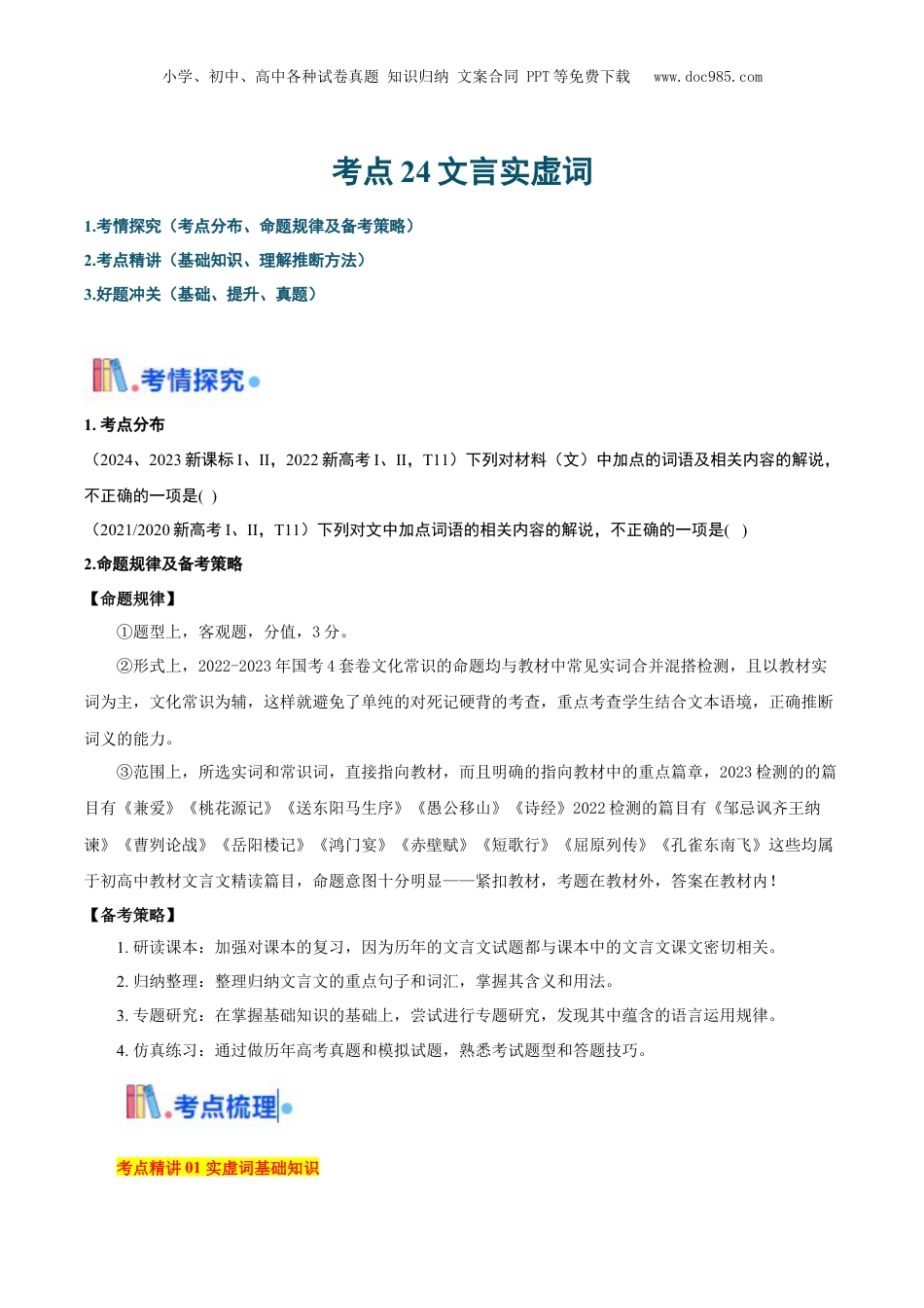 小学、初中、高中各种试卷真题知识归纳文案合同PPT等免费下载www.doc985.com考点24文言实虚词1.考情探究(考点分布、命题规律及备考策略)2.考点精讲(基础知识、理解推断方法)3.好题冲关(基础、提升、真题)1.考点分布(2024、2023新课标I、II,2022新高考I、II,T11)下列对材料(文)中加点的词语及相关内容的解说,不正确的一项是()(2021/2020新高考I、II,T11)下列对文中加点词语的相关内容的解说,不正确的一项是()2.命题规律及备考策略【命题规律】①题型上,客观题,分值,3分。②形式上,2022-2023年国考4套卷文化常识的命题均与教材中常见实词合并混搭检测,且以教材实词为主,文化常识为辅,这样就避免了单纯的对死记硬背的考查,重点考查学生结合文本语境,正确推断词义的能力。③范围上,所选实词和常识词,直接指向教材,而且明确的指向教材中的重点篇章,2023检测的的篇目有《兼爱》《桃花源记》《送东阳马生序》《愚公移山》《诗经》2022检测的篇目有《邹忌讽齐王纳谏》《曹刿论战》《岳阳楼记》《鸿门宴》《赤壁赋》《短歌行》《屈原列传》《孔雀东南飞》这些均属于初高中教材文言文精读篇目,命题意图十分明显——紧扣教材,考题在教材外,答案在教材内!【备考策略】1.研读课本:加强对课本的复习,因为历年的文言文试题都与课本中的文言文课文密切相关。2.归纳整理:整理归纳文言文的重点句子和词汇,掌握其含义和用法。3.专题研究:在掌握基础知识的基础上,尝试进行专题研究,发现其中蕴含的语言运用规律。4.仿真练习:通过做历年高考真题和模拟试题,熟悉考试题型和答题技巧。考点精讲01实虚词基础知识小学、初中、高中各种试卷真题知识归纳文案合同PPT等免费下载www.doc985.com一、文言实词阅读文言文,遇到最多的是文言实词。所谓文言实词,是指有实在意义、能够单独充当句子成分、一般能单独回答问题的词。它包括名词、动词、形容词、数词、量词五类。要了解文言实词,一定要重点掌握一词多义、古今异义词、通假字、偏义复词(同义复词)这四类文言实词特殊现象。文言实词中单音节词居多,但也有不少双音节甚至多音节词汇。这往往是我们阅读文言文时容易出现的一个盲点。(一)一词多义所谓一词多义,是指一个词在不同的语境中具有不同的含义。一词多义是古汉语中的一个普遍现象。要把握一词多义,就要了解词的本义、引申义和比喻义。【本义】词的本义有两种解释:一种是就词的来源来说,即词产生时的最初的意义,如“本”的本义是“草木的茎或根”;另一种是就词的应用来说,把词的最常用的意义当作本义,也叫“基本义”,如“道”的基本义是“路,道路”。【引申义】词的引申义,就是词由本义派生出的与本义相关的其他意义。如“兵”的本义为武器,后引申为使用武器的人,即士兵,又引申为军队,由此进一步引申为战争,又引申为兵法。【比喻义】词的比喻义,就是词的本义通过打比方而产生的意义。如“首领”的本义是“头和颈”,比喻义是“为首的人”。(二)古今异义文言文中出现的某个词语,在形式上与现代汉语某个词语完全一致,但在古代与在现代的意义与用法有差异,这类词叫作古今异义词。特别是现代有些双音节词在古代很可能是两个单音节词。这种意义和用法上的差异是在语言演变的过程中出现的,有以下几种类型:【词义扩大】如“中国”,古义一般指中原地区,也指京师;今义则指整个中国。如“江”“河”,古义一般特指长江、黄河,今义则泛指一般的江河。【词义缩小】如“丈夫”,古义指:①成年男子;②大丈夫,有志气有作为的男子;③女子配偶。今义指:①成年男子;②女子配偶。小学、初中、高中各种试卷真题知识归纳文案合同PPT等免费下载www.doc985.com【词义转移】如“币”,古义指礼物,今义指钱。【词义弱化】“病”,古代的基本义是“重病”,轻微的病一般用“疾”;而现在,只要是生理上或心理上出现不正常的情况,都通称为“病”,不再单纯表示“重病”这个意思。【词义强化】“恨”,古代多表示“遗憾,不满意”的意思;现在则表示“仇恨,怨恨”的意思。【感情色彩变化】“卑鄙”,古义指身份低微,见识短浅,无贬义;今义指...