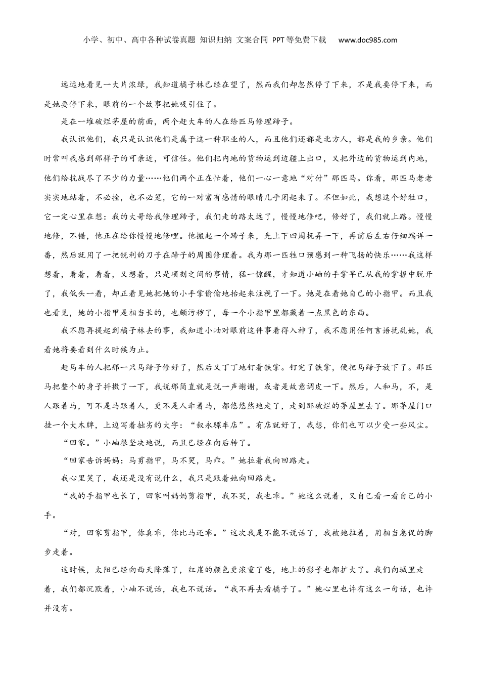 小学、初中、高中各种试卷真题知识归纳文案合同PPT等免费下载www.doc985.com专题突破卷02文学类文本阅读建议用时:60分钟满分:65分实际得分:分一.(2022·新高考Ⅱ卷·高考真题)阅读下面的文字,完成下面小题。(本题共4小题,16分)到橘子林去李广田小孩子的记忆力真是特别好,尤其是关于她特别有兴趣的事情,她总会牢牢地记着,到了适当的机会她就会把过去的事来问你,提醒你。“爸爸,你领我去看橘子林吧,橘子熟了,满树上是金黄的橘子。”今天,小岫忽然向我这样说,我稍稍迟疑了一会,还不等回她,她就又抢着说了:“你看,今天是晴天,橘子一定都熟了,爸爸说过领我去看的。”我这才想起来了,那是很多天以前的事情,我曾领她到西郊去。那里满坑满谷都是橘子,但那时橘子还是绿的,她并不觉得好玩,只是说:“这些橘子几时才能熟呢?”“等着吧,等橘子熟了,等一个晴天的日子,我就领你来看看了。”这地方阴雨的日子真是太多,偶然有一次晴天,就令人觉得非常稀罕,简直觉得这一日不能随便放过。小孩子对于这一点也该是敏感的,于是她就这样问我了。去吗,那当然是要去,并不是为了那一言的然诺,却是为了这一股子好兴致。我们走到了大街上。今天,真是一切都明亮了起来,活跃了起来。石头道上的水洼子被阳光照着,像一面面的镜子;女人头上的金属饰物随着她们的脚步一明一灭;挑煤炭的出了满头大汗,脱了帽子,就冒出一大片蒸气,而汗水被阳光照得一闪一闪的。天空自然是蓝的了,一个小孩子仰脸看天,也许是看一只鸽子,两行小牙齿放着白光,真是好看。小岫自然是更高兴的,别人的高兴就会使她高兴,别人的笑声就会引起她的笑声。可是她可并没有像我一样关心到这些街头的景象。她毫没有驻足而稍事徘徊的意思,她的小手一直拉着我向前走,她心里一定是只想着到橘子林去。走出城,人家稀少了,景象也就更宽阔了,也听到好多地方的流水声了,看不到洗衣人,却听到洗衣人的杵击声,而那一片山,那红崖,那岩石的纹理,层层叠叠,甚至是方方正正的,仿佛是由人工所垒成,没有云,也没有雾,崖面上为太阳照出一种奇奇怪怪的颜色,真像一架金碧辉煌的屏风,还有瀑布,看起来像一丝丝银线一样在半山里飞溅。我看着眼前这些景物,虽然手里还握着一只温嫩的小胖手,我却几乎忘掉了我的小游伴。而她呢,她也并不扰乱我,我想,她不会关心到眼前这些景物的,她心里大概只想着到橘子林去。小学、初中、高中各种试卷真题知识归纳文案合同PPT等免费下载www.doc985.com远远地看见一大片浓绿,我知道橘子林已经在望了,然而我们却忽然停了下来,不是我要停下来,而是她要停下来,眼前的一个故事把她吸引住了。是在一堆破烂茅屋的前面,两个赶大车的人在给匹马修理蹄子。我认识他们,我只是认识他们是属于这一种职业的人,而且他们还都是北方人,都是我的乡亲。他们时常叫我感到那样子的可亲近,可信任。他们把内地的货物运到边疆上出口,又把外边的货物运到内地,他们给抗战尽了不少的力量……他们两个正在忙着,他们一心一意地“对付”那匹马。你看,那匹马老老实实地站着,不必拴,也不必笼,它的一对富有感情的眼睛几乎闭起来了。不但如此,我想这个好牲口,它一定心里在想:我的大哥给我修理蹄子,我们走的路太远了,慢慢地修吧,修好了,我们就上路。慢慢地修,不错,他正在给你慢慢地修哩。他搬起一个蹄子来,先上下四周抚弄一下,再前后左右仔细端详一番,然后就用了一把锐利的刀子在蹄子的周围修理着。我为那一匹牲口预感到一种飞扬的快乐……我这样想着,看着,看着,又想着,只是顷刻之间的事情,猛一惊醒,才知道小岫的手掌早已从我的掌握中脱开了,我低头一看,却正看见她把她的小手掌偷偷地抬起来注视了一下。她是在看她自己的小指甲。而且我也看见,她的小指甲是相当长的,也颇污秽了,每一个小指甲里都藏着一点黑色的东西。我不愿再提起到橘子林去的事,我知道小岫对眼前这件事看得入神了,我不愿用任何言语扰乱她,我看她将要看到什么时候为止。赶马车的人把那一只马蹄子修好了,然后又丁丁地钉着铁掌。钉完了铁掌,便把马蹄子放下了。那匹马把整个的身子抖擞了一下,...