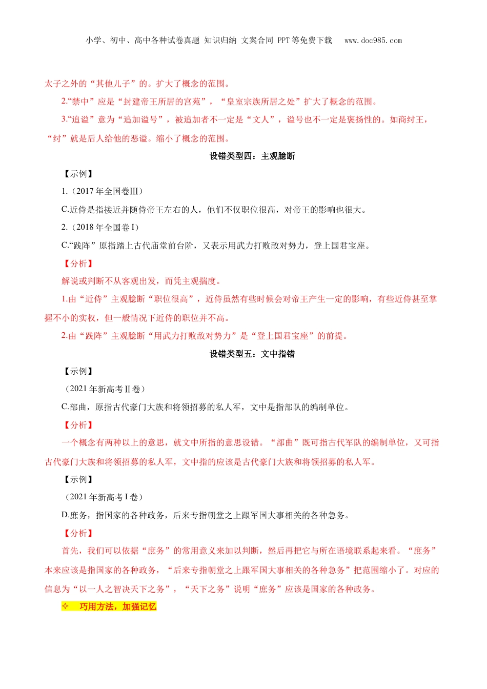 小学、初中、高中各种试卷真题知识归纳文案合同PPT等免费下载www.doc985.com考点23文化常识1.考情探究(考点分布、命题规律及备考策略)2.考点精讲(设错方法、课内外常见文化常识)3.好题冲关(基础、提升、真题)1.考点分布(2024、2023新课标I、II,2022新高考I、II,T11)下列对材料(文)中加点的词语及相关内容的解说,不正确的一项是()(2021/2020新高考I、II,T11)下列对文中加点词语的相关内容的解说,不正确的一项是()2.命题规律及备考策略【命题规律】①题型上,客观题,分值,3分。②范围上,教考衔接的趋势日益明显,同时关注中学阶段重点常识的考查。③2021年之前,国考四套卷文化常识的考核都主要集中在古代的一些称谓、官职的变迁、建筑的名称、年号、谥号、庙号、一些文书的名称、官场的一些礼节、朝廷的一些机构、典章制度、行政区划、还有一些避讳的说法等。近2年题型变化后,这些依然会考,只是更灵活,也零散,平时注意积累,尤其是课本的注释的相关内容,答题时还要注意结合语境的含义即可作答。【备考策略】1.研读课本:加强对课本的复习,因为历年的文言文试题都与课本中的文言文课文密切相关。2.归纳整理:整理归纳文言文的重点句子和词汇,掌握其含义和用法。3.专题研究:在掌握基础知识的基础上,尝试进行专题研究,发现其中蕴含的语言运用规律。4.仿真练习:通过做历年高考真题和模拟试题,熟悉考试题型和答题技巧。考点精讲01常见设错方法设错类型一:以今释古【示例】(2017年全国卷Ⅱ)小学、初中、高中各种试卷真题知识归纳文案合同PPT等免费下载www.doc985.comB.收考,指先行将嫌犯拘捕关进监狱,然后再作考察,进行犯罪事实的取证工作。【分析】在解释词语的意义时设置干扰内容,以今义代替古义。“考”不是现代汉语中的“考察”之意,而是“拷”的通假字,是“拷问”之意。设错类型二:张冠李戴【示例】1.(2019年全国卷I)A.诸子百家是先秦至汉初学术派别的总称,其中又以道、法、农三家影响最深远。2.(2019年全国卷Ⅱ)B.汤武即商汤与孙武的并称,他们二人均以善于用人用计、战功赫赫留名于青史。3.(2020年全国卷I)B.殿试是中国古代科举制度中最高一级的考试,在殿廷举行,由丞相主持。【分析】在词语指代的对象上设置干扰,将甲说成是乙。1.诸子百家中,影响最为深远的是儒、道、法三家。选项把“农家”归为此类。2.“武”不是指古代军事家孙武,而是指周武王,古人常常将商汤与周武王这两位君主并称。3.殿试又称“廷试”,是皇帝对会试录取的贡士在殿廷上亲自策问的考试,因此,主持人应当是皇帝,而不是丞相。设错类型三:扩缩范围【示例】1.(2015年全国卷I)D.太子指封建时代君主儿子中被确定继承君位的人,有时也可指其他儿子。2.(2020年全国卷Ⅱ)C.禁中,又称禁内,指皇室宗族所居之处,因所居宫室严禁随便进出得名。3.(2022年新高考模拟卷)D.追谥,古人为追念死去的文人,根据其生前行迹给予的某种称号,带有褒扬与纪念的意义。如范仲淹被追谥为“文正”。【分析】扩大或缩小某个概念的范围。1.在太子“被确定”成为“继承君位的人”这一条件下,是不可能再用“太子”这一特定称谓来指代小学、初中、高中各种试卷真题知识归纳文案合同PPT等免费下载www.doc985.com太子之外的“其他儿子”的。扩大了概念的范围。2.“禁中”应是“封建帝王所居的宫苑”,“皇室宗族所居之处”扩大了概念的范围。3.“追谥”意为“追加谥号”,被追加者不一定是“文人”,谥号也不一定是褒扬性的。如商纣王,“纣”就是后人给他的恶谥。缩小了概念的范围。设错类型四:主观臆断【示例】1.(2017年全国卷Ⅲ)C.近侍是指接近并随侍帝王左右的人,他们不仅职位很高,对帝王的影响也很大。2.(2018年全国卷I)C.“践阵”原指踏上古代庙堂前台阶,又表示用武力打败敌对势力,登上国君宝座。【分析】解说或判断不从客观出发,而凭主观揣度。1.由“近侍”主观臆断“职位很高”,近侍虽然有些时候会对帝王产生一定的影响,有些近侍甚至掌握不小的实权,但一般情况下近侍的职位并不高。2.由“践阵”主观臆断“用武力打败敌对势力”是“登上国君宝座”的前...