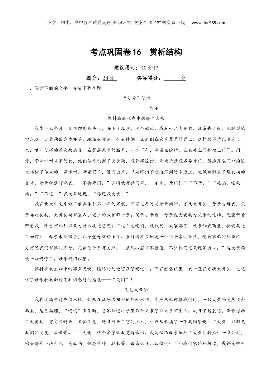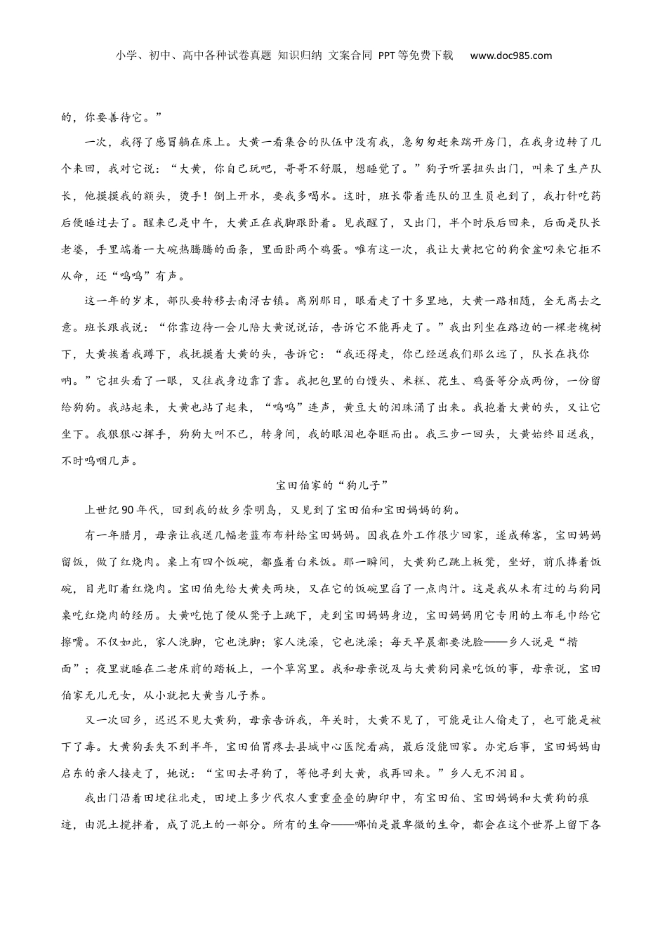 小学、初中、高中各种试卷真题知识归纳文案合同PPT等免费下载www.doc985.com考点巩固卷16赏析结构建议用时:40分钟满分:28分实际得分:分一.阅读下面的文字,完成下列小题。“大黄”记情徐刚颤抖在我生命中的那声犬吠我生下三个月,父亲即因病去世,丢下了母亲、两个姐姐、我和一只大黄狗。母亲告诉我,儿时摸墙学走路,大黄狗便亦步亦趋,跟在我旁边,如我摔倒,正好倒在它毛茸茸的背上。这样的事情已没有记忆,唯一记得的是它的离世。在萧瑟寒冷的腊月,一个下午,母亲在纺纱,让我关上门并插上门闩。门外,堂哥呼叫我家的狗,他们似乎捉到了大黄狗,我觉得惊讶,母亲示意我不要开门,然后是宅门口沟边大杨树下传来的一声惨叫。母亲哭了,没有出声,只是眼泪不断地落到纺车边上。晚饭时飘来了烧狗肉的香味,母亲特意叮嘱我:“不要开门。”少顷便有拍门声:“弟弟,开门!”“不开。”“趁热,吃狗肉。”“不吃!”我大声地说,“你还我大黄!”我在北大中文系做工农兵学员第一年的寒假,回家过年时与母亲闲聊,言及大黄狗,母亲告诉我,父亲喜欢狗狗,大黄狗与家里人、宅上的叔伯都很亲。父亲去世后,母亲视大黄狗为父亲的遗物,还能帮着照看我,珍贵何比!那又为什么要吃它呢?“过年想吃肉,没钱买,大家都穷,便来和我商量,把黄狗吃了如何?”母亲未及回应,几个堂哥就动手了。当时这在乡间是一件很平常的事情,吃自家养的狗而已!更何况我们家孤儿寡母,几位堂哥多有关照。“虽然心里极不情愿,不让他们吃又说不出口。”这大黄狗便一命呜呼了。母亲洒泪以祭。颤抖在我生命中的那声犬吠,隐隐约约地留在了记忆中。而在潜意识里,我一直在寻找大黄狗,也记住了母亲教我面对某种诱惑时的态度——“关门”!又见大黄狗我在读高中时应征入伍,部队在江苏溧阳种地瓜和水稻。生产队长迎接我们时,一只大黄狗突然飞奔而至,尾巴高翘,“呜呜”声不断,它不知道村子里为什么来了那么多陌生人。次日早起晨练,声音惊动了大黄狗,它匆匆赶来,又怕又急,转身叫来了它的主人,生产队长摸了一下狗脑袋说:“大黄,那都是我们的朋友,兵哥哥。”“大黄”这个名字让我觉得亲切。我写信给母亲细数了大黄的特点:一身金毛,唯头部有小块白毛,是母狗,体态略胖,腿长等。母亲让侄儿回信说:“和我们家的狗极像,或许是转世小学、初中、高中各种试卷真题知识归纳文案合同PPT等免费下载www.doc985.com的,你要善待它。”一次,我得了感冒躺在床上。大黄一看集合的队伍中没有我,急匆匆赶来踹开房门,在我身边转了几个来回,我对它说:“大黄,你自己玩吧,哥哥不舒服,想睡觉了。”狗子听罢扭头出门,叫来了生产队长,他摸摸我的额头,烫手!倒上开水,要我多喝水。这时,班长带着连队的卫生员也到了,我打针吃药后便睡过去了。醒来已是中午,大黄正在我脚跟卧着。见我醒了,又出门,半个时辰后回来,后面是队长老婆,手里端着一大碗热腾腾的面条,里面卧两个鸡蛋。唯有这一次,我让大黄把它的狗食盆叼来它拒不从命,还“呜呜”有声。这一年的岁末,部队要转移去南浔古镇。离别那日,眼看走了十多里地,大黄一路相随,全无离去之意。班长跟我说:“你靠边待一会儿陪大黄说说话,告诉它不能再走了。”我出列坐在路边的一棵老槐树下,大黄挨着我蹲下,我抚摸着大黄的头,告诉它:“我还得走,你已经送我们那么远了,队长在找你呐。”它扭头看了一眼,又往我身边靠了靠。我把包里的白馒头、米糕、花生、鸡蛋等分成两份,一份留给狗狗。我站起来,大黄也站了起来,“呜呜”连声,黄豆大的泪珠涌了出来。我抱着大黄的头,又让它坐下。我狠狠心挥手,狗狗大叫不已,转身间,我的眼泪也夺眶而出。我三步一回头,大黄始终目送我,不时呜咽几声。宝田伯家的“狗儿子”上世纪90年代,回到我的故乡崇明岛,又见到了宝田伯和宝田妈妈的狗。有一年腊月,母亲让我送几幅老蓝布布料给宝田妈妈。因我在外工作很少回家,遂成稀客,宝田妈妈留饭,做了红烧肉。桌上有四个饭碗,都盛着白米饭。那一瞬间,大黄狗已跳上板凳,坐好,前爪捧着饭碗,目光盯着红烧肉。宝田伯先给大黄夹两块,又在它的饭碗里舀了一点肉...