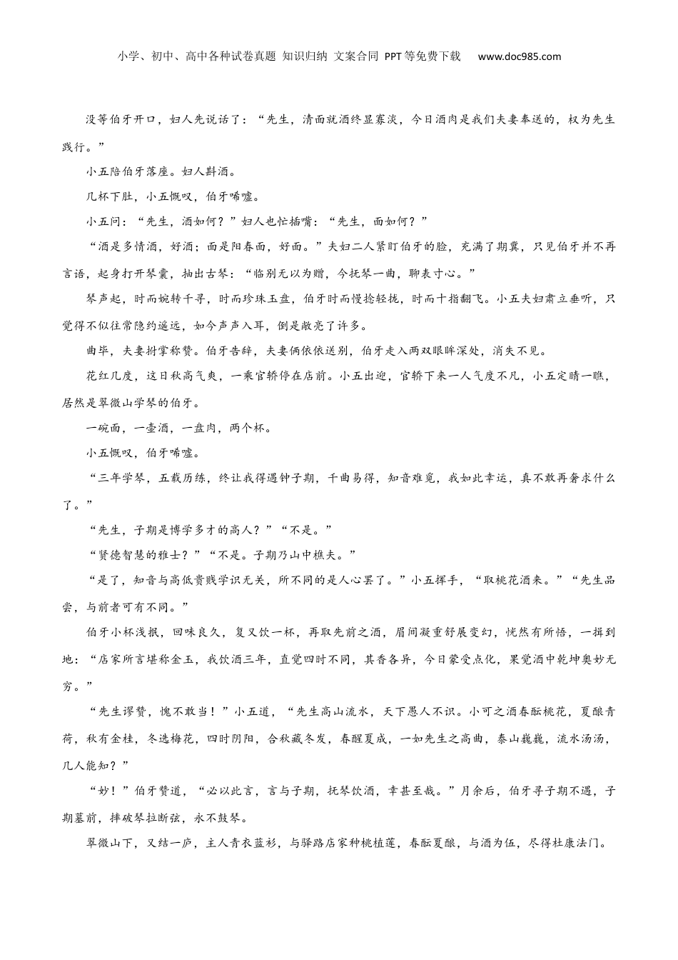 小学、初中、高中各种试卷真题知识归纳文案合同PPT等免费下载www.doc985.com考点巩固卷13赏析环境建议用时:40分钟满分:24分实际得分:分一.阅读下面的文字,完成下面小题。知音唐风翠微山下,驿路道旁,两间茅屋,一面酒旗。茅屋是个小店,夫妻店,只卖三样东西,清面,酱肉,百花酒。客人都是赶脚的旅人,一落座,免费的大碗茶咕咚咕咚几口,夏祛暑冬生暖。男人切一斤肉,打半壶酒,劳乏尽去,喊一声:“好酒好肉。”打赏,跨马,绝尘而去。女人便一碗清面,吃得粉面生津,暖意洋洋,万福谢过,两声鞭响,车咿咿呀呀被夫妻眺望成一个黑点,消失在驿路尽头。这日,闲暇无客。小五乐呵呵对老婆夸耀:“瞧瞧,咱卤的肉,咱酿的酒,哪个不说好。夏祛冬生暖,一碗酒下去,母羊羔都能斗恶狼。”妇人一撇嘴:“我的清面,淡雅鲜香,哪个吃过的夫人小姐不夸,啧啧,连汤都不剩一口呢。”驿路空阔,四野幽静,山上又隐隐传来琴声。夫妻二人顿时闭了嘴,这抚琴的人是店里唯一的常客,三年了日日下来打酒,爱吃店家的清汤面,如此常客却是从不曾夸过一句酒好面好。小五悴悻道:“抚琴的大都是酸臭文人,哪知酒肉之妙,更不懂世故人情。”妇人低低道:“难不成其他客人都是饥不择食,疲乏饥饿才觉得咱的酒饭香。”二人不语,琴声入耳,高高低低,悠悠扬扬。总比四下寂静要好,小五想。鸟鸣唤出了晨曦,春花烂漫,薄雾流纱,山上下来一个文士,青衣蓝衫,身背琴囊。几声叩门,一声轻唤。“谁啊?这么早。”“店家,伯牙多有打扰。”“哦,你呀。”老面孔,旧相识,小五开门迎客。“店家哥,我今日学成出山,专程来吃碗面,喝杯酒,与您告别。”“恭喜先生,贺喜先生,想起来先生光顾小店三年有余了。”“正是,正是!”伯牙举目望向翠微山,云雾飘绕苍山滴翠,看不见山顶那几栋茅屋。说话间,妇人已端上来,一碗面,一壶酒,一盘肉,两个杯。小学、初中、高中各种试卷真题知识归纳文案合同PPT等免费下载www.doc985.com没等伯牙开口,妇人先说话了:“先生,清面就酒终显寡淡,今日酒肉是我们夫妻奉送的,权为先生践行。”小五陪伯牙落座。妇人斟酒。几杯下肚,小五慨叹,伯牙唏嘘。小五问:“先生,酒如何?”妇人也忙插嘴:“先生,面如何?”“酒是多情酒,好酒;面是阳春面,好面。”夫妇二人紧盯伯牙的脸,充满了期冀,只见伯牙并不再言语,起身打开琴囊,抽出古琴:“临别无以为赠,今抚琴一曲,聊表寸心。”琴声起,时而婉转千寻,时而珍珠玉盘,伯牙时而慢捻轻拢,时而十指翻飞。小五夫妇肃立垂听,只觉得不似往常隐约遥远,如今声声入耳,倒是敞亮了许多。曲毕,夫妻拊掌称赞。伯牙告辞,夫妻俩依依送别,伯牙走入两双眼眸深处,消失不见。花红几度,这日秋高气爽,一乘官轿停在店前。小五出迎,官轿下来一人气度不凡,小五定睛一瞧,居然是翠微山学琴的伯牙。一碗面,一壶酒,一盘肉,两个杯。小五慨叹,伯牙唏嘘。“三年学琴,五载历练,终让我得遇钟子期,千曲易得,知音难觅,我如此幸运,真不敢再奢求什么了。”“先生,子期是博学多才的高人?”“不是。”“贤德智慧的雅士?”“不是。子期乃山中樵夫。”“是了,知音与高低贵贱学识无关,所不同的是人心罢了。”小五挥手,“取桃花酒来。”“先生品尝,与前者可有不同。”伯牙小杯浅抿,回味良久,复又饮一杯,再取先前之酒,眉间凝重舒展变幻,恍然有所悟,一揖到地:“店家所言堪称金玉,我饮酒三年,直觉四时不同,其香各异,今日蒙受点化,果觉酒中乾坤奥妙无穷。”“先生谬赞,愧不敢当!”小五道,“先生高山流水,天下愚人不识。小可之酒春酝桃花,夏酿青荷,秋有金桂,冬选梅花,四时阴阳,合秋藏冬发,春醒夏成,一如先生之高曲,泰山巍巍,流水汤汤,几人能知?”“妙!”伯牙赞道,“必以此言,言与子期,抚琴饮酒,幸甚至哉。”月余后,伯牙寻子期不遇,子期墓前,摔破琴拉断弦,永不鼓琴。翠微山下,又结一庐,主人青衣蓝衫,与驿路店家种桃植莲,春酝夏酿,与酒为伍,尽得杜康法门。小学、初中、高中各种试卷真题知识归纳文案合同PPT等免费下载www.doc985.com店家小五深叹:“世间少了个琴师,我的百花美酒多了...