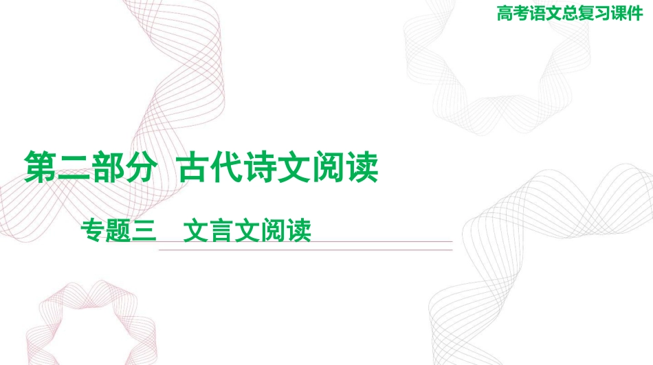 高考语文总复习课件第二部分古代诗文阅读专题三文言文阅读命题探究考向分析近三年新高考卷文言文阅读共有5道题,涉及“文言断句”“文言实词(文化常识)”“筛选并整合文中信息(含主观简答题)”和“文言翻译”四个考点,文言虚词、句式等考点隐含在“文言翻译”中考查1.选材范围相对扩大:文言文的出题范围跳出了以往的二十四史这个长期默认的范围,向外延伸。2021年新高考Ⅰ卷选自《通鉴纪事本末·贞观君臣论治》,2021年新高考Ⅱ卷选自《通鉴纪事本末·祖逖北伐》;2022年新高考Ⅰ卷选自《战国策·魏策三》,2022年新高考Ⅱ卷选自《东观汉记》;2023年新高考Ⅰ卷选自《韩非子·难一》和《孔丛子·答问》,2023年新高考Ⅱ卷选自《百战奇略》和《唐太宗李卫公问对》(续表)考向分析2.“内”“外”兼顾初见端倪:高考文言文阅读的材料虽然出自课外,但根在课本。2022年新高考卷的设题表现了这个新苗头。如2022年新高考Ⅰ卷文化常识的出题范围也不再局限于所给课外选文,而是“内”“外”兼顾,将材料“为赵蔽”中的“蔽”字与教材《邹忌讽齐王纳谏》“王之蔽”中的“蔽”字的含义加以比较,和课文联系更紧密;2023年新高考Ⅰ卷、Ⅱ卷在文言实词这一考点上也分别与课文《兼爱》和《桃花源记》联系考查3.考查形式更加灵活:2022年新高考稳中有变,如2022年Ⅰ卷不再是单纯地考查文化常识,而是与文言实词混合考查,Ⅱ卷不仅考查了“衔枚”“车驾”两个文化常识,还考查了“差强人意”和“尊重”两个词。经过上一年的过渡,2023年新高考不再考查文化常识,而代之以文言实词,而且“文言断句”改为在答题卡上涂黑答案标号(续表)题型分布近三年新高考卷文言文阅读题型稳定,其中“文言断句”“文言实词(文化常识)”“筛选并整合文中信息”这三个考点多以选择题的形式考查。2021年、2022年、2023年新高考Ⅰ卷、Ⅱ卷均沿袭这三个考点,其中“文言断句”题型由选择题改为主观题,其余两个题型不变。“文言翻译”和主观简答题则一直采用主观题型,一直未变襄子①于晋中,出,有功者五人,高赫首。孟围阳围赏为赏张高考演练一、(2023年新高考Ⅰ卷)阅读下面的文言文,完成1~5题。材料一:曰:谈“晋之阳事,赫无大功,今首,何也?为赏”襄子曰:“晋之事,寡人家危,社稷殆矣。阳国吾群臣无有不侮之意者,唯骄赫子不失君臣之,是以先之。礼”仲尼之,曰:“善哉,襄闻赏.子!一人而天下人臣者莫敢失矣。赏为礼”或曰:仲尼不知善赏矣。夫善赏罚者,百官不敢侵,群臣不敢失。上其法,而职礼设下无奸之心。如此,可善矣。襄子有君臣之,操诈则谓赏罚亲泽令行禁止之法,而有侮之臣,是襄子失也。人臣者,乘犹骄罚为事而有功。今赫不侮,而襄子之,是失也。故曰:则赏仅骄赏赏仲尼不知善。赏(自《非子节选韩·一》难)人有武臣,子陈谓鲋②曰:“子立法,其所以夫子之者韩异论材料二:如也。予每探其意而校其事,持久,遏奸纷历远劝善,氏未必韩非,孔氏未必得也。若非者,亦世之人也。韩当圣”子曰:“今鲋世人有言高者必以天,极为称言下者必以深名。好事而穿渊为凿者,必言以自,援以自,欲以取信于群愚而度其也。经辅圣贤说若子之,其皆然。诸书义略一隅,而君子其信否焉。请说审”武...臣曰:“。”诺子曰:鲋“乃者、共知氏,襄子之行,赵韩并赵赏先加具臣而后有功。韩非书云夫子善之引以张本然后难之岂有不似哉?然也。何以明其然?昔我先君以春秋哀公十六年四月实诈己丑卒,至二十七年荀、、魏伐,遇恒而,是瑶与韩赵郑陈还时夫子卒已十一年矣,而晋四卿皆在也。后悼公十四年,知氏乃亡。此先后甚,而非公之,曾无怍意。是世多好事之徒,皆远韩称则非之罪也。故吾以是默口于小道,塞耳于子久矣。而子立尺表诸..以度天,植寸指以,矇大道而不悟,信以疑,殆非所测渊诬说圣望也。”(自《孔子节选丛·答》问)【注释】①襄子:襄子。春秋赵末年,知、、、魏四家赵韩把持晋政,国国称“晋四卿”。晋之,知氏阳战(荀瑶)合、联韩魏攻,反被襄子合、魏。②子:即孔,孔子八赵赵联韩灭杀鲋鲋世。孙1.材料二画波浪线的部分有三处需要断句,请用铅笔将答题卡上相应位置的答案标号涂黑,每涂对一处给1分,...