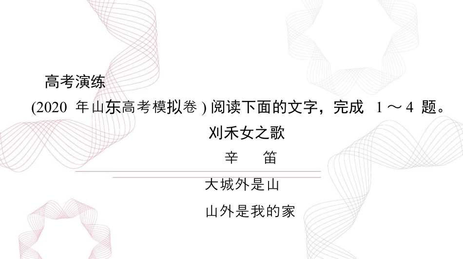 高考语文总复习课件第一部分现代文阅读Ⅱ专题二文学类文本阅读第三节现代诗歌、戏剧阅读高考演练(2020年山高考模卷东拟)阅读下面的文字,完成1~4题。刈禾女之歌辛笛大城外是山山外是我的家我起家中案上的水记长瓶我起下水的深深的井记门车我的眼在唱着原野之歌什我的心也是空而常为么满金的穗子在里黄风摇在雨里生长如今我日光下收来获我想告妹诉给姊们我是原野上的主人吹刀下风过镰也吹我的巾过头在浪里麦我看不自己见的天空有白云蓝是一的队队飞腾马听云你风与在我的刀之下镰奔而骤来一九三七年四月卅日在格高原苏兰1.下列对本诗相关内容的理解,不正确的一项是()A.“大城外是山/山外是我的家”,既点出抒情主人公的出身背景,也含有城市与乡野的对比。B.“我想告诉给姊妹们/我是原野上的主人”,写刈禾女收获时的心理活动,表达她对拥有原野感到欣喜。C.“风吹过镰刀下/也吹过我的头巾”,写刈禾女劳作时的欢快,也写人与自然之间关系的和谐。D.“在麦浪里/我看不见自己”,是从宏阔的视野观看原野,着意写刈禾女在面对原野时的渺小感。解析:D项,“着意写刈禾女在面对原野时的渺小感”错误。诗句是写刈禾女感觉身心与原野融为一体,故选D。答案:D2.下列对本诗艺术特色的分析鉴赏,不正确的一项是()A.诗歌前四行,从“大城”“山”转向“水瓶”“井”,节奏也变得舒缓,这种变化带有情感倾向。B.“金黄的穗子在风里摇/在雨里生长”,是静与动、空间与时间的结合,这是该诗常用的表现手法。C.“我的眼在唱着原野之歌”,运用通感的修辞手法,以抒情的笔触表达了刈禾女愉悦的心情。D.“你听风与云/在我的镰刀之下/奔骤而来”,通过使用祈使语气和加快节奏,增强了抒情效果。解析:B项错误。该诗句没有体现“静”和“时间”,故选B。答案:B3.“为什么我的心也是空而常满”中的“空而常满”如何理解?答案:①“空而常满”指“我”的内心如原野般空阔,却十分充盈,感到满足。②具有思辨性和哲理性,引起读者的思考。4.诗歌从刈禾女的角度抒情,这样写有什么好处?请结合诗歌简要分析。答案:①可直陈内心,并将眼前所见与个人记忆结合起来,让刈禾女的形象更为丰满。②通过刈禾女情绪的起伏变化,形成内在的韵律感。③充分调动个人感官,多角度呈现人与原野的关系。④从“我”的角度抒情,“我”既指刈禾女,有时也可指诗人,增加了诗歌的层次感。【知识储备】一、现代诗歌(一)现代诗歌的定义现代诗歌一般指五四运动以后在继承发扬民歌和中国古典诗歌优秀传统的基础上,借鉴吸收西方诗歌的表现形式、表现手法而逐渐发展形成的诗歌。现代诗歌用白话写作,打破了旧诗词格律的束缚,形式上灵活自由,句式参差,但有其内在的节奏和音乐性,比较适合反映现实生活,表达现代人的思想情感。(二)现代诗歌的特点(1)形式比较自由。(2)内涵是开放的。(3)意象经营重于修辞。(4)有高度的概括性、鲜明的形象性、浓烈的抒情性,以及和谐的音乐性,形式上分行排列。(三)现代诗歌的分类1.叙事诗和抒情诗这是按照作品内容的表达方式划分的。(1)叙事诗。诗中有比较完整的故事情节和人物形象,通常以诗人满怀激情的歌唱方式来表现。史诗、故事诗、诗体小说等都属于这一类。史诗如古希腊荷马的《伊利亚特》和《奥德赛》;故事诗如我国诗人李季的《王贵与李香香》;诗体小说如英国诗人拜伦的《唐璜》,俄国诗人普希金的《叶甫盖尼·奥涅金》。(2)抒情诗。抒情诗主要通过直接抒发诗人的思想感情来反映社会生活,不要求描述完整的故事情节和人物形象,如情歌、颂歌、哀歌、挽歌、牧歌和讽刺诗。这类作品很多,这里不一一列举。当然,叙事和抒情也不是绝对分割的。叙事诗也有一定的抒情性,不过它的抒情要求与叙事紧密结合。抒情诗也常有对某些生活片段的叙述,但不能铺展,应服从抒情的需要。2.格律诗、自由诗和散文诗这是按照作品语言的音韵格律和结构形式划分的。(1)格律诗。按照一定格式和规则写成的诗歌。它对诗的行数、诗句的字数(或音节)、声调音韵、词语对仗、句式排列等有严格规定,如我国古代诗歌中的律诗、绝句、词和曲,欧洲的十四行诗等。(2)自由诗。近代欧美新发展起来的一种诗体。它不受...