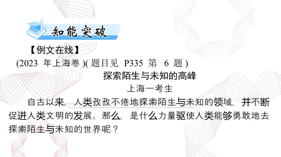 高考语文总复习课件第四部分写作专题十八议论文第三节论据学习目标:1.懂得多渠道积累丰富的论据素材。2.学会正确使用论据的技巧。【例文在线】(2023年上海卷)(题目见P335第6题)探索陌生与未知的高峰上海一考生自古以,人孜孜不倦地探索陌生未知的域,不来类与领并断促人文明的展。那,是什力量使人能勇敢地去进类发么么驱类够探索陌生未知的世界呢?与首先,是好奇心。林堂先生曾:语说“所有科的步,都学进在乎好这奇心。好奇心,就是趣。科明,就是靠趣字而学发这个已。”得。改良蒸汽机的瓦特就是很好的例子。瓦特这话说没错小候,有一次看到火上的水时炉烧开时,水盖扑通扑通地跳。壶因好奇心的使,瓦特把水盖用力了回去,但只要手一离为驱壶摁,盖子就又跳起。他此十分好奇,想知道原因,通一系开来对过列探索和科知的,他最是蒸汽的作用致盖对学识学习终发现导壶的跳。他利用原理改良了蒸汽机,而改了人的史。动这个从变类历此外,尔物理得者克勒尔在一次科探上听到诺贝学奖获贝学讨会科家学们讨论X射,在好奇心的使下,他不地探索和究,线驱断研最了放射性元素。终发现铀其次,是批判性思。人史上之所以有多大的,维类历许伟发现正是因人敢于否定已知,定地去探索陌生、未知的世界。为们坚在洲中世,欧纪“地心”广流,但哥白尼通一系列的说为传过实和探究,最提出了验终“日心”,了天文说实现的根本革,学变人生了巨大的影。哥白尼什能探索陌生、未知的对类产响为么够世界而提出日心?很大程度上是因他具有批判性思,敢于说为维大胆提出疑,敢于否定支配了人上千年的理。此外,问类错误论明代著名思想家王守仁儒家思想敢于大胆提出疑,用批对传统怀判性思去思考,才有了他在哲思想上辟蹊,了维学独径开创“心学”。最后,是任心。任心的背后往往是家的、人民责责对国爱对的。在中近代,例子不。了救,了改中爱国这种数胜数为国为变落后和挨打的,无思想醒的先知分子立志要国现状数觉进识“为中之崛起而华读书”。他在革命的道路上不探索,是于他们断缘们的情和想家力量的任心。中爱国怀为国贡献责国“交水稻之父”杂袁隆平,了人吃上,在水稻育为让国饱饭上不探索,最种断终开辟出交水稻之路,解了中人的吃。杂决国饭问题探索陌生未知的高峰,手中至少握着好奇心、批判性与应该思和任心三把登山杖。人未知的勇敢探索就了今日维责这类对铸的美好生活。史上每一敢于向寂黑暗亮出手中明灯的人,历个静都被人;每一向未知的脚印都被入史。应该们铭记个迈应该载册是他,人的大厦上了自己的一,出了一力。们为类递块砖献份点评:①论据典型,以理服人。考生用林语堂、周恩来的箴言名句和贝克勒尔、袁隆平等中外人物的经典事例,作为道理论据与事实论据,对中心论点进行了不容置疑的论证,真正做到了有理有据、以理服人。②层次分明,脉络清晰。文章紧紧围绕中心论点,分别从好奇心、批判性思维和责任心三个角度展开论证,给人以一清二楚、结构分明之感。【技法点拨】议论文的写作,论点、论据、论证三要素缺一不可。其中,论点是统帅,赞同什么、反对什么要旗帜鲜明,不可含糊其词。论据是支撑,无论引用的是道理论据,还是事实论据,目的都是为论证论点服务,为充实内容服务。那么,在实际写作中,在处理论点与论据的关系时有哪些误区?该怎样多渠道积累丰富的论据素材?正确使用论据又有哪些技巧呢?(一)论据使用的误区1.一味堆砌,缺少联系代史家司了一部史,小存史,在汉学马迁为写书从研读库书不幸遭受刑之后,他有因世人的白眼唾弃而放弃,宫并没为与选择反而更加潜心史,于出了被后世钻研经终写誉为“史家之唱,绝无韵之离”的《史》。《史》成了厚的文化,骚记记实宝贵遗产千古流。传文化英雄迅用他那刀般利的文字民党、黑暗社鲁枪锋与国与作斗,然反派其恨之入骨,其行迫害,但迅毫会争虽动对对进鲁无色,出的文章反而一篇比一篇得人心痛。惧写来捅敌误区揭示:写议论文少不了论据,但是不是把几个论据堆砌在一起就可以呢?显然不是的。上面的文段举出两个人物的事例,却不对两个事例之间的关系做任何剖析,只是简单地排放在一起,这样用材料有什么论证效果呢?像这种...