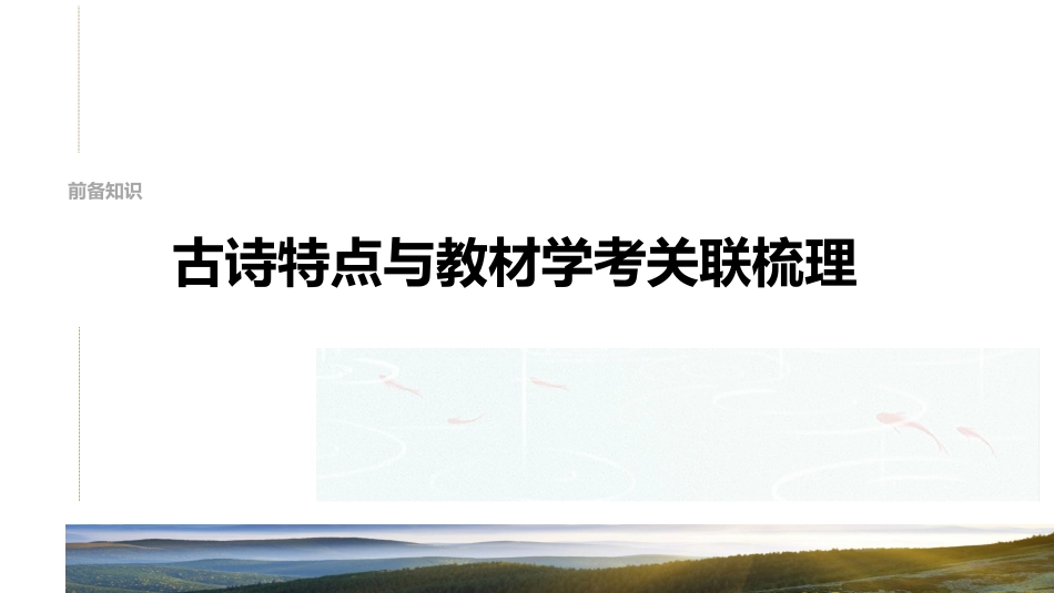 古诗阅读与鉴赏板六块前备知识古诗特点与教材学考关联梳理一、古诗特点1.诗(一)古诗体裁种类阐释分类特点古体诗(古风)唐以前形成的少较格律限制的古诗四言、五言、诗诗七言、言诗杂诗不仗,用韵自由讲对近体诗初唐以后形成的讲究平仄、仗和押对韵的古诗律诗(五律、七律),句绝(五、绝七绝)句、字、平仄、用数数韵都有格限定。律严诗中必仗间两联须对2.词又短句、曲子、、余等,分词称长词乐诗诗长调(91字以上)、中调(59~90字)、小令(58字以内)三。主要特点:有定格、句有定、种调数字有定。声3.曲曲又余。元曲分散曲和。散曲起于金,盛于元,体式称词杂剧兴与相近,包括小令、套。其特点:有字、口化、仗丰富。词数两种衬语对(二)古诗语言一首古,最的是古言,即读懂诗关键读懂诗语读懂“家诗语”。“家诗语”是人作使用的言,言有于日常使用言,也有诗创艺术语这种语别语别于其他文体言。法、句法度看,具有反常性,具体表在三语从词维它现方面:个①于改性,言具有意象性;惯变词语②于改序,言具惯变词语有跳性;跃③于省略成分,言具有凝性。惯语练1.语言“变性”人了字、意的需要,常常改中某些的性,以诗为炼炼变诗词词语词此来增强歌的表力。常的有名活用、形容活用和活用象。诗现见词词动词现例如:①名活用。帽貂裘,千卷平。词锦骑冈(《江城子苏轼·密州出》猎)“帽貂裘锦”意为“戴帽,穿貂裘锦”。②形容活用。春又江南岸,明月何照我?词风绿时还(王安石《泊船瓜洲》)“绿”,使用法,意动为“使……变绿”。③活用。中置酒客,胡琴琵琶羌笛。动词军饮归与(岑《白雪歌参送武判官京》归)“饮”,使用法,意动为“使……酒饮”。【理解小练1】指出下列句中的活用之,理解其含。诗处并义(1)月明星稀,南。乌鹊飞(曹操《短歌行》)答案南,方位名词作状语,表示动作的趋向,向南。(2)出一表名世,千堪伯仲!师真载谁间(游《》陆书愤)答案名,名词作动词,闻名、出名。(3)商人重利离,前月浮梁茶去。轻别买(白居易《琵琶行序》并)答案重、轻,形容词的意动用法,以……为重,以……为轻。2.语言“变序”人,有了强某些意,到某特殊效果,或出于格诗写诗时为调蕴达种律等表的需要,故意改某些的序。主要体在主后置、主达变词顺现语宾位等方面。换例如:①晴川,芳草萋萋洲。历历汉阳树鹦鹉(崔《颢黄鹤》楼)“汉阳树”和“洲鹦鹉”述象,主后置。为陈对为语②妹弟兄皆列土,可怜光彩生。姊门户(白居易《恨歌》长)“光彩生门户”应为“生光彩门户”,主位。为宾换【理解小练2】指出下列句中的序倒之及其妙。诗语颠处处(1)千古江山,英雄无,仲。觅孙谋处(辛弃疾《永遇乐·京口北固亭怀古》)答案“英雄无觅,孙仲谋处”正常语序应为:无处觅英雄孙仲谋。颠倒语序,既合乎平仄需要,又突出了“英雄”一词。(2)竹喧浣女,下舟。归莲动渔(王《山居秋暝》维)答案正常语序应为:竹喧浣女归,莲动渔舟下。因平仄的限制,主语后置,动词前置,使诗句读起来更富有韵味,更生动有致。(3)香稻啄余粒,碧梧栖老凰枝。鹦鹉凤(杜甫《秋八首》兴)答案正常语序应为:鹦鹉啄余香稻粒,凤凰栖老碧梧枝。这两句诗主要是写长安的风物之美,强调那里的稻米和梧桐非同寻常——稻米是被鹦鹉偏爱啄食的香稻,梧桐是凤凰栖息的碧梧。杜甫不遵循常规,将原属宾语位置上的“香稻粒”与“碧梧枝”,硬是拆开来变成分属主、宾位置的词语,遂使诗句在一种拗折的韵味中,透露出奇崛不平的情味来。3.语言“省略”歌句之往往具有跳性,于是生了省略象,出了空白,诗语间跃产现现而者留下了想象空。古省略主要有特点:从为读间诗两个①答含话蕴问;话②意象合。组例如:①松下童子,言采去。只在此山中,云深不知。问师药处(《者不遇》贾岛寻隐)作者采用答含的方法,把歌精话蕴问话诗简压缩二十字。为②枯藤老昏,小流水人家,古道西瘦。树鸦桥风马(致《天马远净沙·秋思》)作者把多意象直接合,表了旅之苦和悲秋之恨。个拼达羁【理解小练3】指出下列句中的省略成分。诗(1)五陵年少,一曲不知。争缠头红绡数(白居易《琵琶行序》并)答案省略谓语,“争”后省略“送”字。(2)卷人,却道海棠依。试问帘旧(李照《如令...