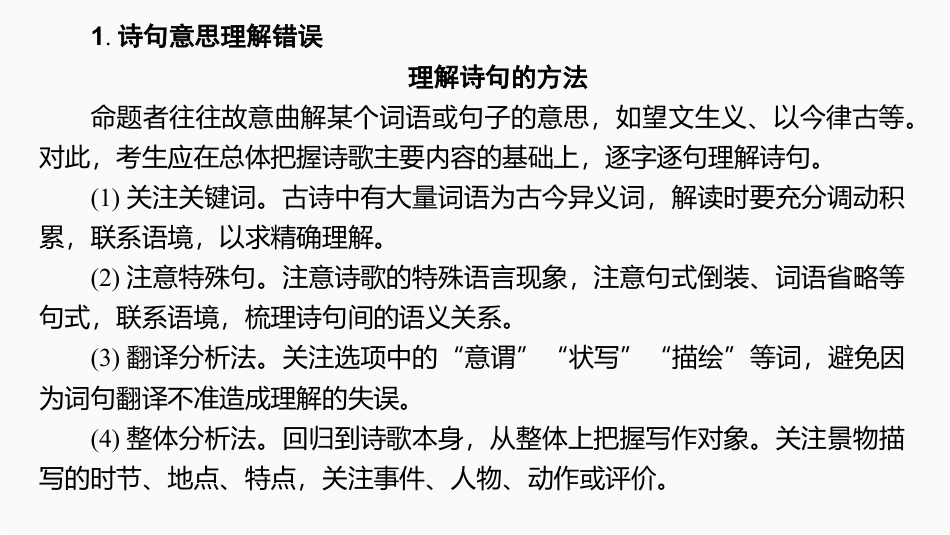 学案24命制错误选项的八大设误点——理解诗意,洞悉陷阱复习目标1.了解古代诗歌选择题常见设误类型。2.准确辨析选项。1.诗句意思理解错误理解诗句的方法命题者往往故意曲解某个词语或句子的意思,如望文生义、以今律古等。对此,考生应在总体把握诗歌主要内容的基础上,逐字逐句理解诗句。(1)关注关键词。古诗中有大量词语为古今异义词,解读时要充分调动积累,联系语境,以求精确理解。(2)注意特殊句。注意诗歌的特殊语言现象,注意句式倒装、词语省略等句式,联系语境,梳理诗句间的语义关系。(3)翻译分析法。关注选项中的“意谓”“状写”“描绘”等词,避免因为词句翻译不准造成理解的失误。(4)整体分析法。回归到诗歌本身,从整体上把握写作对象。关注景物描写的时节、地点、特点,关注事件、人物、动作或评价。[边练边悟]1.(2022·新高考Ⅰ卷)阅读下面这首宋诗,完成后面的题目。醉落魄·人日南山约应提刑懋之魏了翁无边春色。人情苦向南山觅。村村箫鼓家家笛。祈麦祈蚕,来趁元正七。翁前子后孙扶掖。商行贾坐农耕织。须知此意无今昔。会得为人,日日是人日。下列对这首词的理解和赏析,不正确的一项是()A.词人在人日约朋友去南山探春,但因年老体弱,感到此行会比较困难。B.在人日这天吹打奏乐,祈盼农桑丰收,反映了人们对美好生活的追求。C.这首词以朴实的笔触描绘当时农村的风俗景况,具有浓郁的生活气息。D.词人以议论入词,能够做到情由境出,情至论随,全词并无生硬之感。A解析A项,“因年老体弱,感到此行会比较困难”表述有误。原诗中,“人情苦向南山觅”中的“苦”字有“竭力”“执着”之意,表现人们对春色的喜爱。2.意象、意境分析错误命题人往往故意曲解诗歌中的意象,故意将诗歌创设的意境随意引申、任意拔高,考生往往因陶醉于生动优美的表述而忽略对杂糅在正确表述中的错误点的排查。正确分析意象、意境(1)深入体味写景句本身,敏锐感知并精确地表达其特点或氛围。(2)联系语境,着眼于整首诗的情感基调,切忌孤立地理解诗句。[边练边悟]2.(2022·北京)阅读下面诗歌,完成后面的题目。病柏①杜甫有柏生崇冈,童童状车盖。偃蹇龙虎姿,主当风云会。神明依正直,故老多再拜。岂知千年根,中路颜色坏②。出非不得地③,蟠据亦高大。岁寒忽无凭,日夜柯叶改。丹凤领九雏,哀鸣翔其外。鸱鸮志意满④,养子穿穴内。客从何乡来,伫立久吁怪。静求元精理⑤,浩荡难倚赖。【注】①此诗作于上元二年(761)秋,杜甫时居成都草堂。②中路:中途。③出:生长。④鸱鸮:猫头鹰。⑤元精理:事物根本的道理。下列对这首诗的理解与赏析,正确的一项是()A.诗人善用比兴手法,此诗中的病柏与刘禹锡“病树前头万木春”有相同的寄托。B.文似看山不喜平,此诗运用转笔形成了诗意的转折,其色调也从明朗转为黯淡。C.杜甫借物抒怀,用柏树的“蟠据亦高大”之姿隐喻了当时藩镇的龙盘虎踞之势。D.此诗情感复杂而深沉,既有对现实的不满,也有对未来的希望,可谓沉郁顿挫。C解析C项“隐喻了当时藩镇的龙盘虎踞之势”错误,该项对“病柏”的象征意义解说不当。“蟠据亦高大”形容的是衰时之柏,借以隐喻家国衰落。3.技巧手法分析错误命题者设置选项时,常常故意混淆表达方式、表现手法、修辞手法,如把动态说成静态,把比喻说成借代,将借景抒情说成直抒胸臆等。有时也把一些常见的诗歌常识弄混来设置错误选项。准确分析技巧手法(1)凡是有表达技巧的选项要特别关注,要慢读细品诗句,找到切实的依据,再进行判断。(2)切不可脱离诗句而只看选项,以命题人的理解代替自己的理解,以免被命题人诱导而选错答案。[边练边悟]3.阅读下面这首宋诗,完成后面的题目。送元范赴省①王十朋清峭霜天振羽翰,共观一鹗气轩轩。愿将拄腹书千卷,尽作忧时策万言。请系单于同太傅②,不阿人主异公孙③。龙头素是君家物,又见传呼贾状元④。【注】①赴省:赴京应试。②系单于:语出西汉终军“愿受长缨,必羁南越王而致之阙下”。太傅:贾谊,曾任长沙王、梁怀王太傅。③公孙:公孙弘,汉武帝时丞相。④自注“国朝贾黯、贾安宅皆状元。”下列对这首诗的理解和赏析,不正确的一项是()A.首联起笔不凡,有将元范...