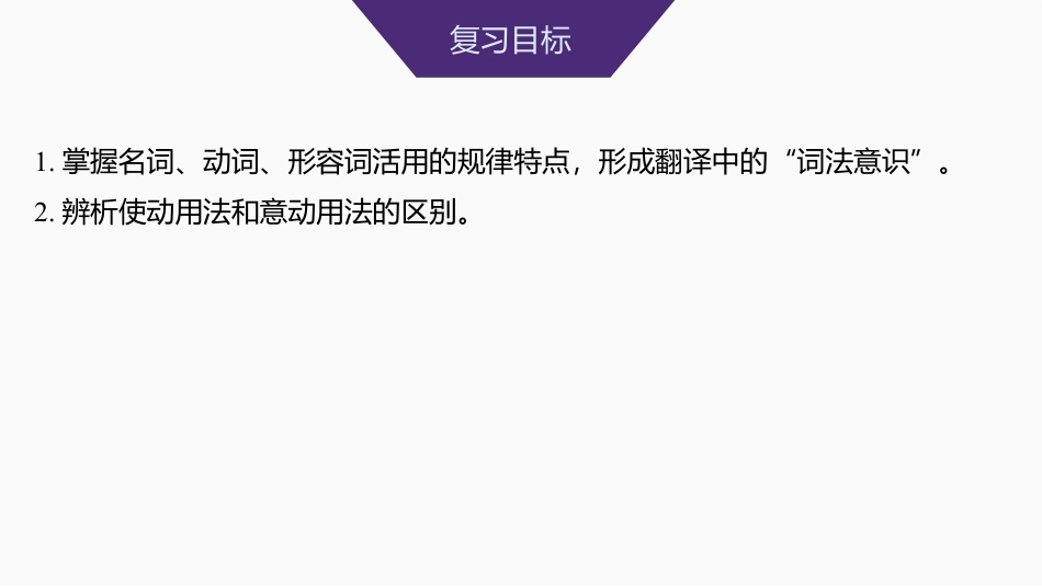 学案16理解活用实词的意义与用法——明确词性,分辨类型复习目标1.掌握名词、动词、形容词活用的规律特点,形成翻译中的“词法意识”。2.辨析使动用法和意动用法的区别。链接高考卷别文本中的活用实词具体活用类型命题特点2023新课标Ⅰ卷①吾群臣无有不骄侮之意者,唯赫子不失君臣之礼,是以先之。(翻译题中的)②遏奸劝善③援圣以自贤①先:意动用法,以……为先,放在前面。②善:形容词活用作名词,好的人或事。③贤:形容词使动用法,使……显得贤明。①实词的活用,既在翻译题中直接考查,也大量分布在阅读材料中,影响着考生对文本的理解把握;②活用现象多为意动、使动用法,名词作状语,名词动词形容词之间的活用。备考要熟悉类型,学会迁移,灵活判断。2023新课标Ⅱ卷①古人临阵出奇(翻译题中的)②仆与诸君缓辔而观之①奇:形容词活用作名词,奇兵、奇策。②缓:形容词活用作动词,放慢。2022新高考Ⅰ卷①夜见孟尝君②又北见燕王曰①夜:名词作状语,在夜晚。②北:名词作状语,到北边。卷别文本中的活用实词具体活用类型命题特点2022新高考Ⅱ卷吾欲北发幽州突骑名词作状语,向北边。①实词的活用,既在翻译题中直接考查,也大量分布在阅读材料中,影响着考生对文本的理解把握;②活用现象多为意动、使动用法,名词作状语,名词动词形容词之间的活用。备考要熟悉类型,学会迁移,灵活判断。2021新高考Ⅰ卷①君恶闻其过则忠化为佞,君乐闻直言则佞化为忠。(翻译题中的)②商旅野宿焉①忠、佞:都是形容词活用作名词,忠诚的人,奸伪的人。②野:名词作状语,在野外。2021新高考Ⅱ卷①纠合骁健②劝课农桑,抚纳新附①骁健:形容词活用作名词,骁勇健壮的人。②附:动词活用作名词,归附的人。名词的活用[教考衔接]1.指出下列各句中活用的名词,解释词义并说明其活用类型。(1)项伯亦拔剑起舞,常以身翼蔽沛公。(《鸿门宴》)________:________。类型:________。(2)名之者谁?太守自谓也。(《醉翁亭记》)________:________。类型:________。(3)却宾客以业诸侯。(《谏逐客书》)________:________。类型:________。(4)侣鱼虾而友麋鹿。(《赤壁赋》)________:________。类型:________。________:________。类型:________。答案(1)翼像鸟张开翅膀一样名词作状语(2)名命名名词作动词(3)业使……成就霸业名词的使动用法(4)侣把……当作伴侣名词的意动用法友把……当作朋友名词的意动用法动词的活用[教考衔接]2.指出下列各句中活用的动词,解释词义并说明其活用类型。(1)追亡逐北。(《过秦论》)________:________。类型:________。(2)李牧连却之。(《六国论》)________:________。类型:________。(3)沛公旦日从百余骑来见项王。(《鸿门宴》)________:________。类型:________。(4)后人哀之而不鉴之。(《阿房宫赋》)________:________。类型:________。答案(1)亡逃跑的人动词作名词(2)却使……退却,击退不及物动词的使动用法(3)从使……跟从,带领及物动词的使动用法(4)哀为……哀叹动词的为动用法形容词的活用[教考衔接]3.指出下列各句中活用的形容词,解释词义并说明其活用类型。(1)而刀刃者无厚。(《庖丁解牛》)________:________。类型:________。(2)善万物之得时。(《归去来兮辞并序》)________:________。类型:________。(3)抑王兴甲兵,危士臣。(《齐桓晋文之事》)________:________。类型:________。(4)单于壮其节。(《苏武传》)________:________。类型:________。答案(1)厚厚度形容词用作名词(2)善羡慕形容词用作动词(3)危使……危险,危害形容词的使动用法(4)壮认为……豪壮形容词的意动用法[模拟训练]一、词类活用的翻译1.(2023·新课标Ⅱ卷)太宗曰:“古人临阵出奇,攻人不意,斯亦相变之法乎?”靖曰:“前代战斗,多是以小术而胜无术,以片善而胜无善,斯安足以论兵法也?若谢玄之破苻坚,非谢玄之善也,盖苻坚之不善也。”(节选自《唐太宗李卫公问对》)译文:____________________________________________________________【译文】古人临阵时出奇兵,攻击敌人意想不到之处,这也是变化的方法吗?【词类活用】奇:形容词用作名词,奇兵。2.(2...