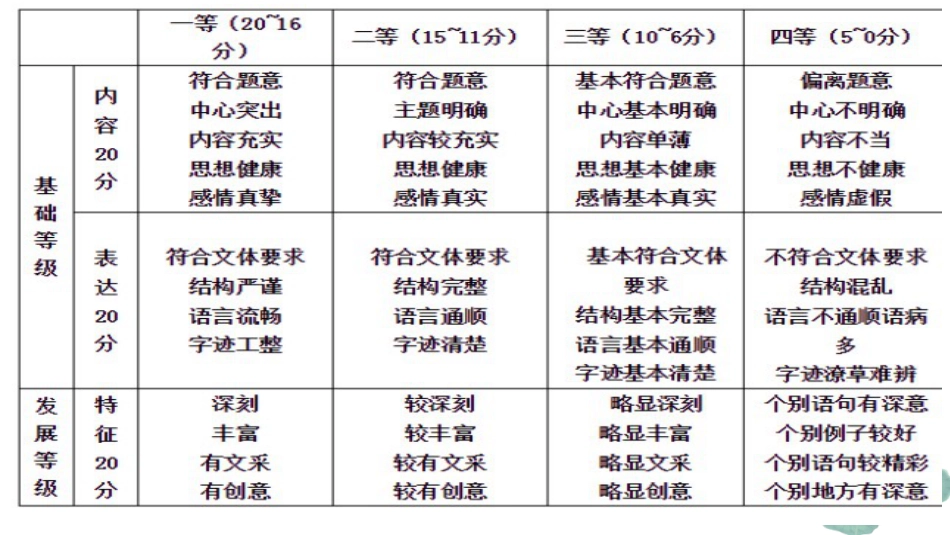 提高“言”值——跟着人民日高分句报学写子古典导入新课标卷作文评分标准中,“发展等级”包括深刻、丰富、有文采、有创意,共20分。这四项只要有一项突出,就可以打分20分。今天我们就跟着人民日报来学习如何提高“言”值,让你的考场作文有文采。古典你写的:创新就是要敢想敢做,敢于失败。人民日报写的:创新之花总是盛开在勇于创新、鼓励成功、宽容失败的土壤之上。——摘自:《做创新的引领者、推动者》古典你写的:美好的未来等着我们去奋斗、去创造。人民日报写的:新时代的中国天高海阔、气象万千,未来属于奋斗者、攀登者、实干家。——摘自:《“在新征程上创造更加美好的明天》古典你写的:过程越艰难,就越能享受成功的欣喜。人民日报写的:路途越是坎坷,抵达就越显珍贵。——摘自:《在新征程上创造更加美好的明天》古典你写的:实现绿色可持续发展,才是为了人类的未来做贡献。人民日报写的:只有把绿色发展的底色铺好,才会有今后发展的高歌猛进。——摘自:《深入推进生态文明建设和绿色低碳发展》古典你写的:家和万事兴,“小家”好了,“大家”才能更好。人民日报写的:家庭小账本,连着民生大账本。——摘自:《增加城乡居民收入》古典你写的:物流行业方便了大家的生活,也创造了巨大的经济价值。人民日报写的:物流业一头连着生产、一头连着消费,繁荣着商品市场,活跃着创新创造。——摘自:《“小包裹”映射活力中国》古典你写的:从什么时候努力都不晚。人民日报写的:奋斗是一首永不过时的歌谣。——摘自:《摘得属于自己的“桂冠”》古典你写的:让乡土人才为乡村振兴而努力。人民日报写的:广袤田野蕴藏着无限希望,乡土人才就是让希望成为现实的探路人。——摘自:《“头雁”领飞,“雁群”高飞》古典你写的:新年新气象,每个人都在为自己的梦想而努力。人民日报写的:流动的中国活力十足,奋跃而上;忙碌的身影干劲满满,马不停蹄。——摘自:《向着春天进发朝着梦想奔跑》古典你写的:勤俭节约是中华民族的传统美德。人民日报写的:丰收不是浪费的理由,富足不是挥霍的底气。——摘自:《艰苦奋斗、勤俭节约的思想永远不能丢》古典你写的:科创改变生活,影响着每一个人。人民日报写的:科创合作犹如投向湖面的石子,激荡起层层涟漪。——摘自:《架起“连心桥”,走好创新路》古典你写的:茶产业可以带动当地百姓脱贫致富。人民日报写的:一叶好茶,绿了千千岭,富了万万家。——摘自:《茶香飘千里绿叶富万家》古典你写的:旅游可以开拓视野。人民日报写的:步履不息,旅游拓展着人生的宽度。——摘自:《银发旅游市场蕴含巨大潜力》古典你写的:各行各业的人们在各自岗位上闪闪发光。人民日报写的:在广袤田野、在建设工地、在创业平台、在实验站房,人们正用不懈奋斗、担当作为回馈时光、不负梦想。——摘自:《迎着春风,实干前行》古典你写的:时间会给努力的人一份满意的答卷。人民日报写的:时间中藏着怎样的美好、酝酿怎样的奇迹,每一个奋斗者都将是亲历者、见证者。——摘自:《迎着春风,实干前行》古典你写的:时间如流水一般流逝,一去不复返。人民日报写的:岁月不居,时节如流。——摘自:《立春绘“春牛”》古典敬请指正
